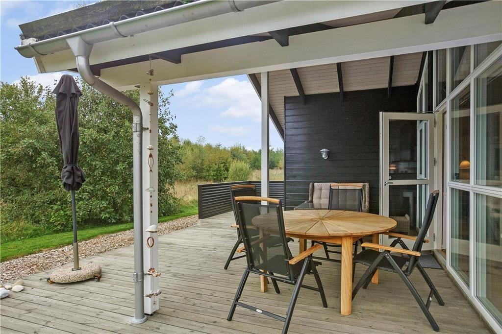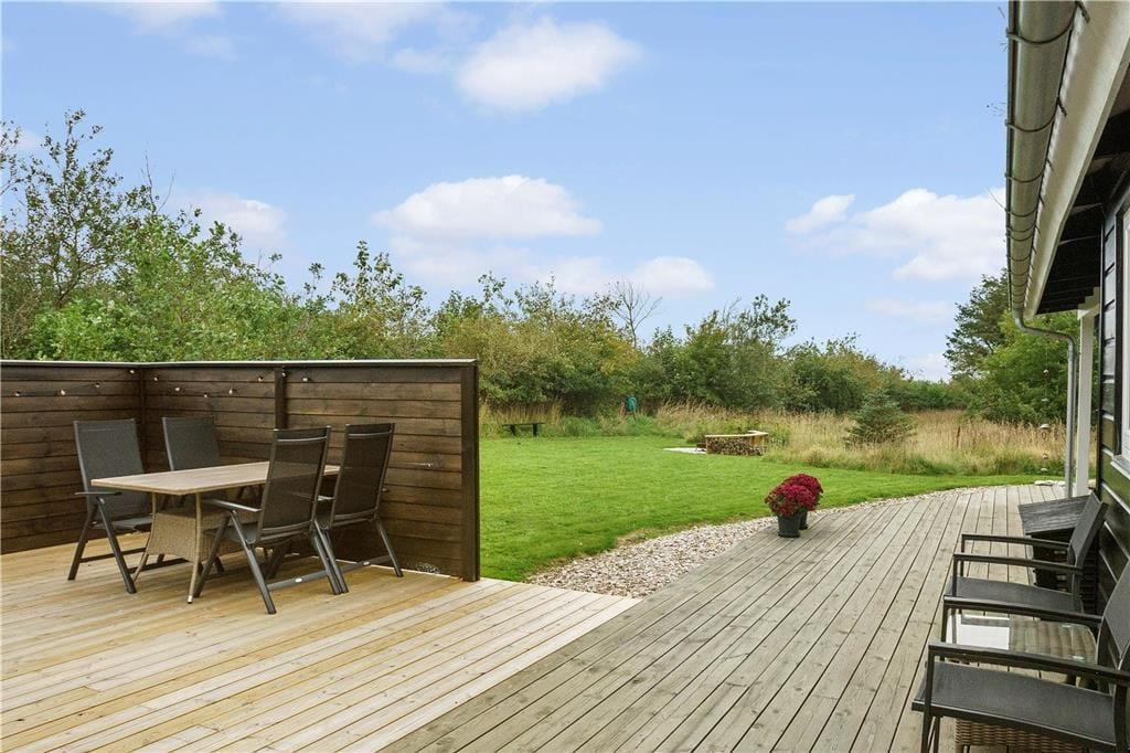 Huset er på flere sider omgivet af træer, som er med til at skabe læ og gør, at man kan opholde sig ugeneret på terrasserne som vender væk fra vejen. Den store og overdækkede terrasse, med udgang fra stuen, giver god mulighed for at nyde den omkringliggende natur, der byder på et rigt fugle- og dyreliv, og det er oplagt at bruge mange timer her med hygge, grill og samvær. Der hører naturligvis havemøbler, liggestole og grill med til huset.