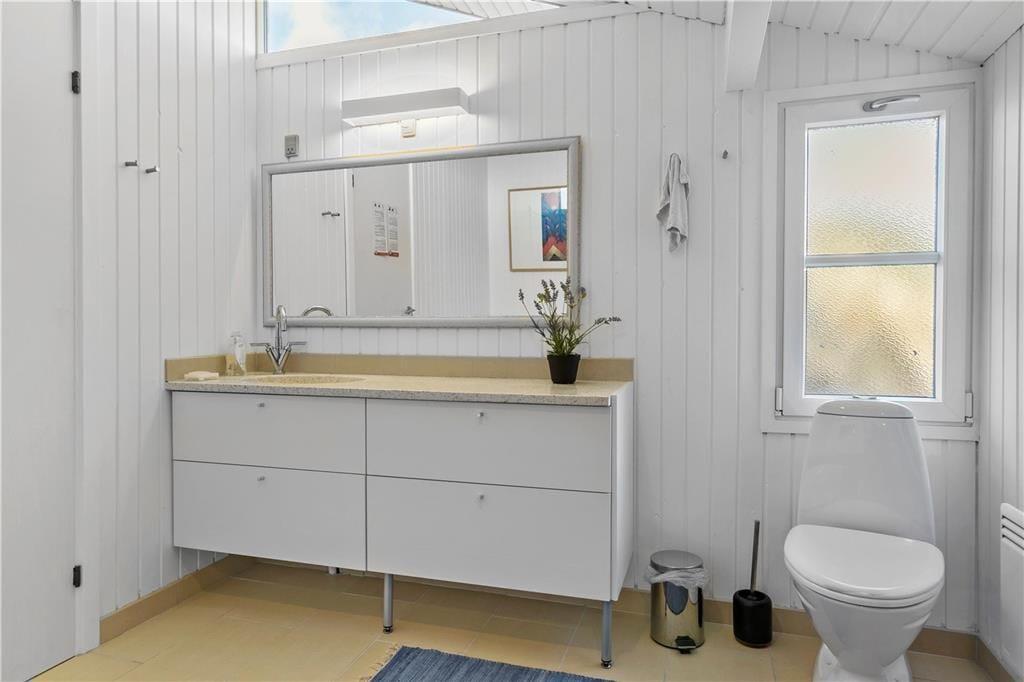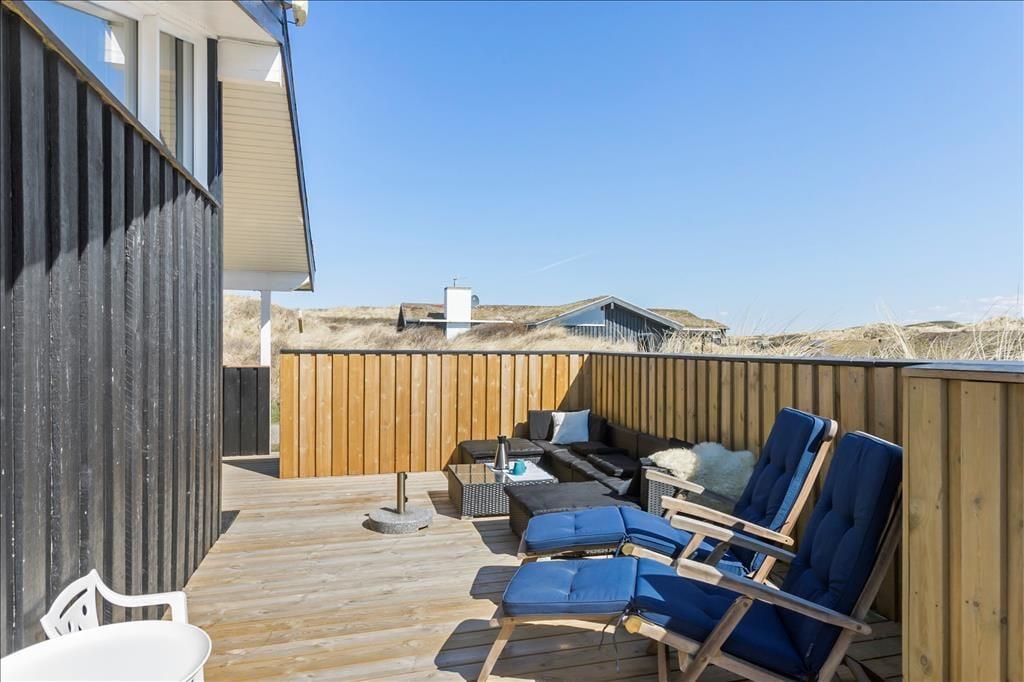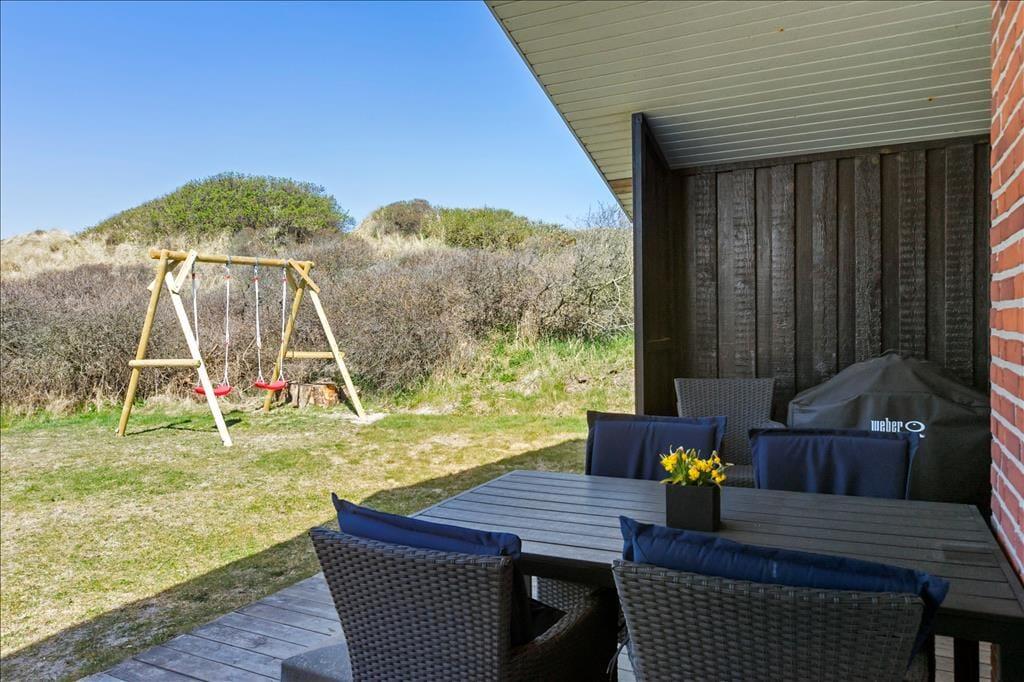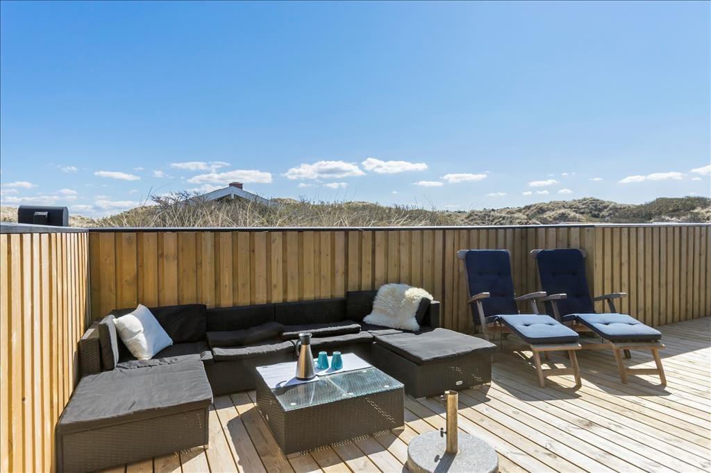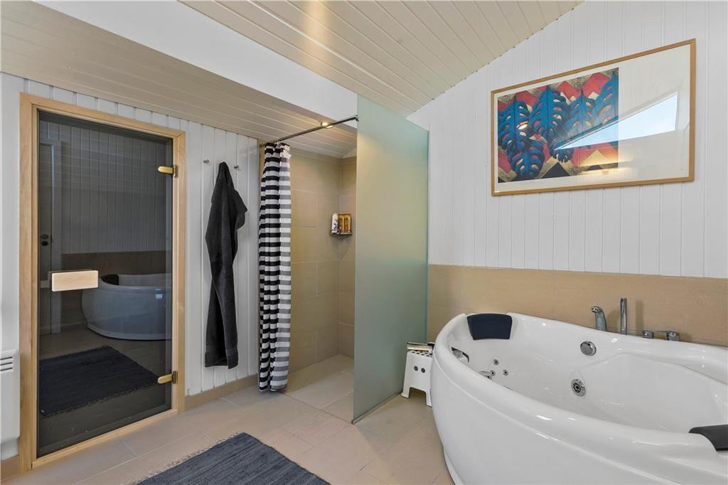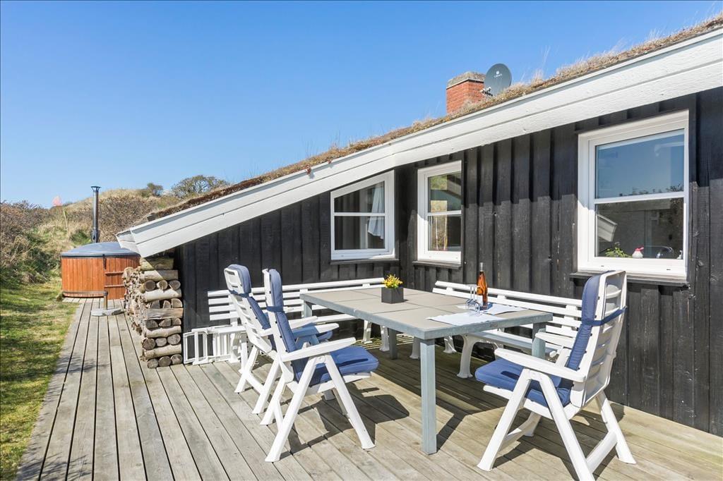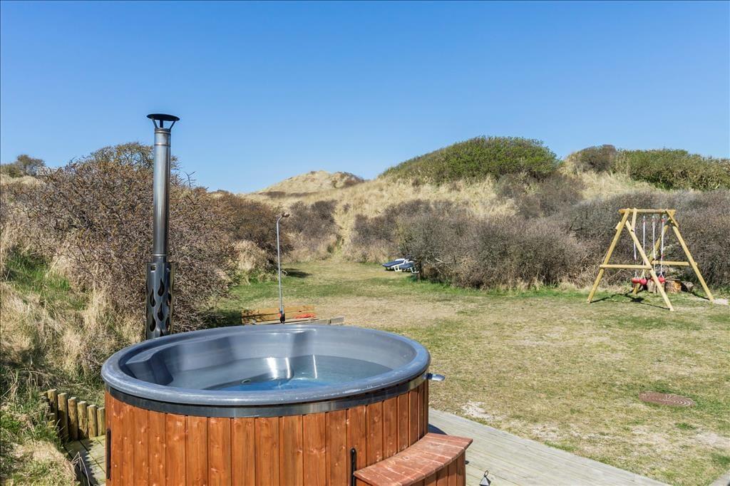 Udenfor venter en oase af ro og natur. Den store terrasse er udstyret med et vildmarksbad, som indbyder til afslapning under åben himmel, mens du nyder den friske luft og den omkringliggende natur. Det er den perfekte måde at afslutte en dag med strandbesøg eller vandreture i området. Den rummelige terrasse giver også mulighed for at samles til måltider på sommerdage, og den rolige beliggenhed sikrer, at du kan nyde dine måltider i fuldkommen fred. Her kan du tage det hele ind og virkelig mærke, hvordan stressen fra hverdagen forsvinder.