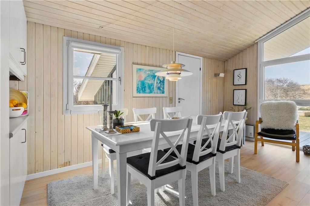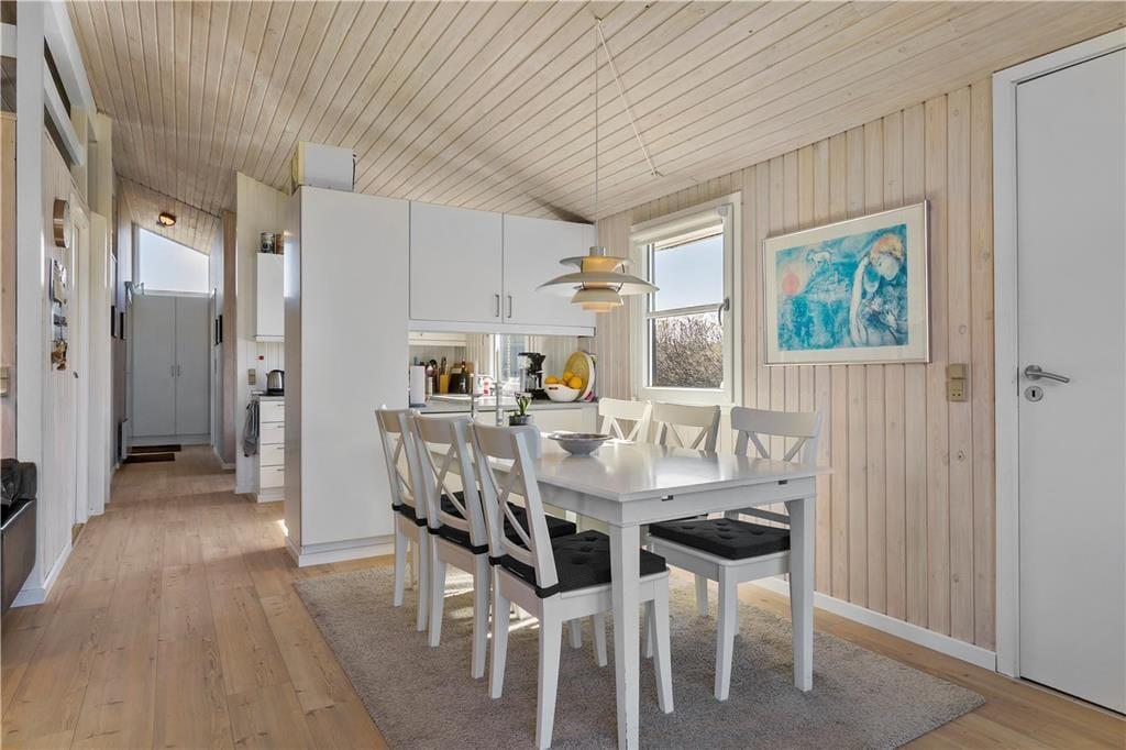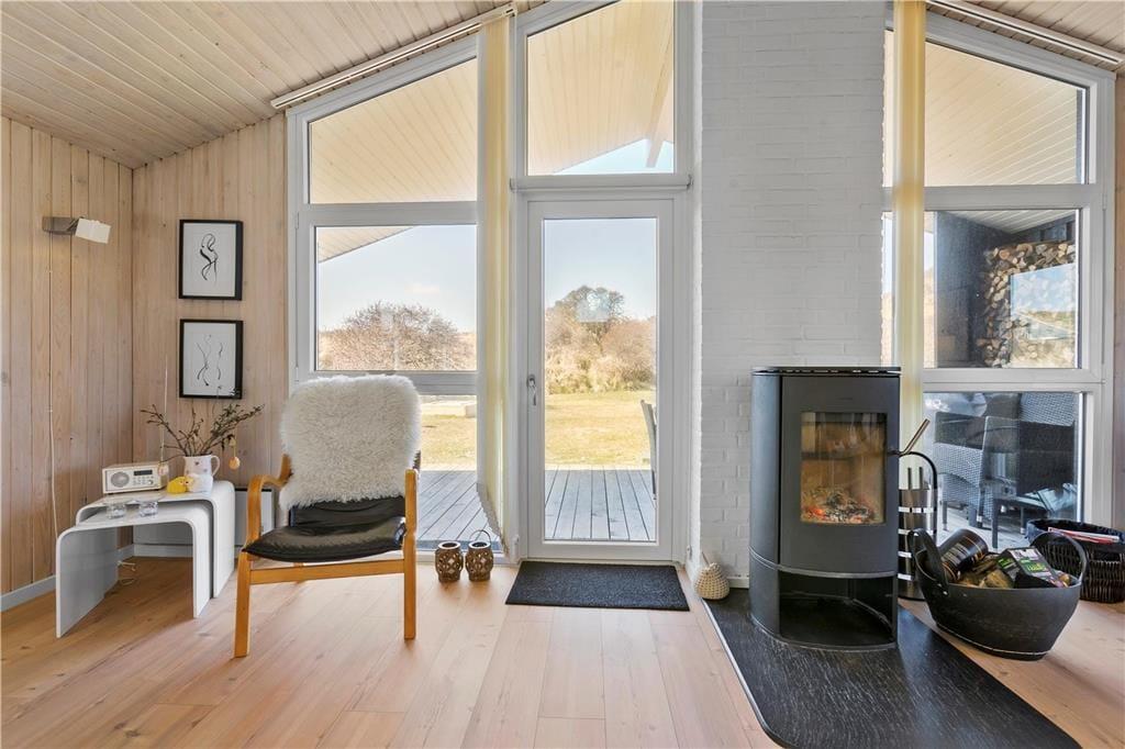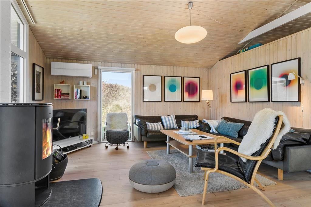 Når du træder indenfor i dette charmerende sommerhus, mødes du af en varm og indbydende atmosfære. Stuen er et perfekt sted at samles med dem, du holder af, hvor den knitrende brændeovn skaber en hyggelig stemning på de køligere dage. De store vinduespartier bringer naturen indenfor, og lyset fylder rummet med en behagelig varme. Det åbne køkken er ideelt til fælles madlavning, og det smagfulde møblement giver en følelse af luksus og komfort. Fra stuen er der direkte adgang til den skønne terrasse, hvor du kan fortsætte ferien i fredelige omgivelser.