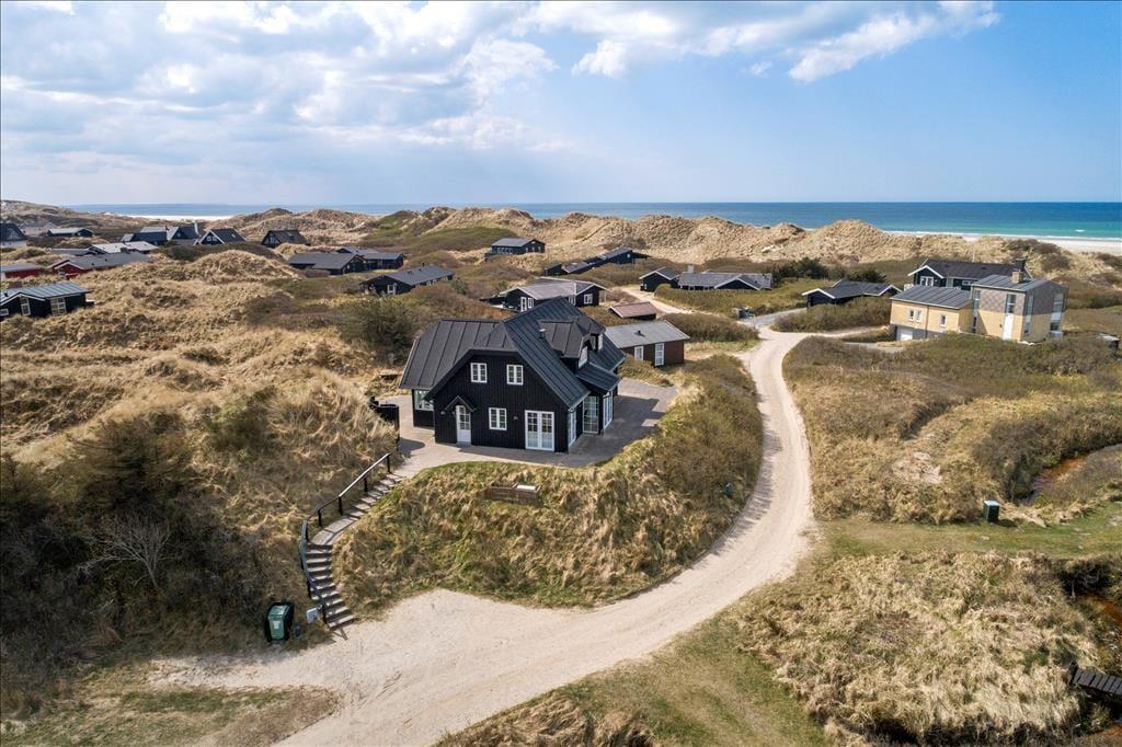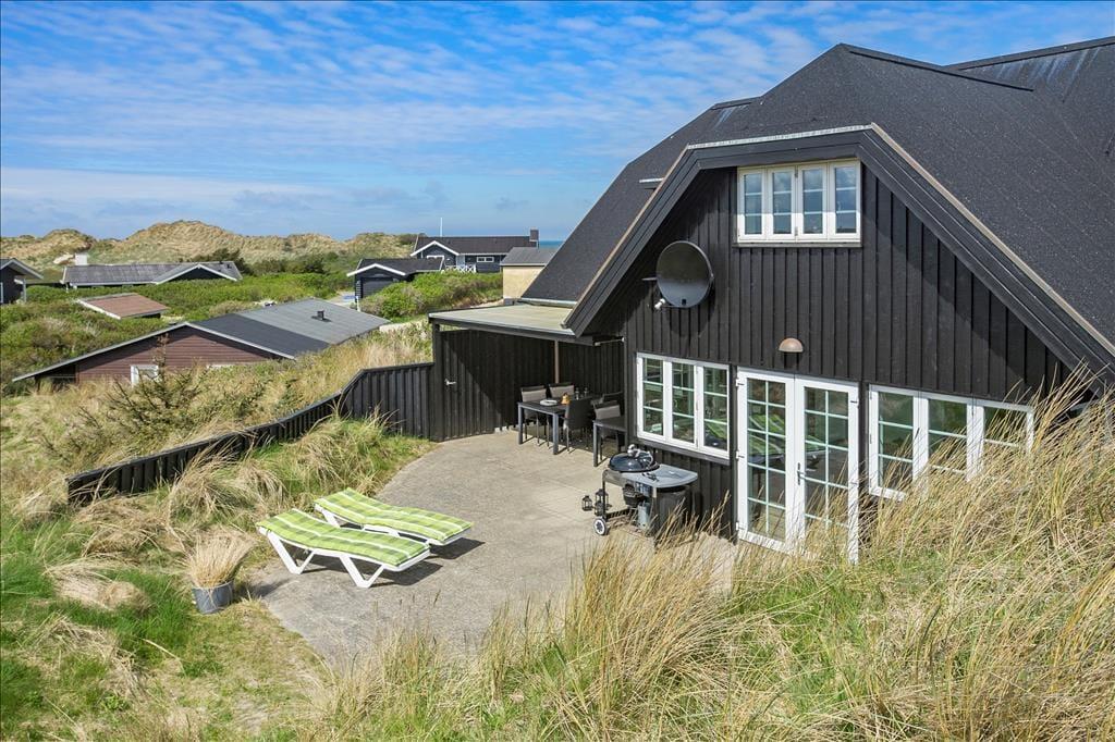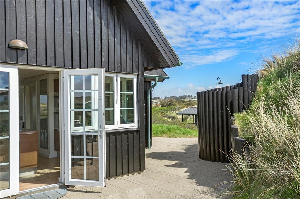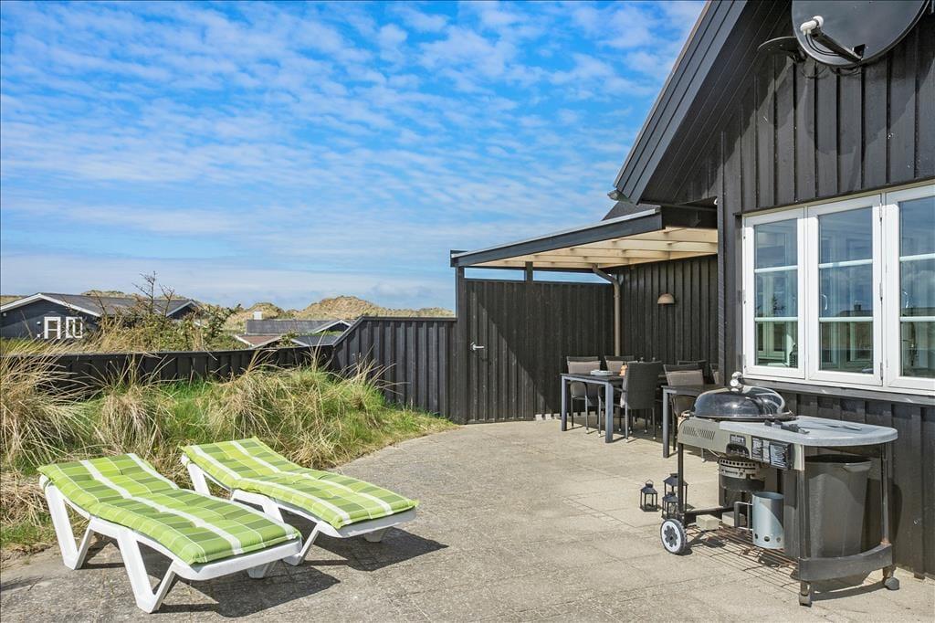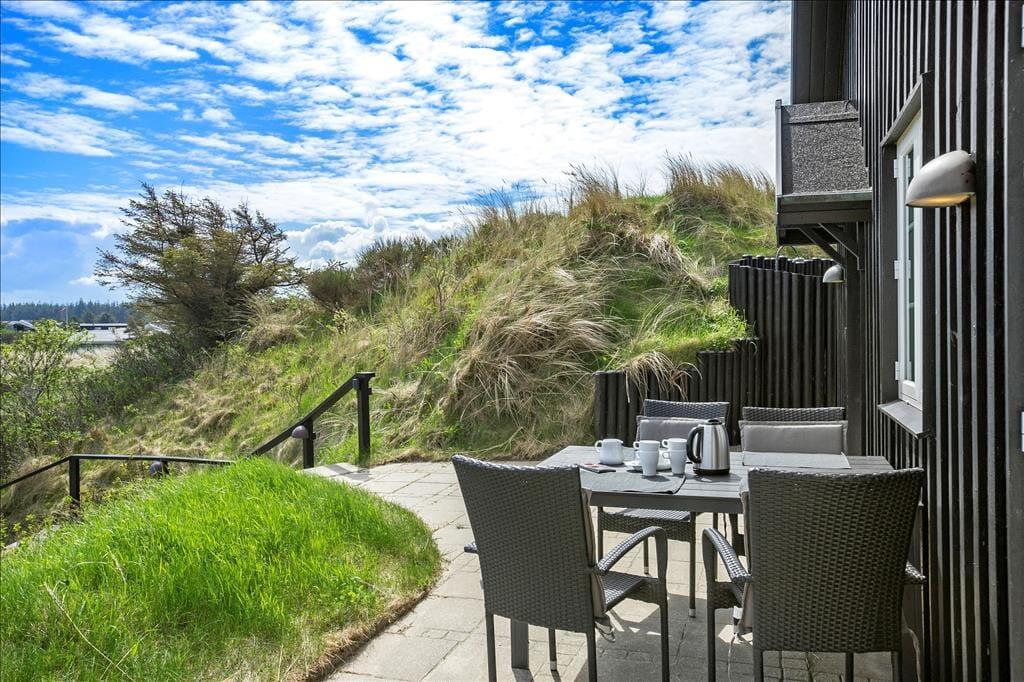 Når du træder ud på den store terrasse, kan du virkelig mærke den friske luft og den fredfyldte natur omkring dig. Den rummelige terrasse er det perfekte sted at nyde solens stråler, og med havudsigten lige for øjnene, får du den ultimative feriefølelse. Terrasseområdet er designet til både afslapning og aktiviteter, og her kan du nyde udendørs måltider på en varm sommerdag eller slappe af med en god bog, mens du hører bølgernes brusen i baggrunden. Den smukke naturgrund giver mulighed for lange gåture i det grønne, og du er aldrig langt fra stranden, hvis du ønsker at dyppe tæerne i Vesterhavet.