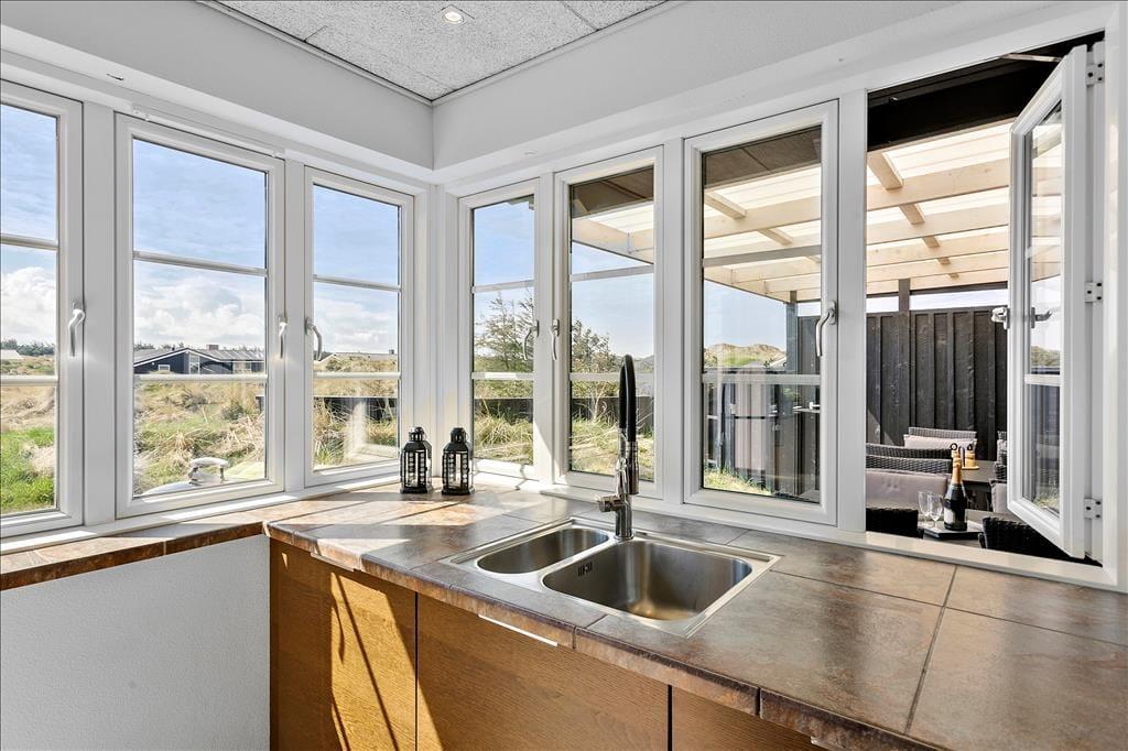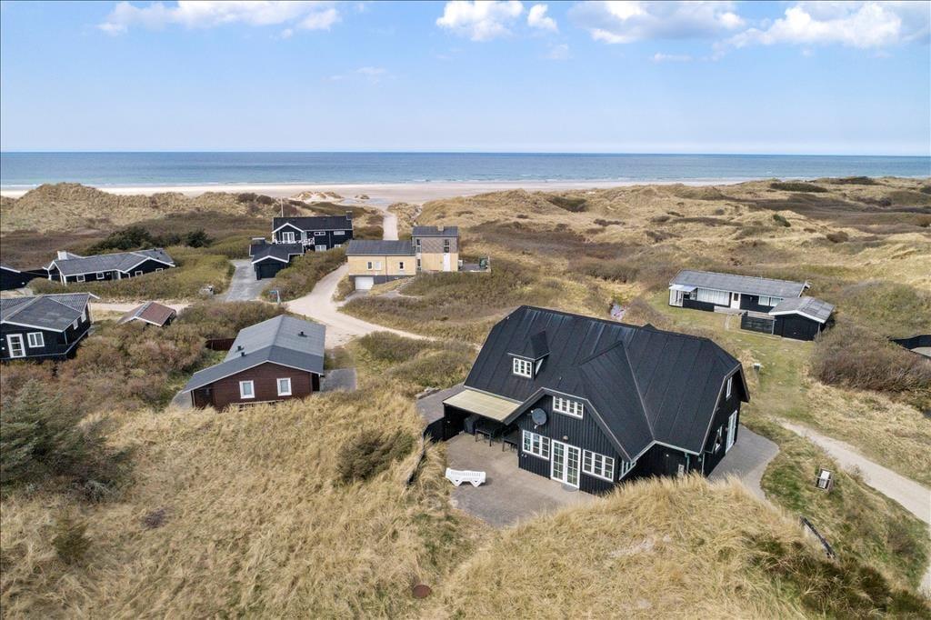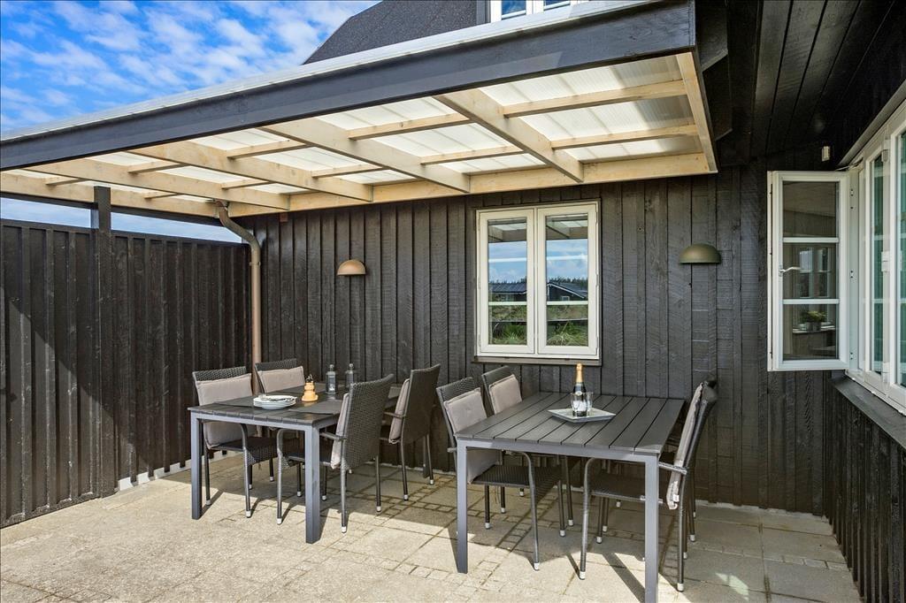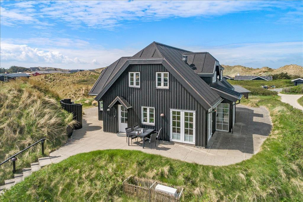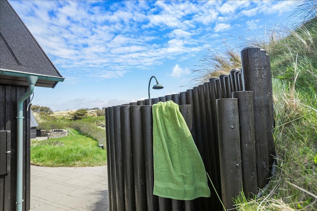 Når du træder ud på den store terrasse, kan du virkelig mærke den friske luft og den fredfyldte natur omkring dig. Den rummelige terrasse er det perfekte sted at nyde solens stråler, og med havudsigten lige for øjnene, får du den ultimative feriefølelse. Terrasseområdet er designet til både afslapning og aktiviteter, og her kan du nyde udendørs måltider på en varm sommerdag eller slappe af med en god bog, mens du hører bølgernes brusen i baggrunden. Den smukke naturgrund giver mulighed for lange gåture i det grønne, og du er aldrig langt fra stranden, hvis du ønsker at dyppe tæerne i Vesterhavet.