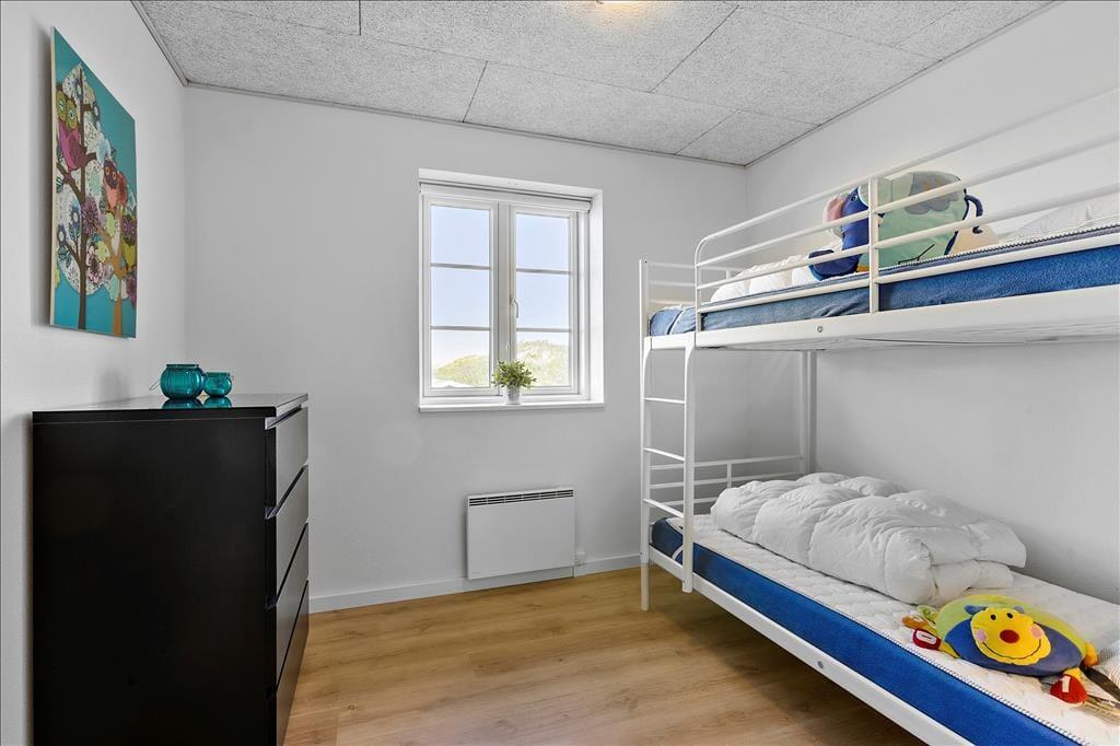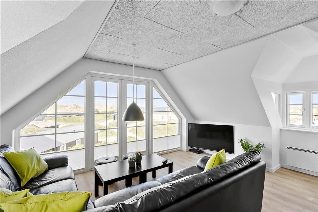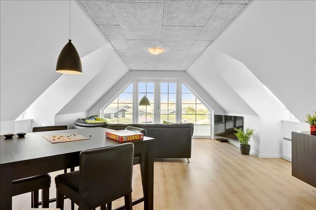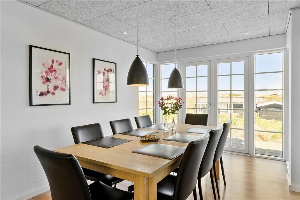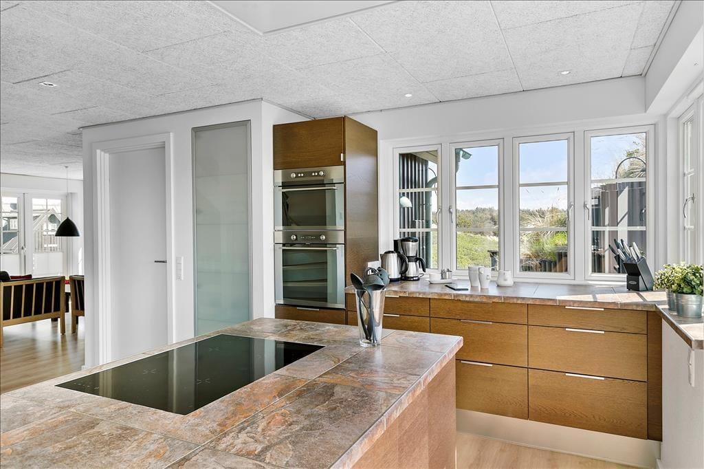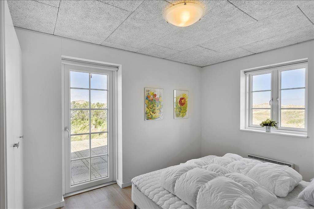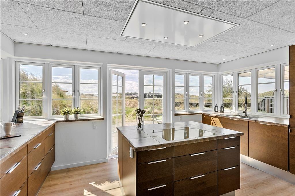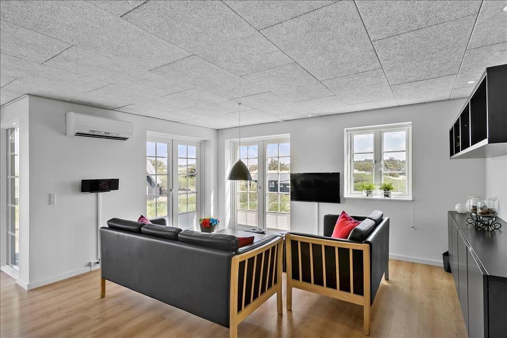 Indenfor møder dig et lyst og åbent miljø, hvor store vinduespartier lukker naturens skønhed ind og giver dig en vidunderlig havudsigt fra næsten alle rum. Køkkenet er både funktionelt og flot, med godt lysindfald og moderne faciliteter, der gør madlavningen til en fornøjelse. Her kan du samle familien til måltider og hygge, eller måske tage en pause foran brændeovnen og lade feriestemningen sænke sig. De to badeværelser er luksuriøse og byder på både sauna og spabad – perfekt til at forkæle dig selv og slappe af efter en aktiv dag ved stranden.