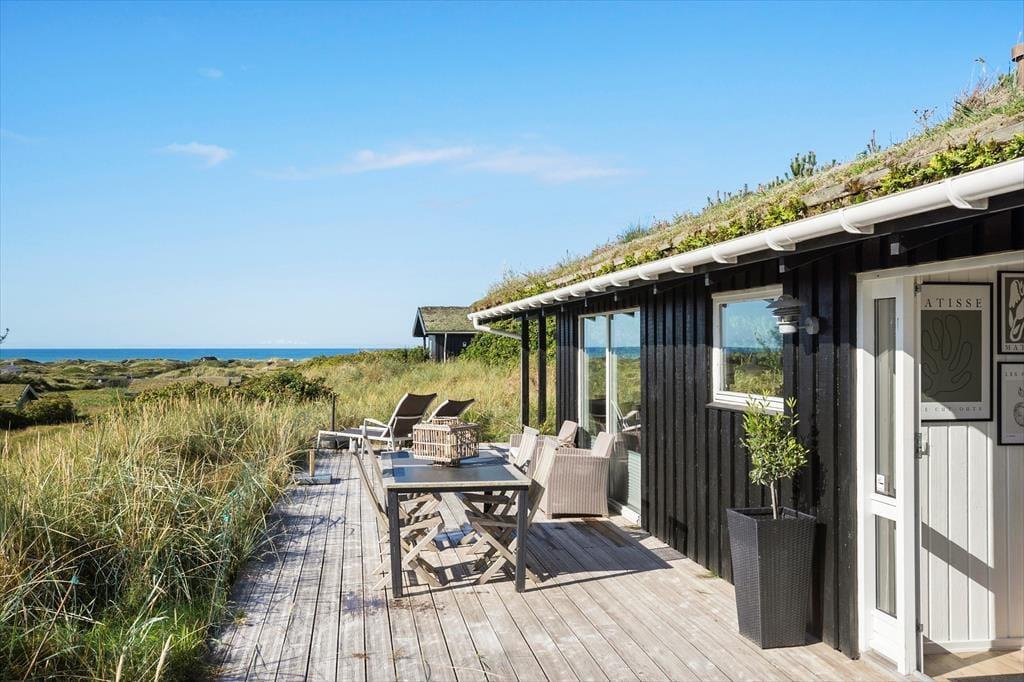 Fra stuen har du direkte adgang til den store terrasse, hvor du kan nyde solen og den fantastiske havudsigt. Terrasseområdet er den perfekte oase til at slappe af og tage en pause fra hverdagen, og den lyse, åbne atmosfære gør det muligt at nyde både morgenkaffen og middagen under åben himmel. Den skønne naturgrund omkring sommerhuset giver dig masser af plads til at udforske og nyde den friske luft, og du er kun få skridt fra stranden, hvor du kan tage en forfriskende dukkert i Vesterhavet. Det er et ideelt sted at lade tankerne flyve og finde ro.