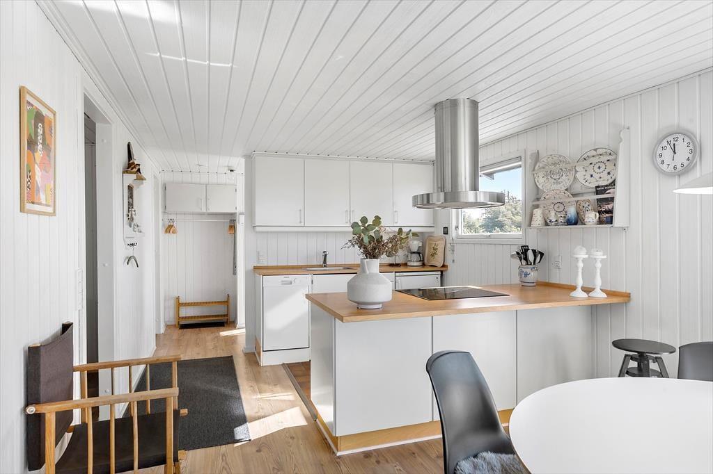 Når du træder ind i sommerhuset, bliver du mødt af en indbydende og lys stue, hvor de store vinduespartier giver dig en helt unik udsigt til havet. Den varme brændeovn bidrager til en hyggelig stemning og gør det til det perfekte sted at tilbringe de kølige aftener. Stuen er ideel til både afslapning og samvær med familie og venner, og du vil hurtigt føle dig hjemme i den dejlige atmosfære. Uanset om du vil sidde og nyde udsigten, spille brætspil eller læse en god bog, er der plads til det hele. Sommerhuset emmer af en helt særlig sommerhusstemning, hvor du kan lade op og nyde de enkle glæder ved livet.