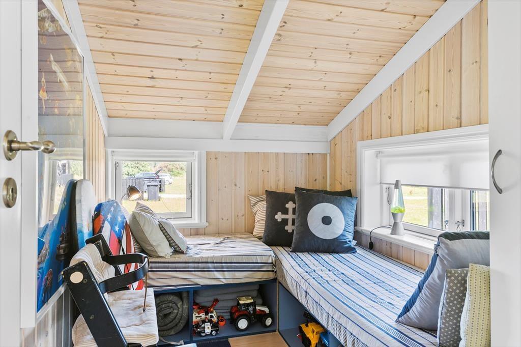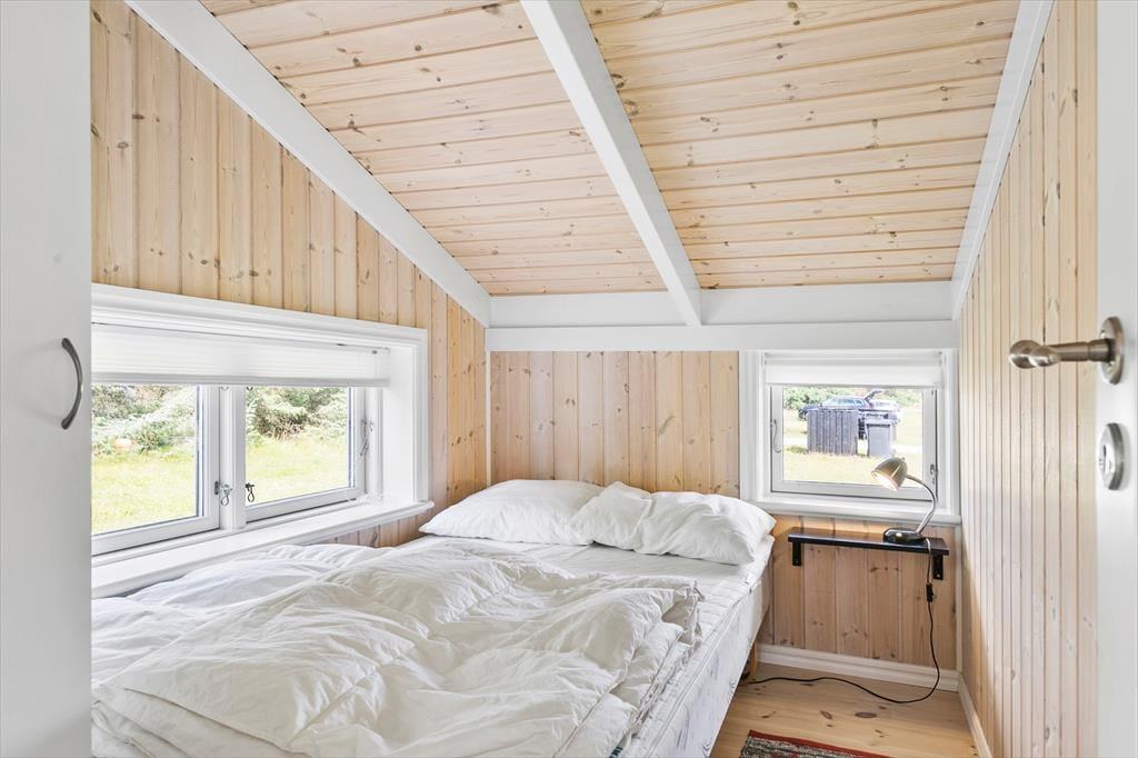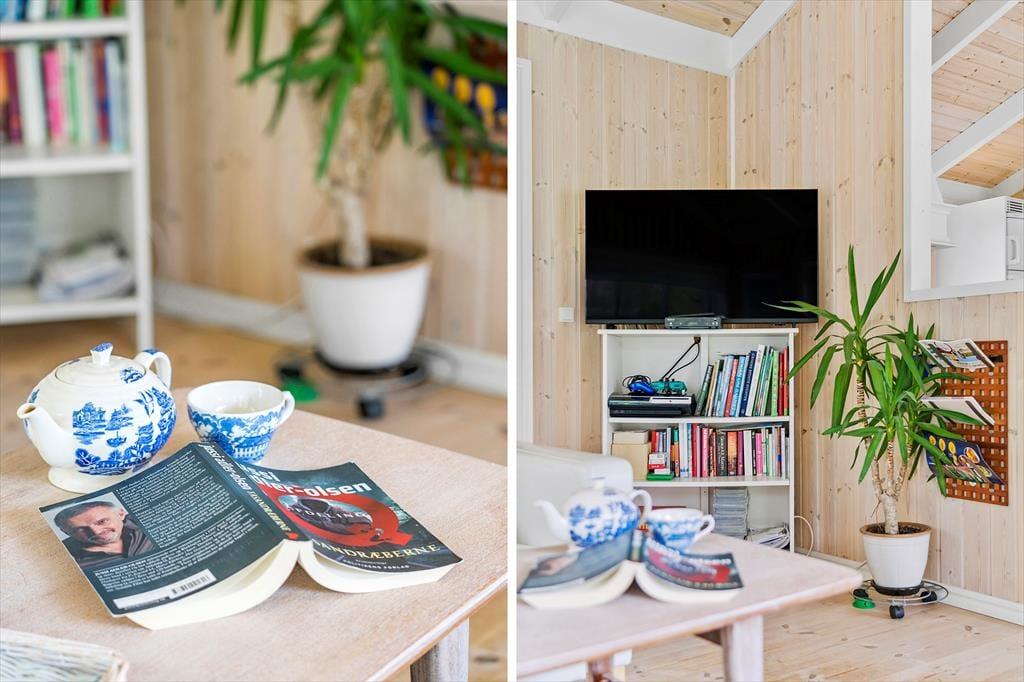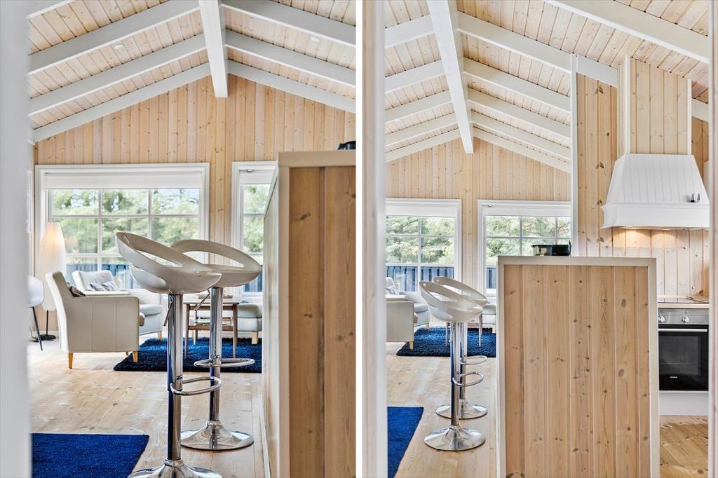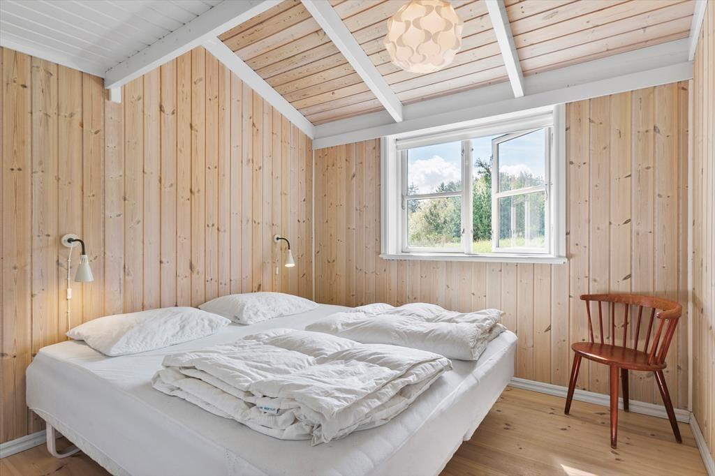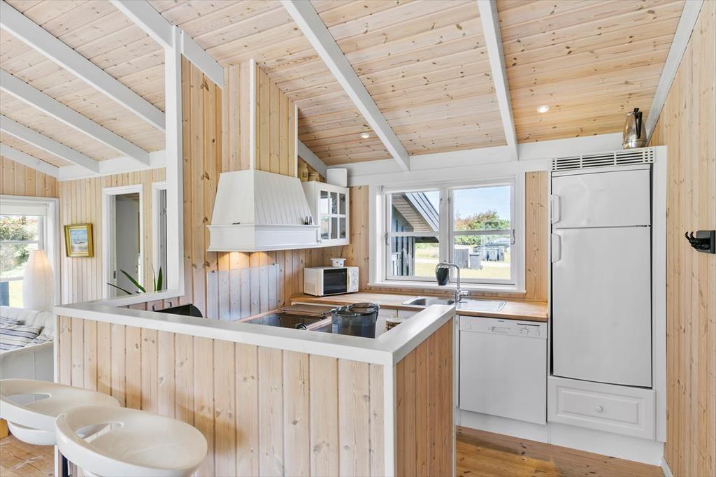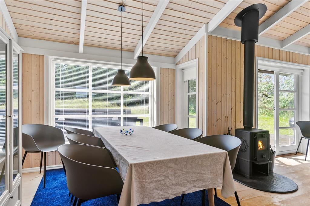 Indenfor i sommerhuset bliver I mødt af en varm og indbydende atmosfære. Stuen er hyggeligt indrettet med en brændeovn, hvor I kan samles om aftenen og nyde en god bog eller et brætspil, mens flammerne knitrer i baggrunden. Køkken-alrummet er husets hjerte – her er masser af plads til både madlavning og hyggelige måltider. Det er ideelt til familier, der ønsker at tilbringe tid sammen i et åbent og socialt rum. Uanset om I er ved at forberede en god middag eller nyder en morgenkaffe, giver dette rum en helt særlig følelse af sammenhold og hjemlig hygge.