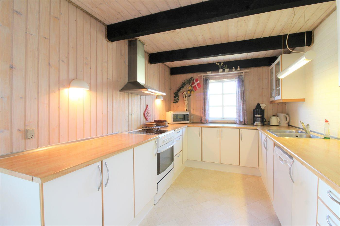 Køkkenet er udstyret med 1 køleskab. Der er 4 keramiske kogeplader, bageovn samt opvaskemaskine.