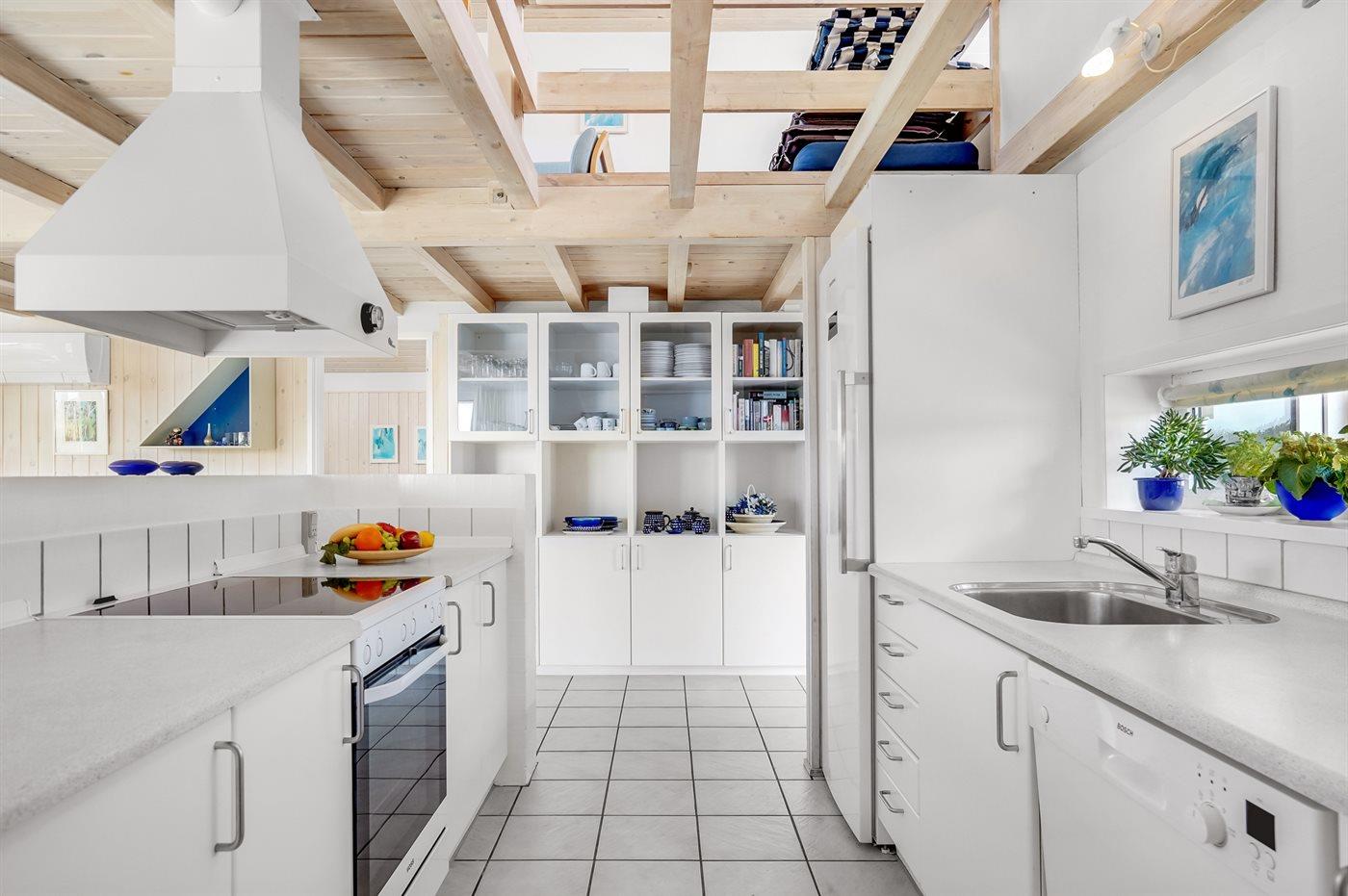 Køkkenet er udstyret med 1 køleskab. Der er 4 elkogeplader, bageovn, mikrobølgeovn samt opvaskemaskine Ekstra fryser findes i redskabsrum og ekstra køleskab står i garagen.