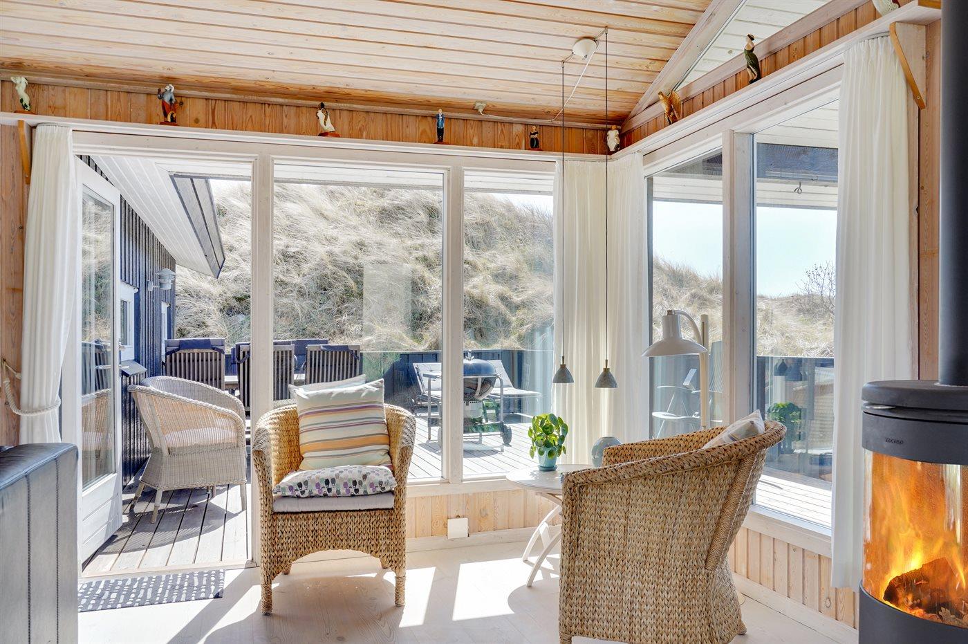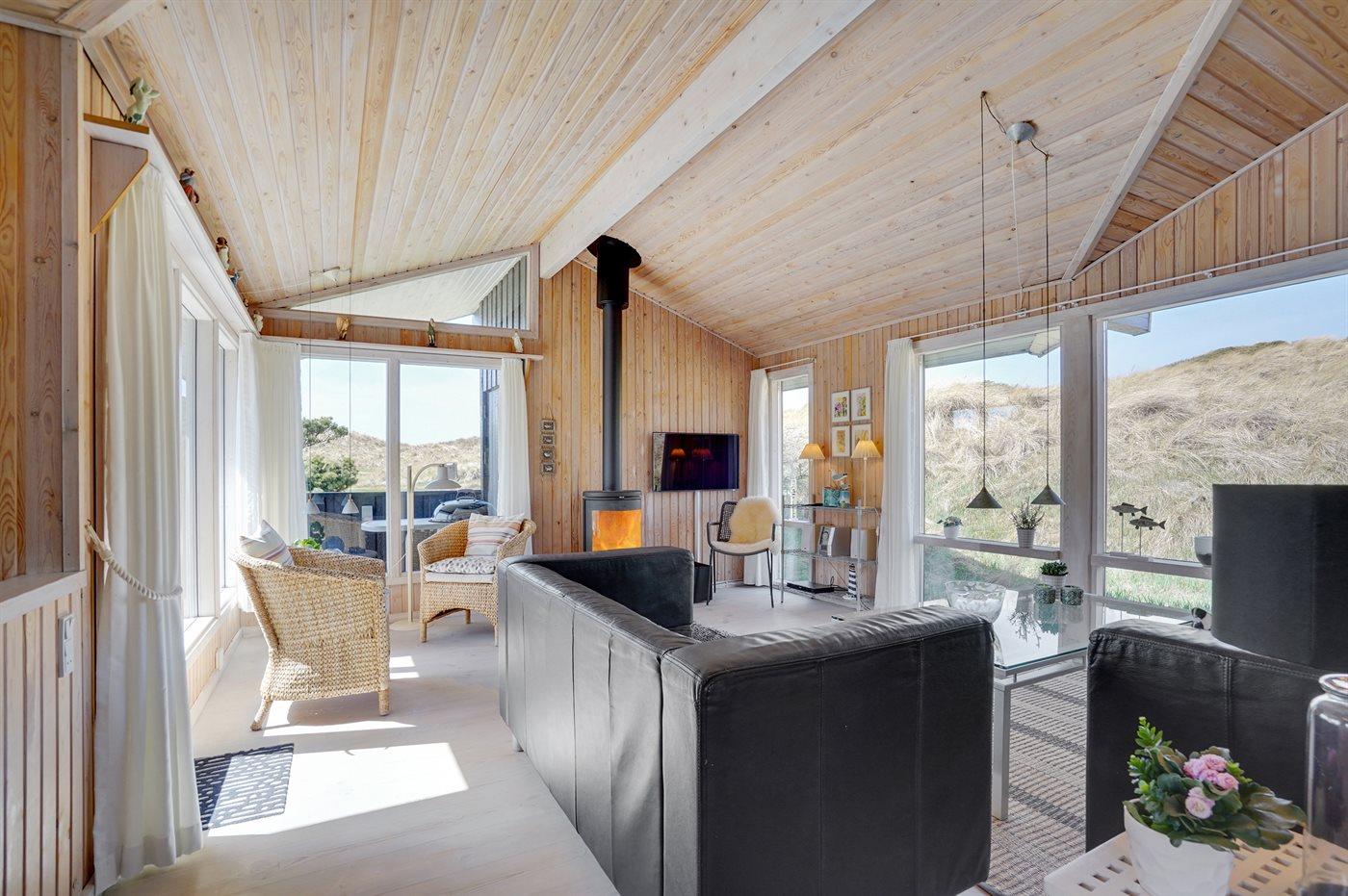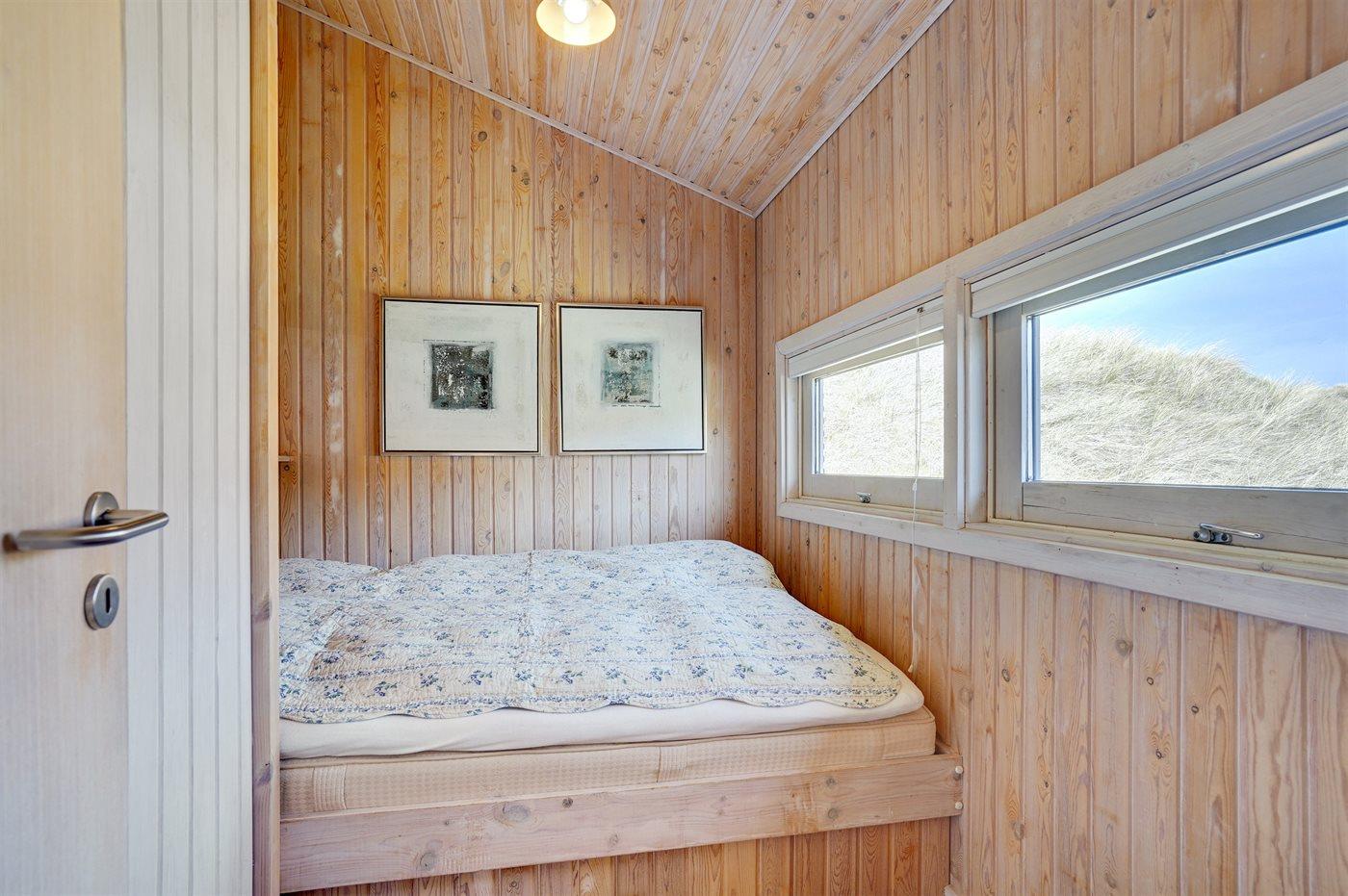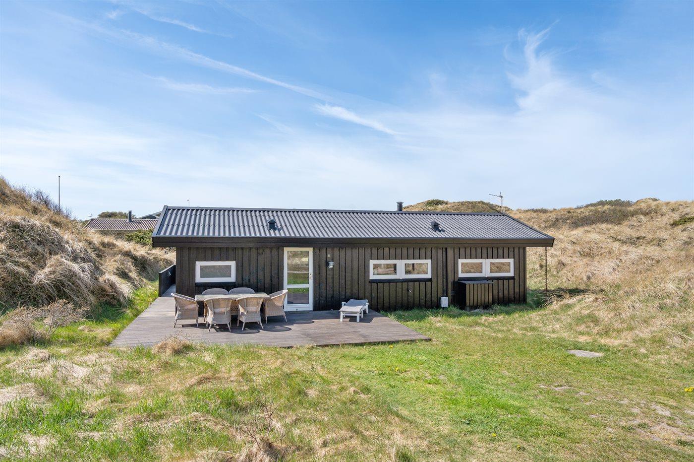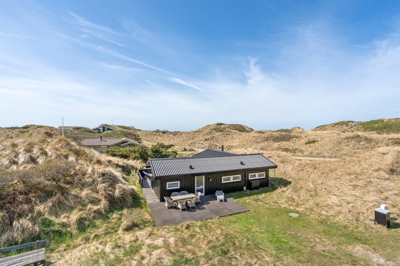 Kun 200 m fra den dejlige sandstrand ved Vesterhavet ligger dette hyggelige og smukt indrettede sommerhus i træ. Huset er bygget i 1984 og delvist renoveret i 2001 og ligger på en stor, kuperet naturgrund med havudsigt fra grunden. Til huset hører terrasseareal med havemøbler og gode læmuligheder. Der er installeret energibesparende varmepumpe. Badeværelse med gulvvarme og bruser. Køkkenet, som bl.a. er udstyret med fryser, opvaskemaskine, mikrobølgeovn og komfur med keramiske kogeplader, er kombineret med spiseafdelingen og opholdsstuen. Opholdsstuen er pænt møbleret og indeholder brændeovn, DVD-afspiller, TV med parabol (digital) og stereoanlæg med CD-afspiller. Huset har 3 soverum; 2 med 1 dobbeltseng og 1 med køjeseng. Af yderligere udstyr kan gratis, trådløs internetforbindelse (computer skal medbringes), vaskemaskine og høj barnestol nævnes. Et særdeles velbeliggende sommerhus!