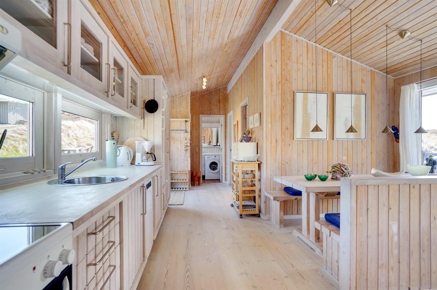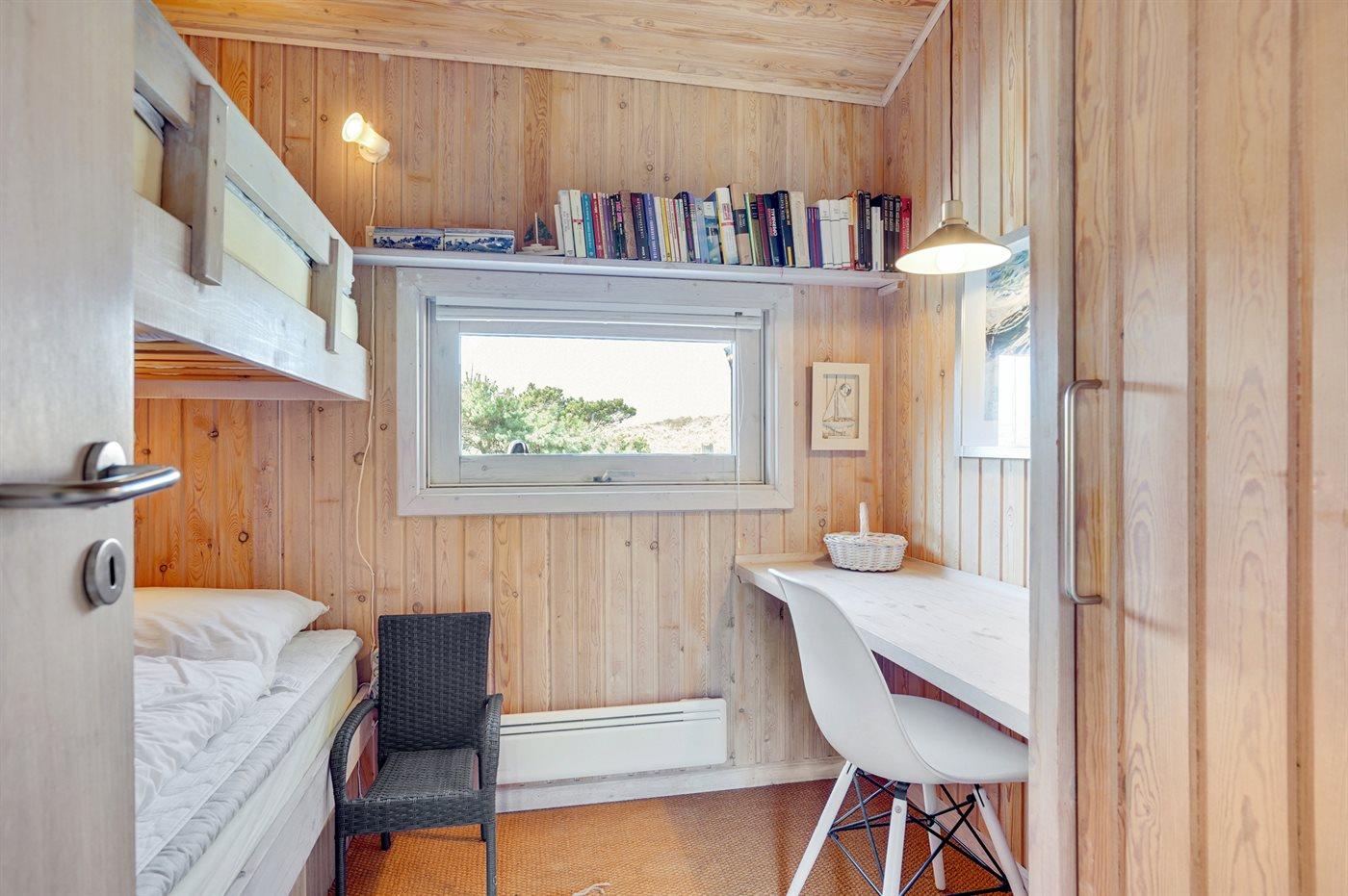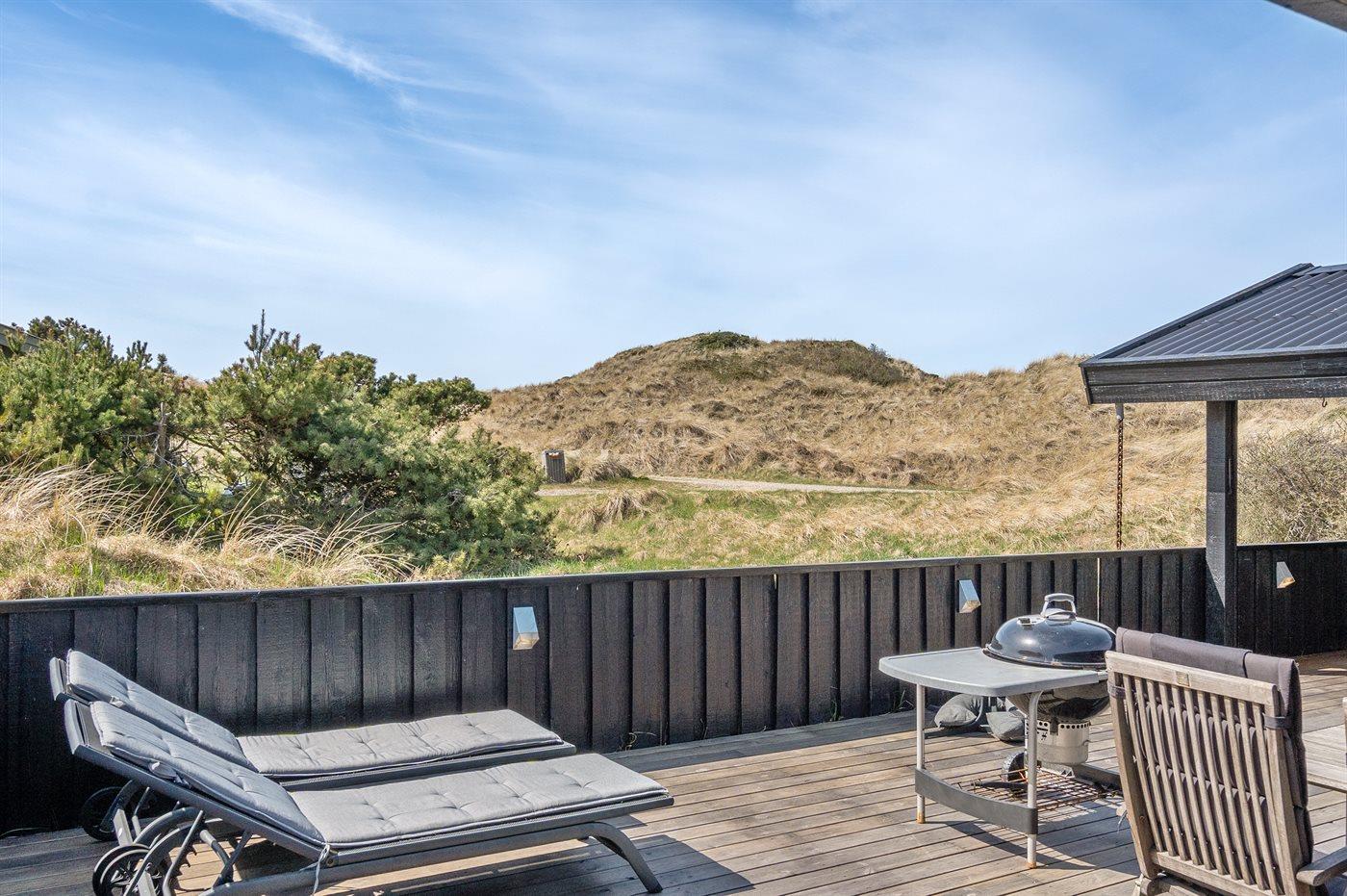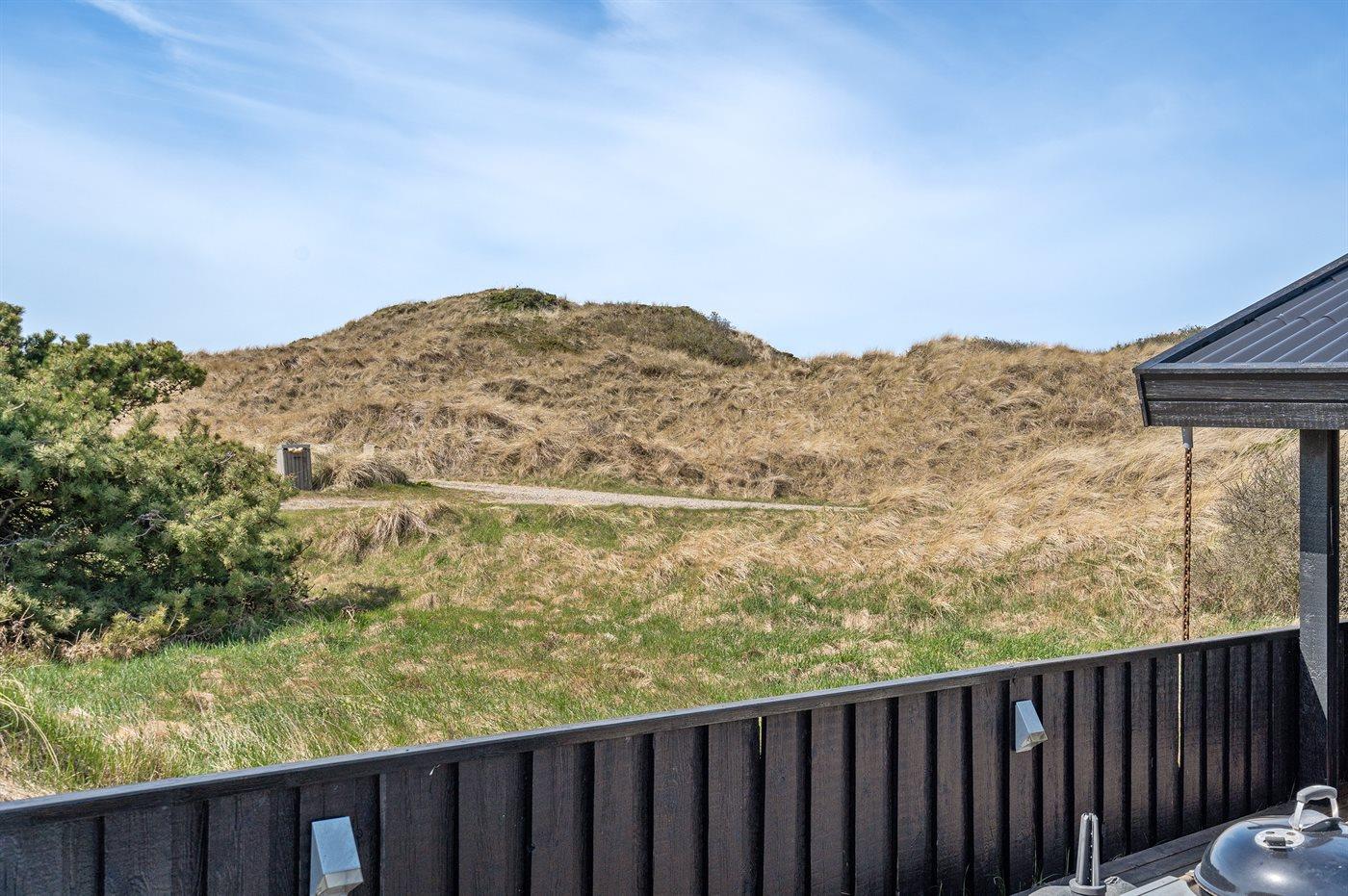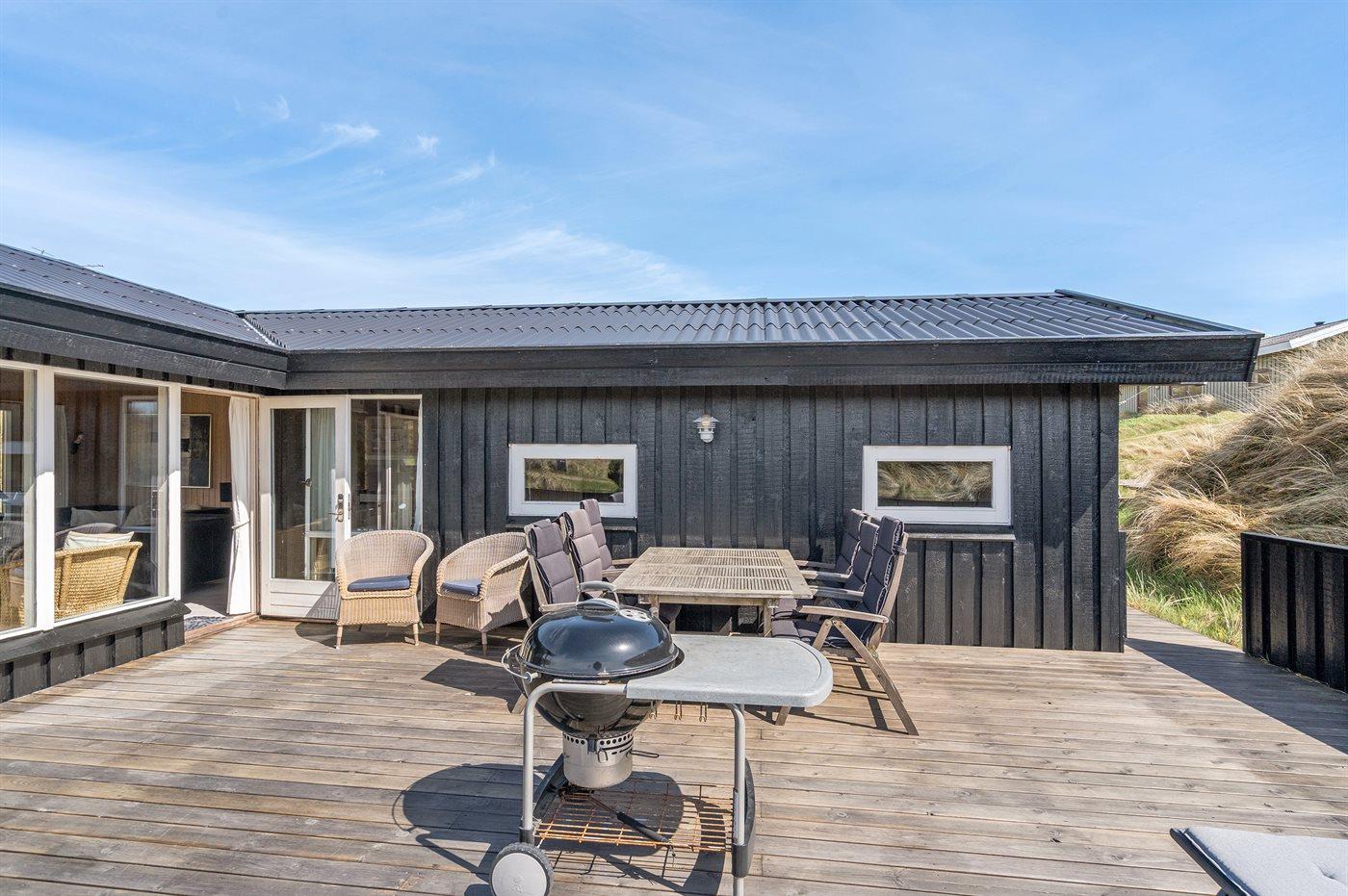 Kun 200 m fra den dejlige sandstrand ved Vesterhavet ligger dette hyggelige og smukt indrettede sommerhus i træ. Huset er bygget i 1984 og delvist renoveret i 2001 og ligger på en stor, kuperet naturgrund med havudsigt fra grunden. Til huset hører terrasseareal med havemøbler og gode læmuligheder. Der er installeret energibesparende varmepumpe. Badeværelse med gulvvarme og bruser. Køkkenet, som bl.a. er udstyret med fryser, opvaskemaskine, mikrobølgeovn og komfur med keramiske kogeplader, er kombineret med spiseafdelingen og opholdsstuen. Opholdsstuen er pænt møbleret og indeholder brændeovn, DVD-afspiller, TV med parabol (digital) og stereoanlæg med CD-afspiller. Huset har 3 soverum; 2 med 1 dobbeltseng og 1 med køjeseng. Af yderligere udstyr kan gratis, trådløs internetforbindelse (computer skal medbringes), vaskemaskine og høj barnestol nævnes. Et særdeles velbeliggende sommerhus!