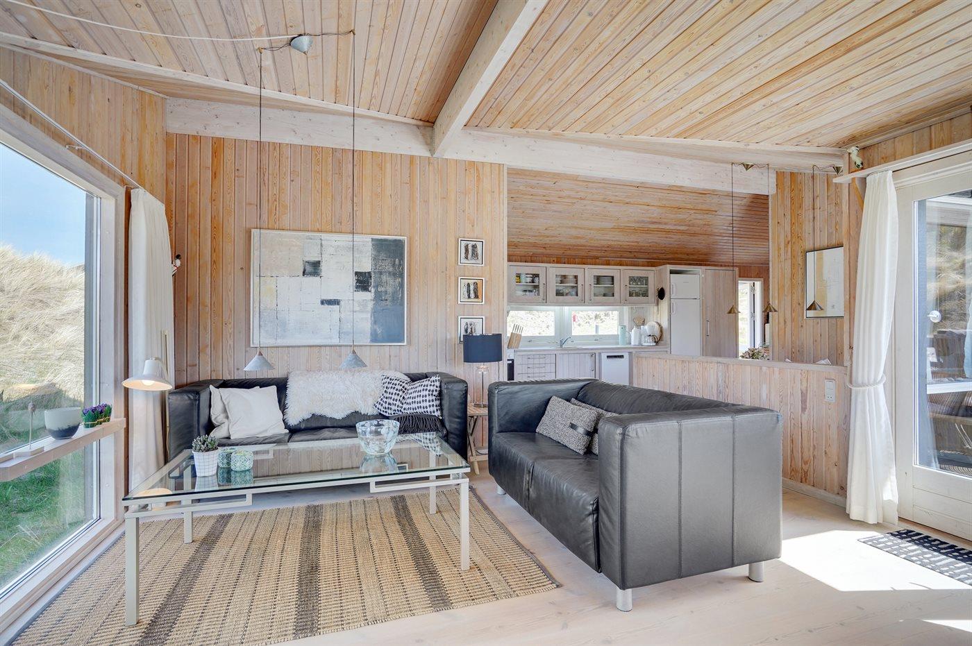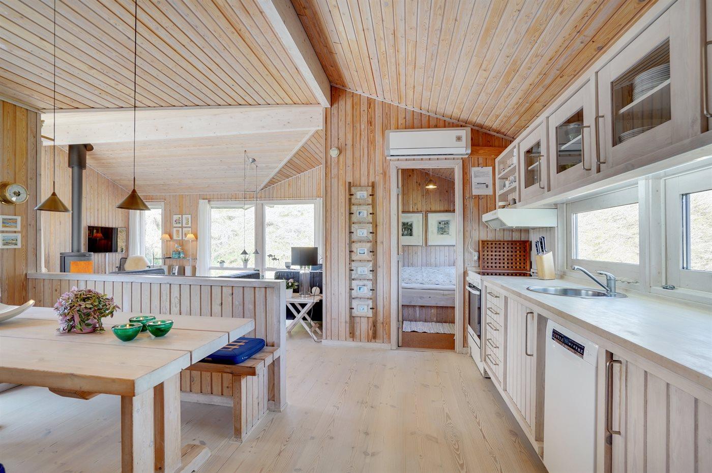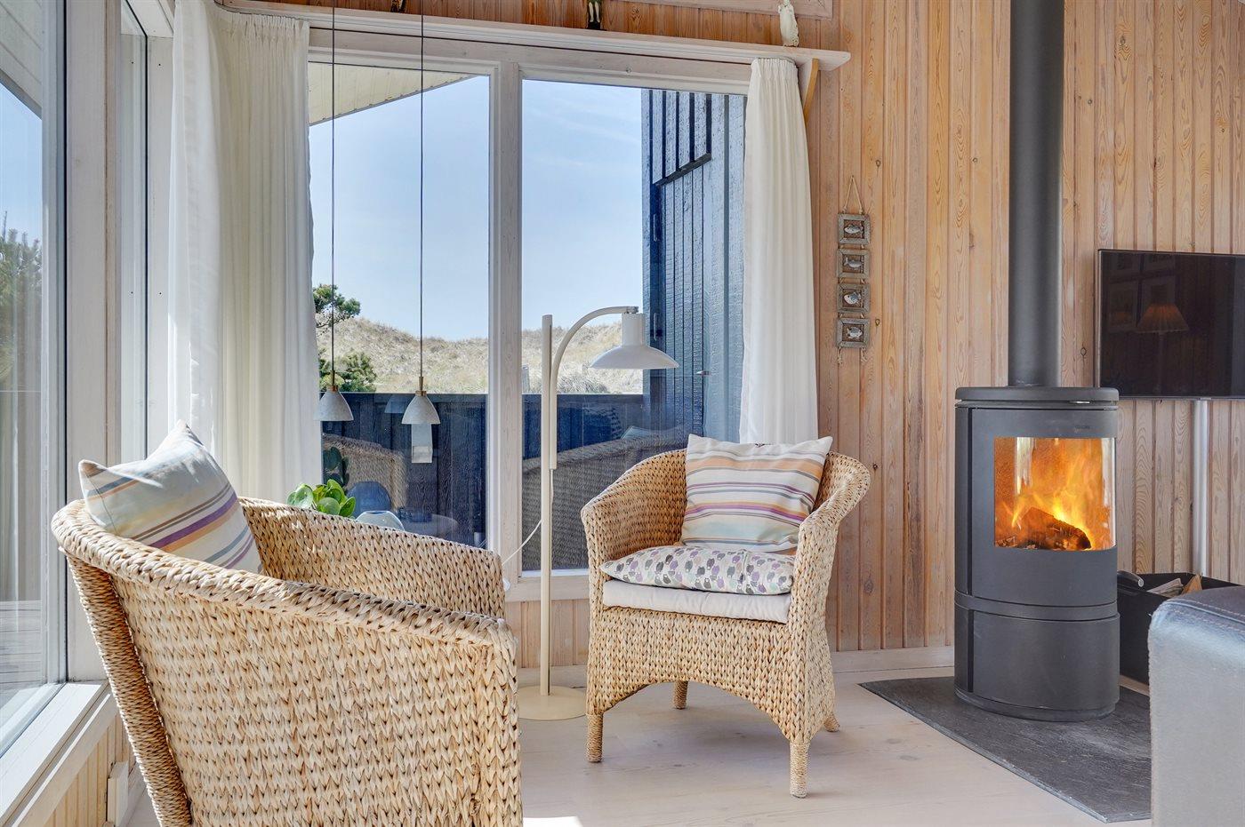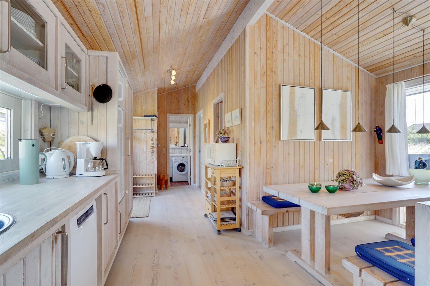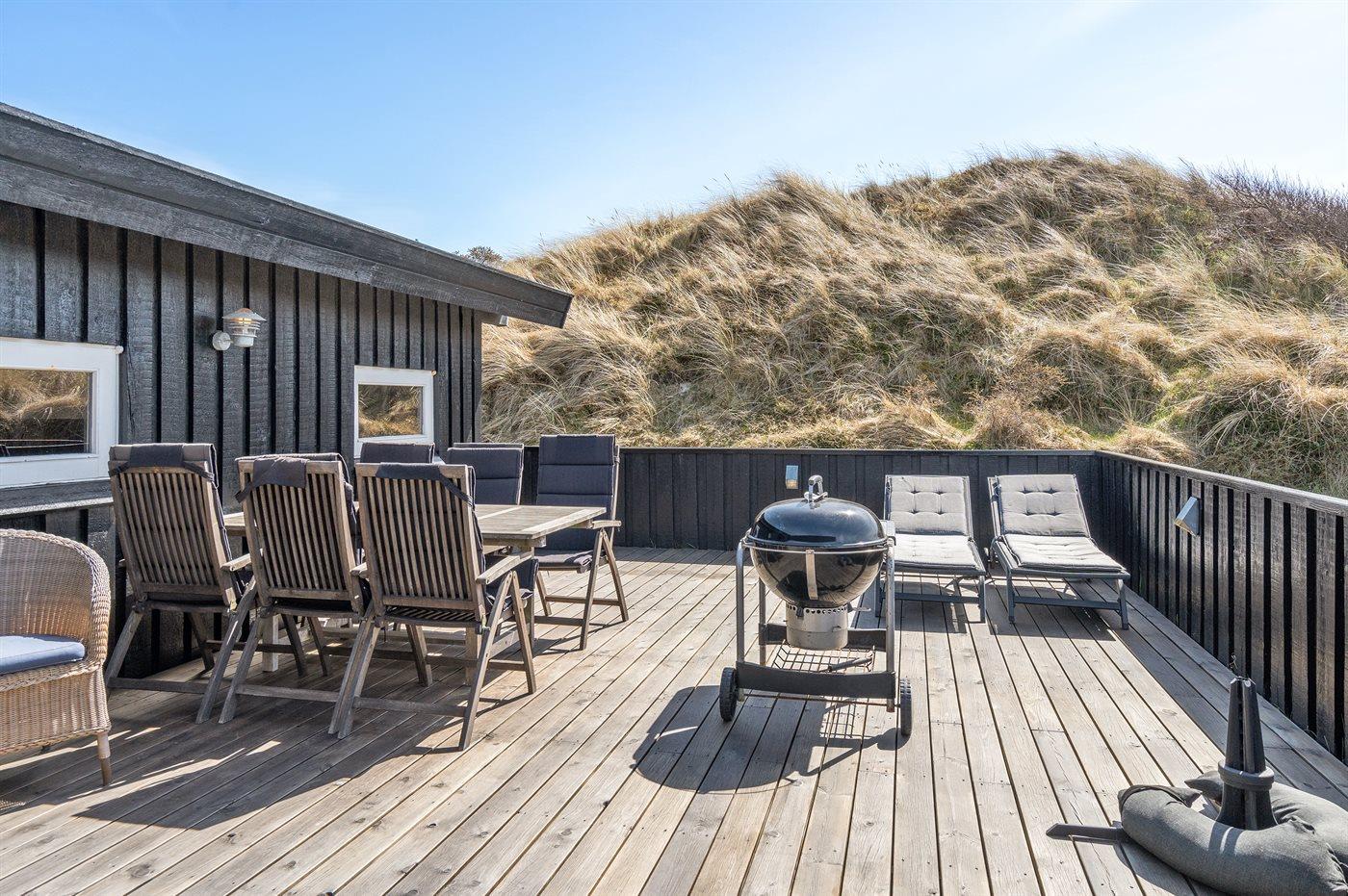 Kun 200 m fra den dejlige sandstrand ved Vesterhavet ligger dette hyggelige og smukt indrettede sommerhus i træ. Huset er bygget i 1984 og delvist renoveret i 2001 og ligger på en stor, kuperet naturgrund med havudsigt fra grunden. Til huset hører terrasseareal med havemøbler og gode læmuligheder. Der er installeret energibesparende varmepumpe. Badeværelse med gulvvarme og bruser. Køkkenet, som bl.a. er udstyret med fryser, opvaskemaskine, mikrobølgeovn og komfur med keramiske kogeplader, er kombineret med spiseafdelingen og opholdsstuen. Opholdsstuen er pænt møbleret og indeholder brændeovn, DVD-afspiller, TV med parabol (digital) og stereoanlæg med CD-afspiller. Huset har 3 soverum; 2 med 1 dobbeltseng og 1 med køjeseng. Af yderligere udstyr kan gratis, trådløs internetforbindelse (computer skal medbringes), vaskemaskine og høj barnestol nævnes. Et særdeles velbeliggende sommerhus!
