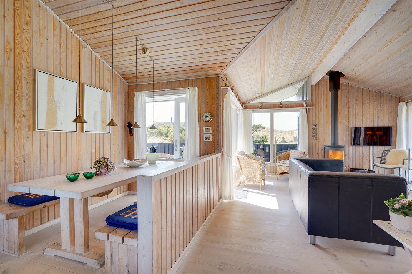 Hyggeligt træsommerhus tæt på Vesterhavets sandstrand med havudsigt og moderne faciliteter.