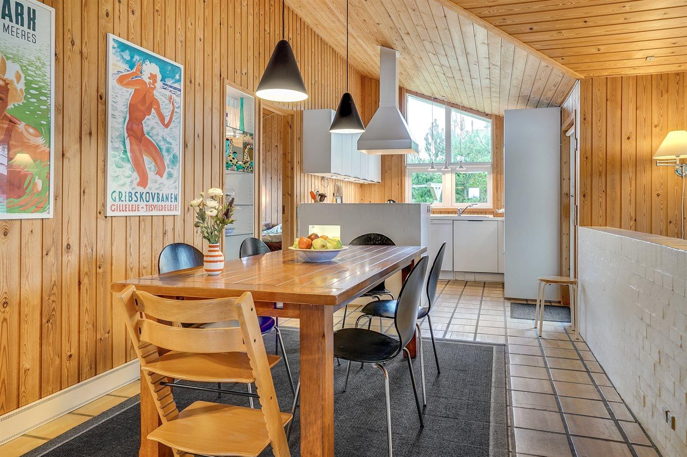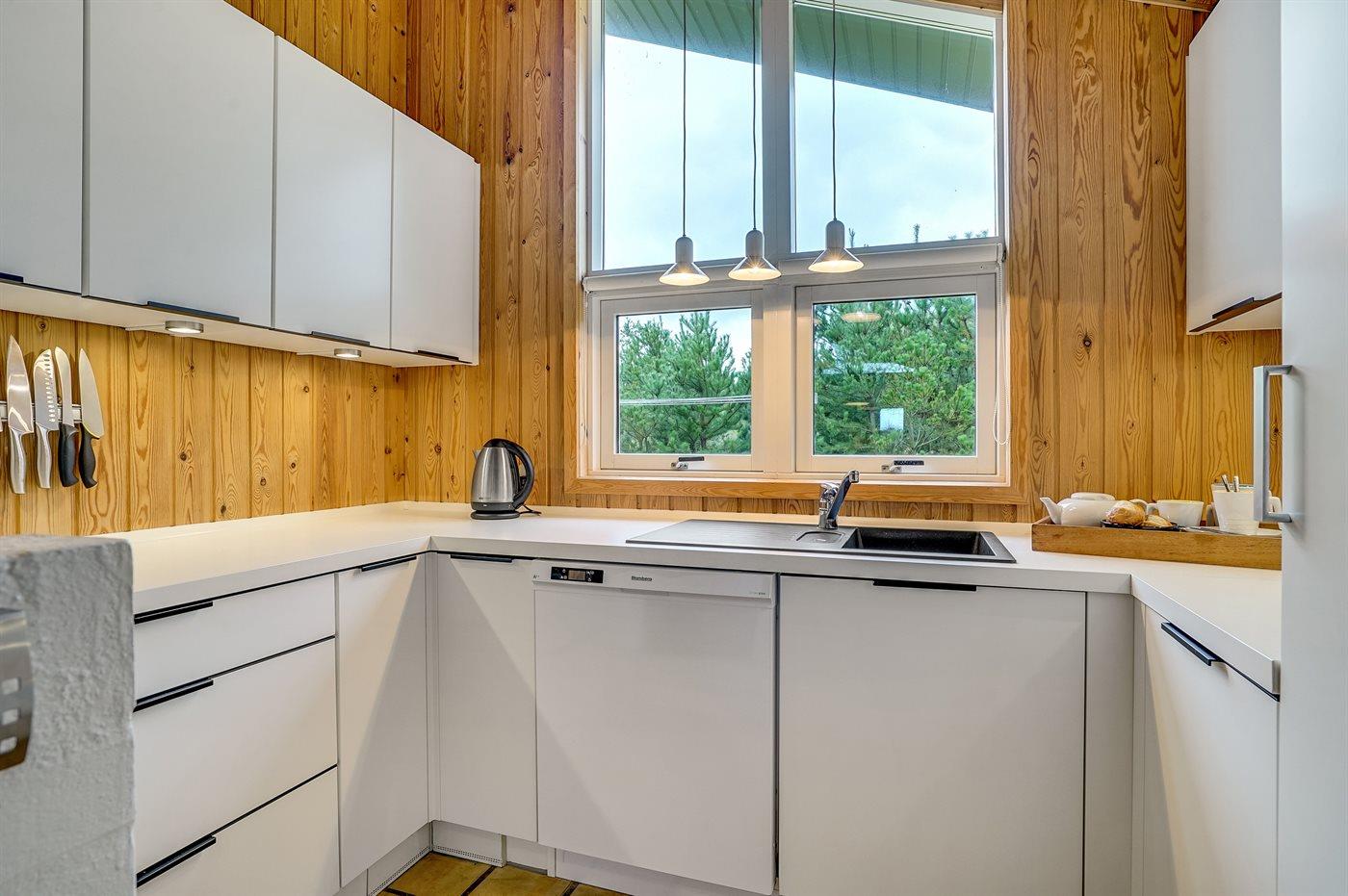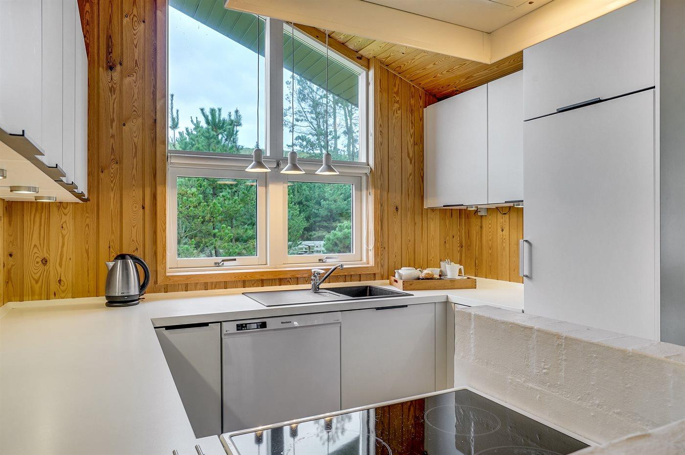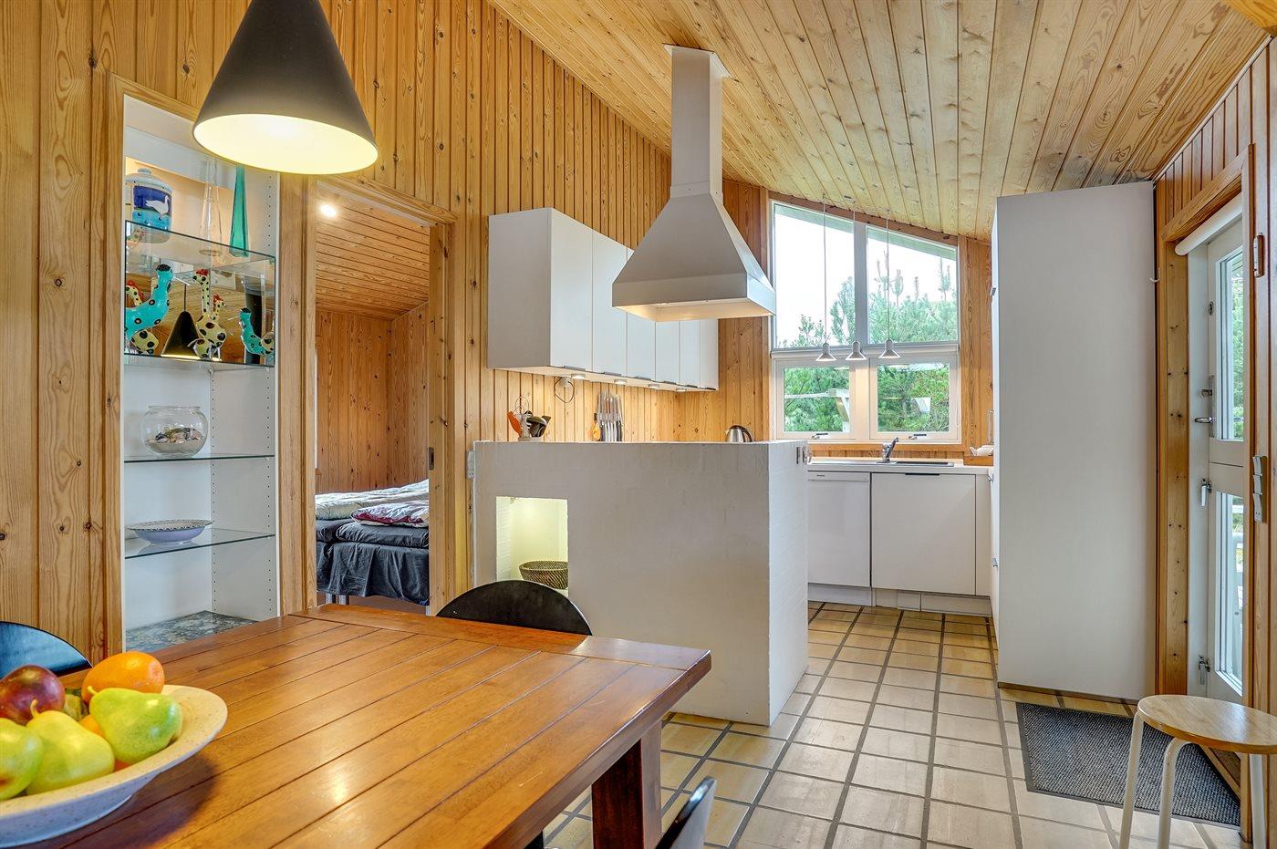 Køkkenet er udstyret med 1 køleskab. Der er 4 keramiske kogeplader, varmluftovn samt opvaskemaskine.