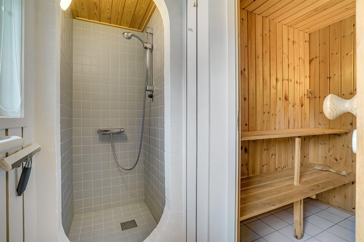 Der er 1 badeværelse (renoveret i 2023) med bruseniche og 1 toilet.. Der er gulvvarme på 1 badeværelse. I saunaen er der mulighed for afslapning.