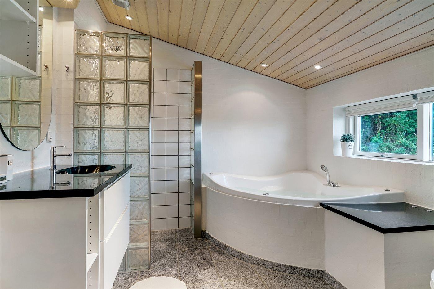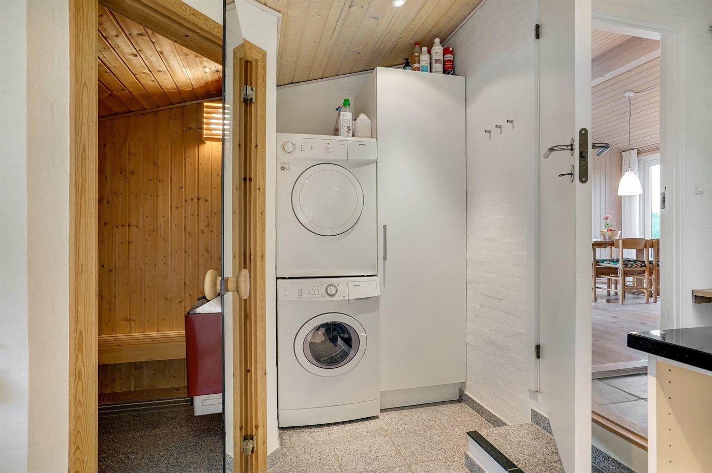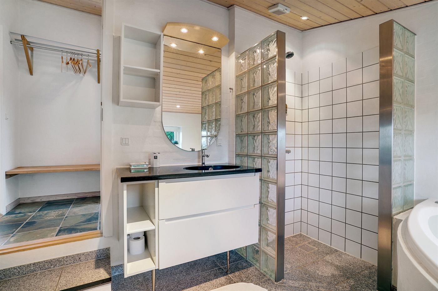 Der er 1 badeværelse med bruser og 1 toilet.. Der er gulvvarme på 1 badeværelse. I saunaen er der mulighed for afslapning.