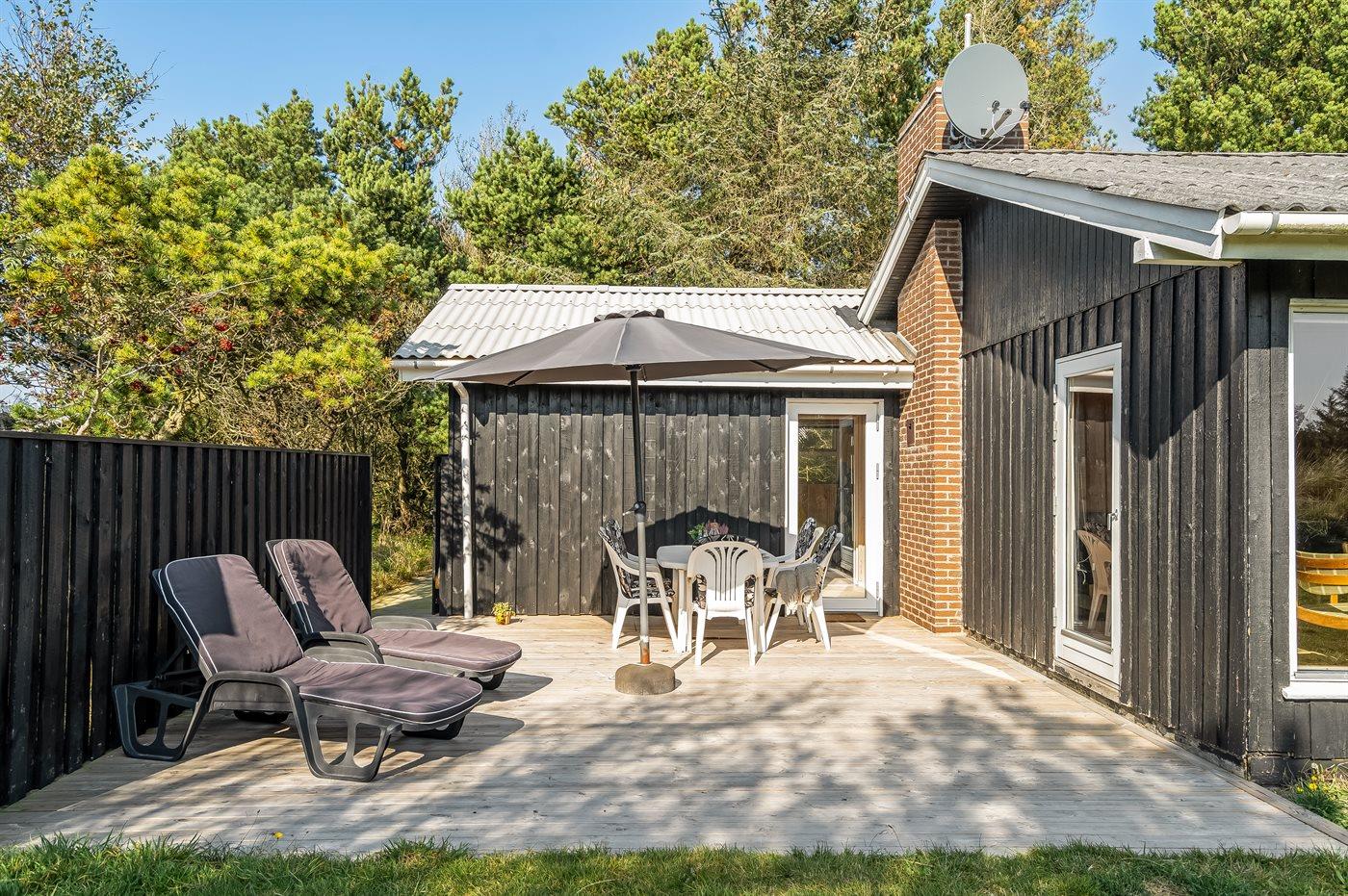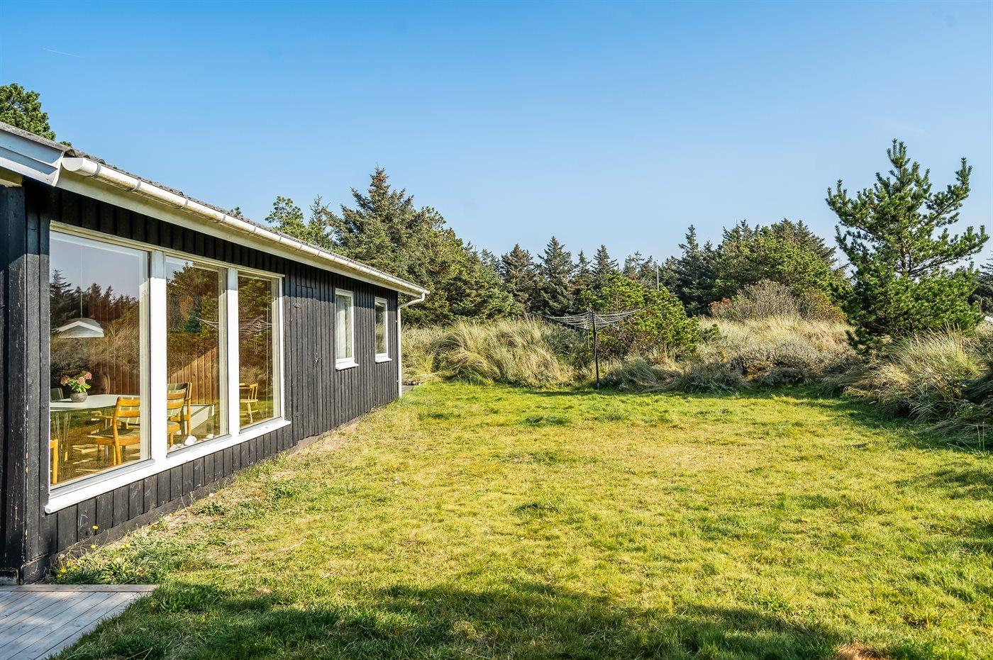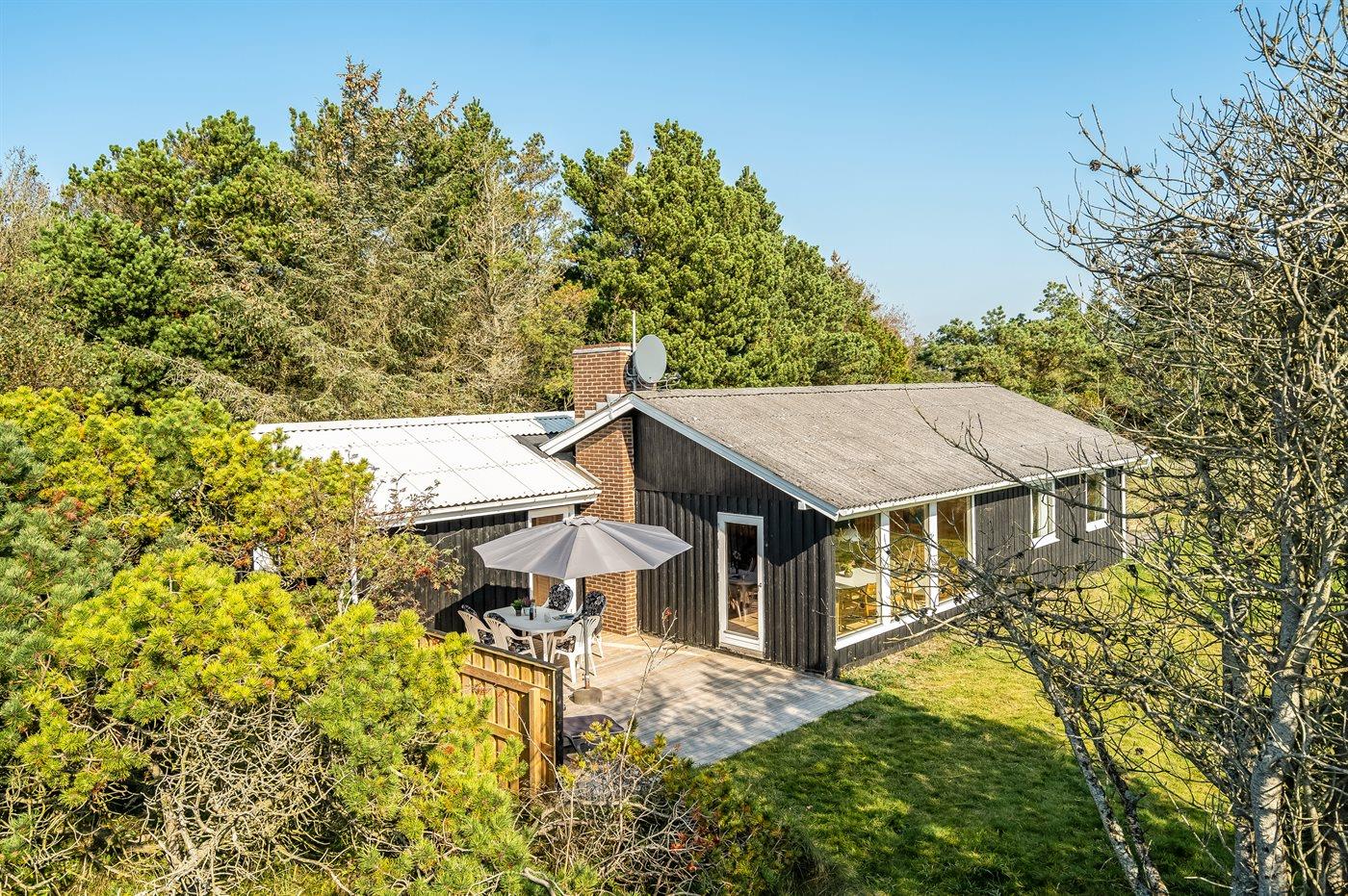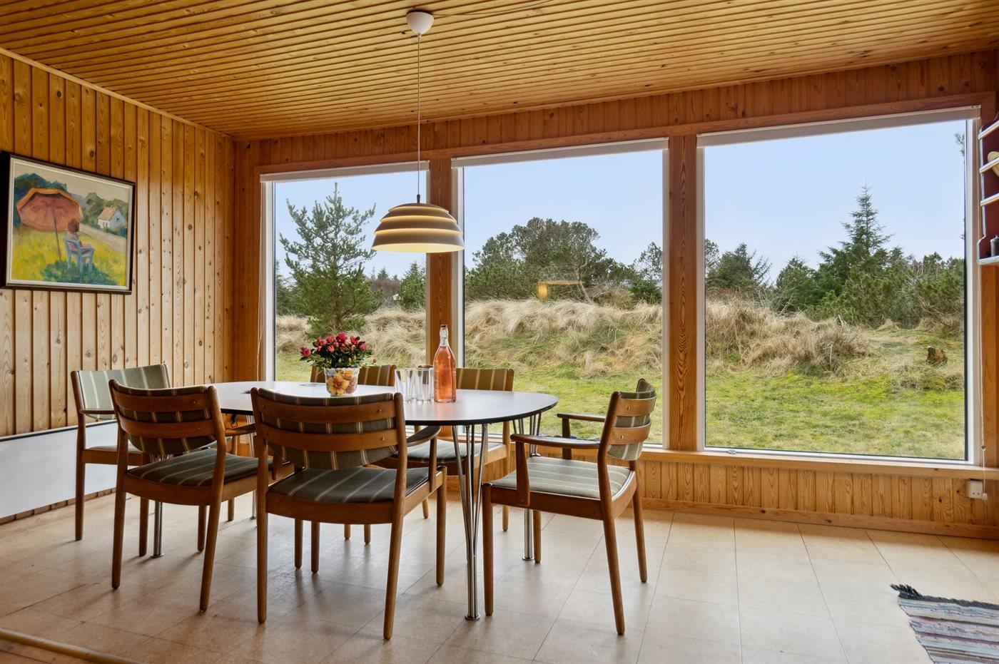 Dette rummelige sommerhus med tilbygning fra 2023 er beliggende på dejlig naturgrund med skøn udsigt over kuperet lyng- og klitlandskab. Til huset hører flere terrasser med mulighed for ophold i både sol og læ.