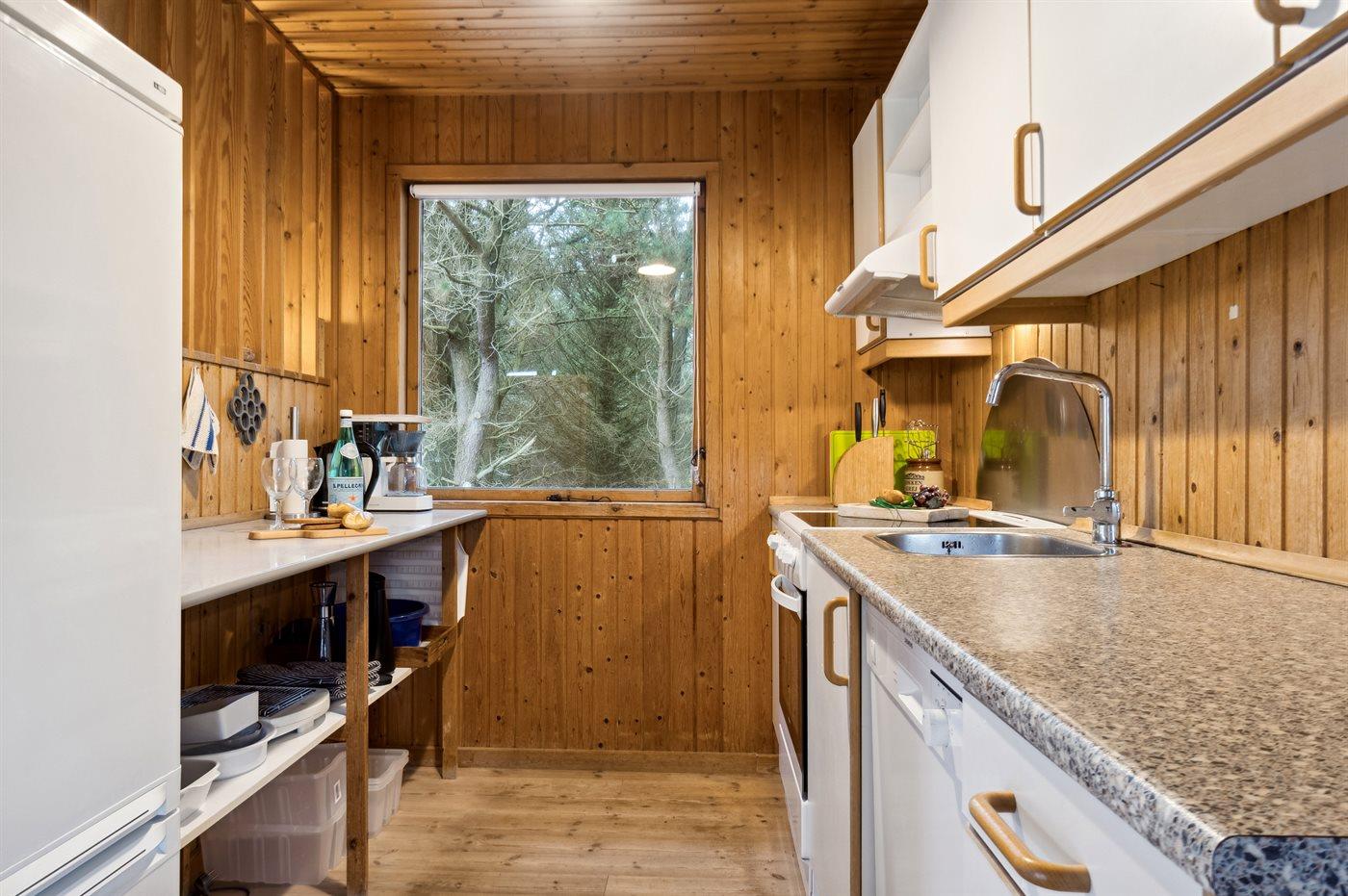 Køkkenet er udstyret med 1 køleskab. Der er 4 keramiske kogeplader, varmluftovn samt opvaskemaskine.