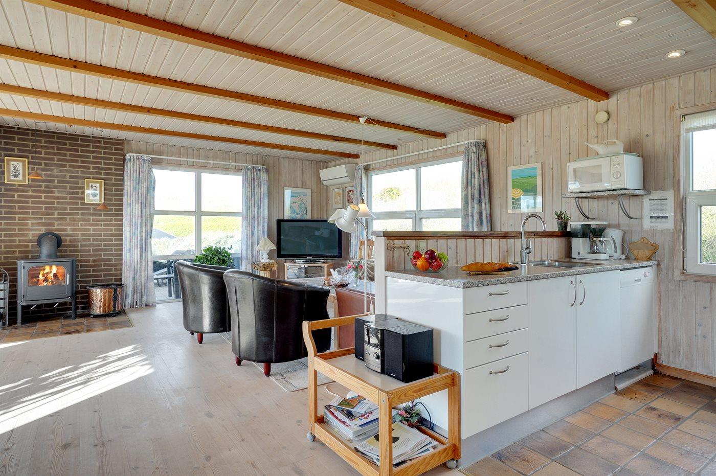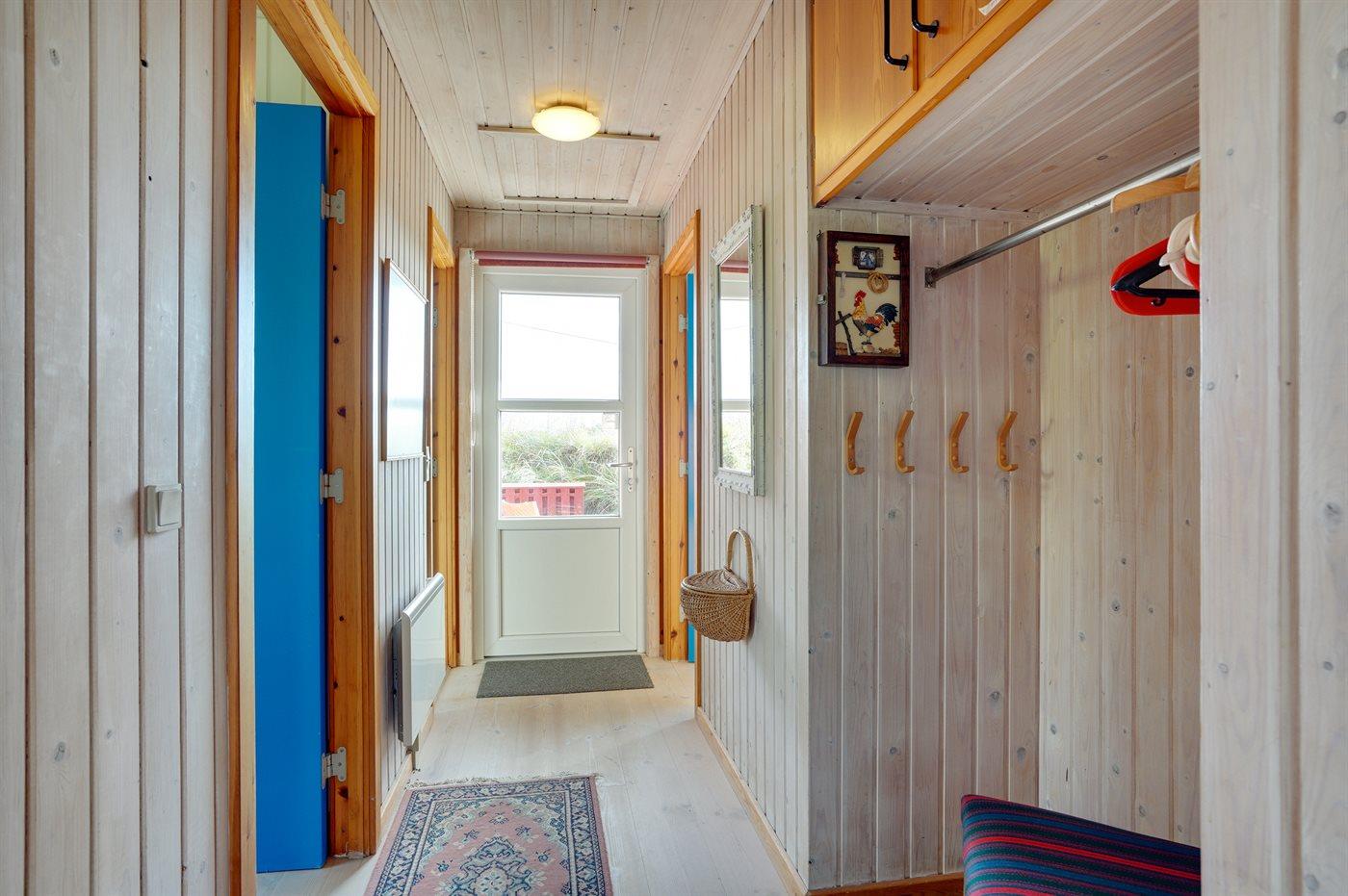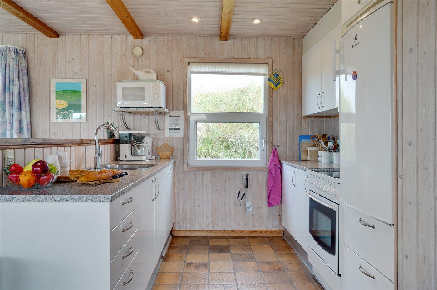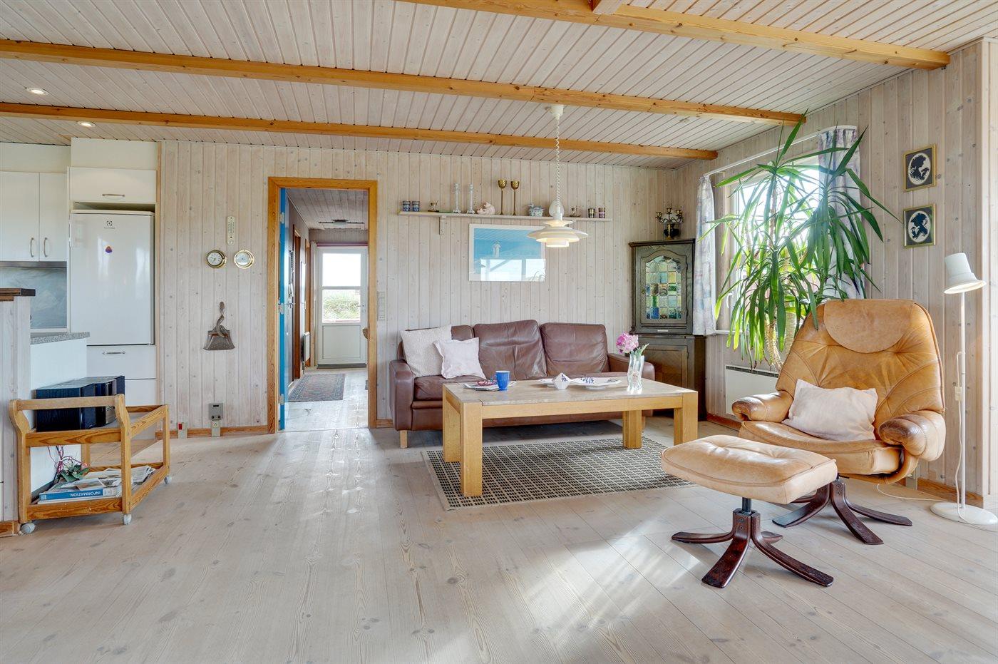 Rummeligt sommerhus højt beliggende på en skøn kuperet grund i storslået natur lige bag klitterne til stranden og Vesterhavet. Havudsigt fra såvel hus som grund. Til huset hører gode terrasser, naturligt afskærmet af klitter, med havemøbler.