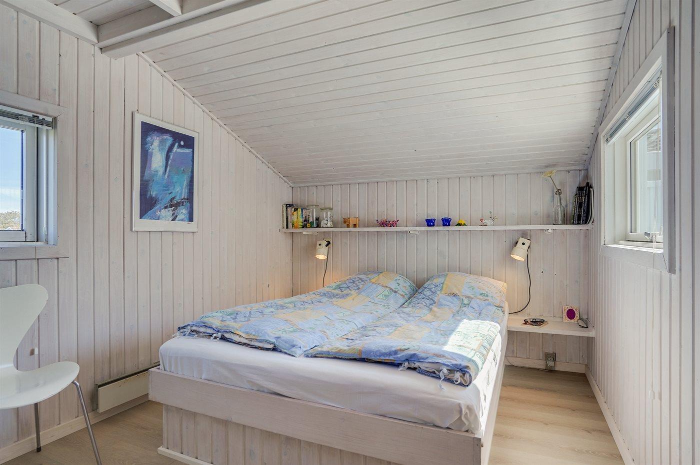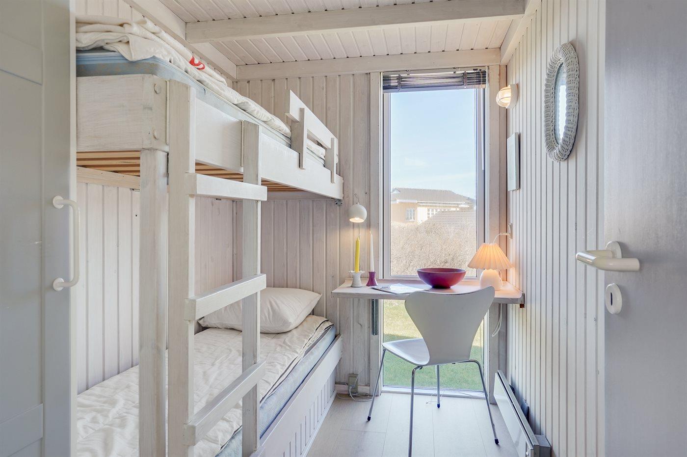Der er i alt 3 soveværelser. Sovepladserne fordeler sig på: 4 sovepladser i dobbeltsenge. 2 sovepladser i køjeseng. Derudover er der 1 stk. barneseng.