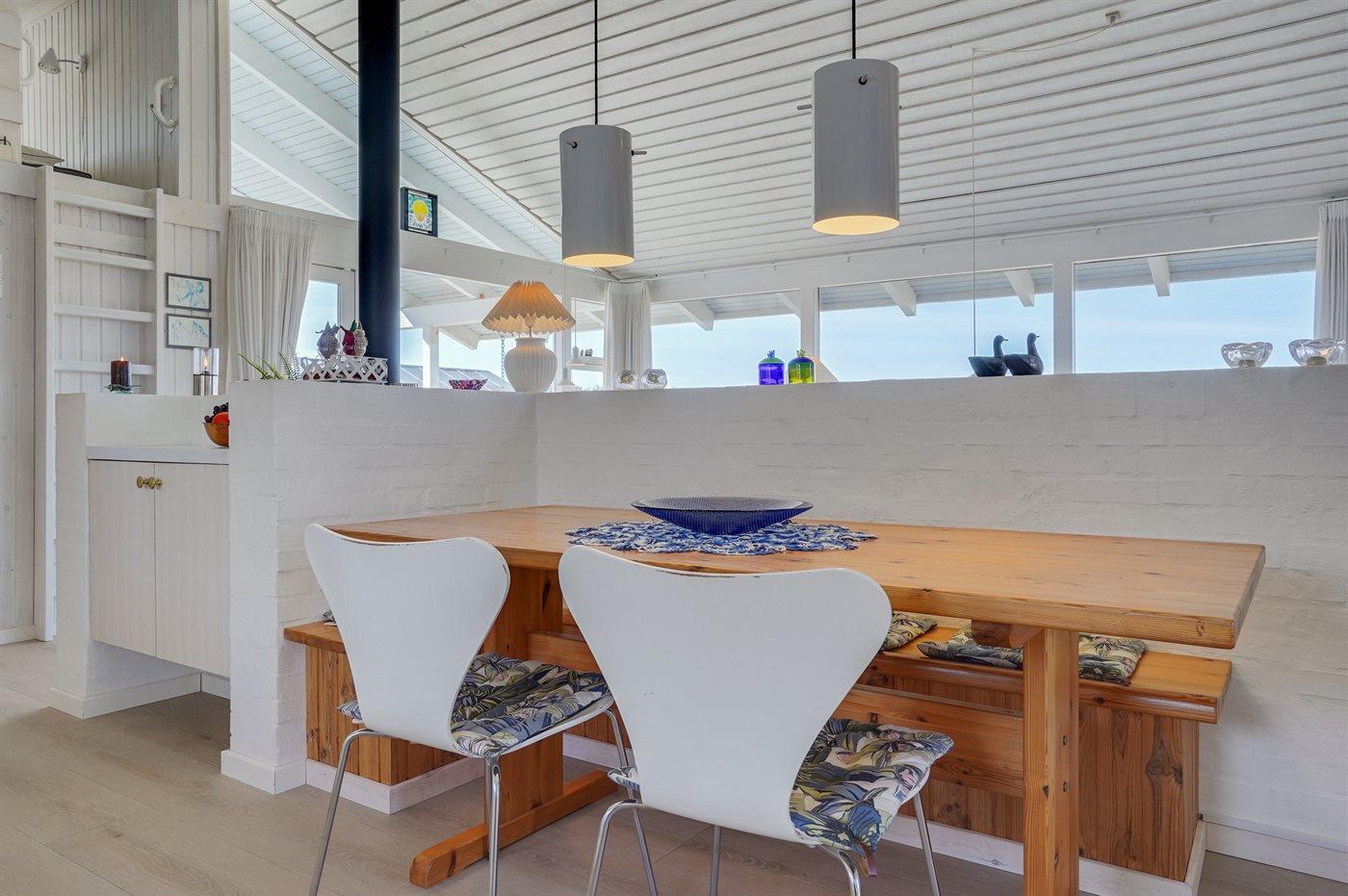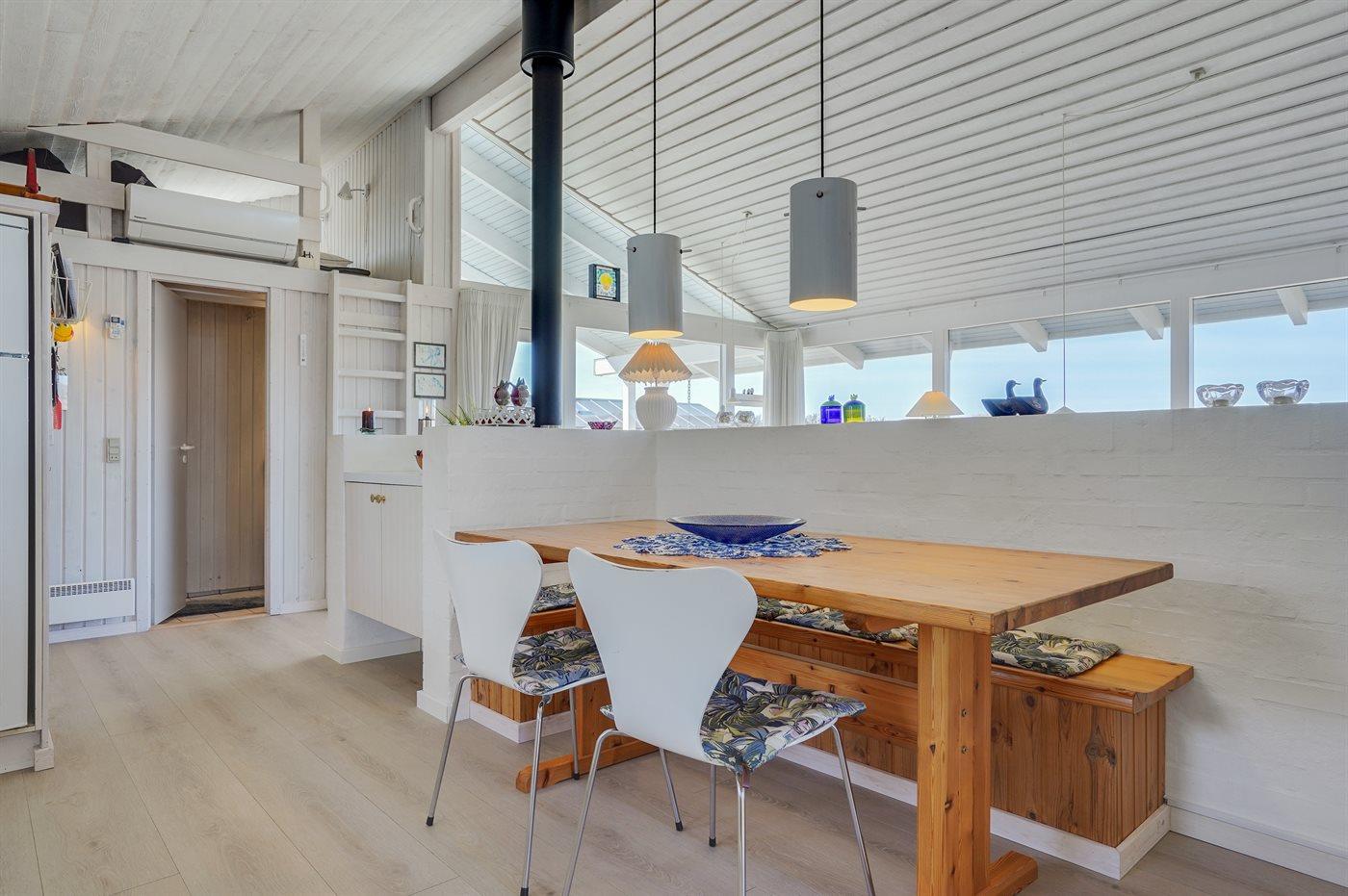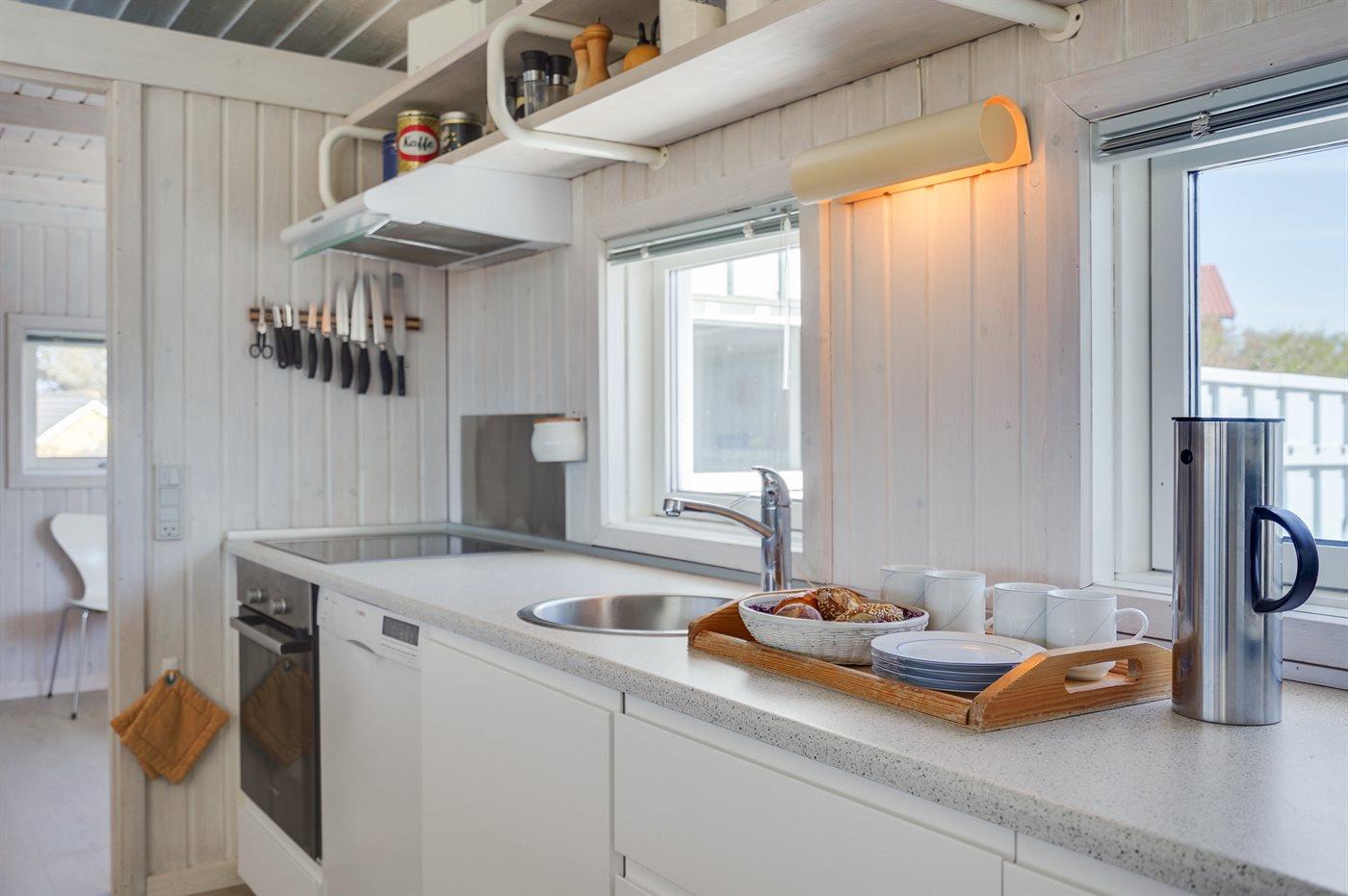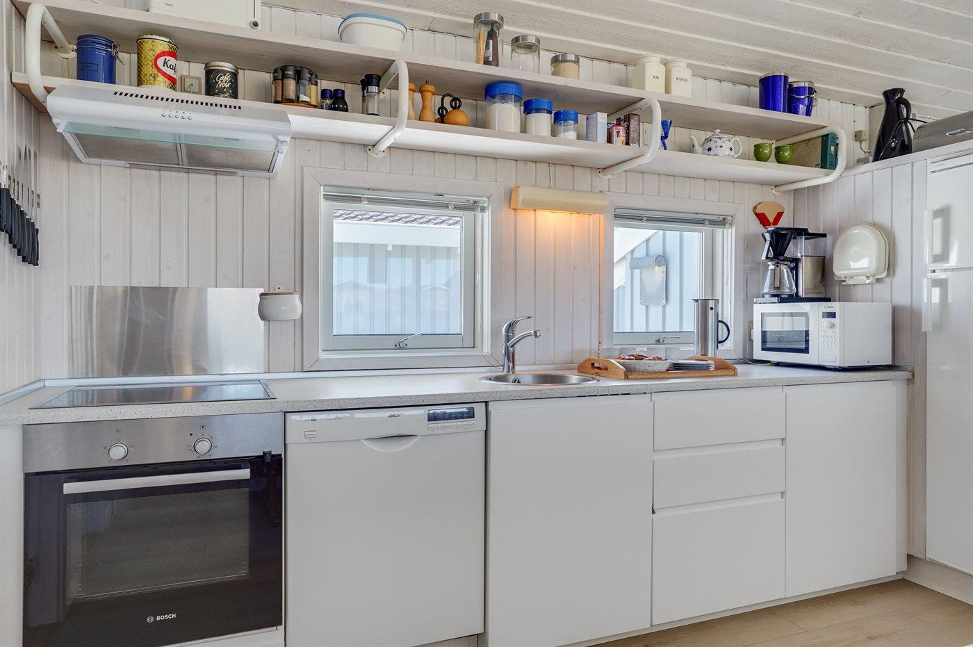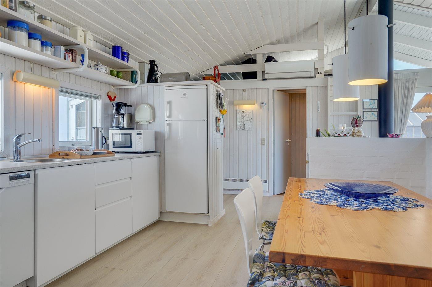 Køkkenet er udstyret med 1 køleskab. Der er 4 keramiske kogeplader, varmluftovn, mikrobølgeovn samt opvaskemaskine.