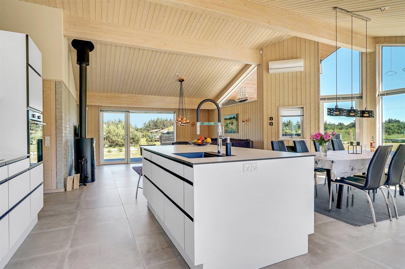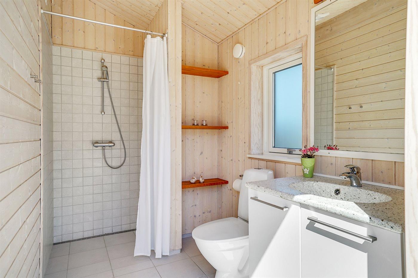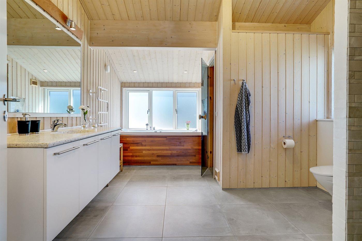 Stort, luksuriøst udstyret sommerhus i træ fra 2009 med spa og sauna. Huset, der er opført på en naturgrund, er omgivet af et meget stort terrasseareal, hvoraf en del er overdækket. Indvendigt er gulvene belagt med klinker, dog er der trægulv i 2 soveværelser. Rummeligt badeværelse med 2-pers. spa, sauna, gulvvarme, bruseniche og håndklædetørrer. Det flotte køkken er udstyret med opvaskemaskine, mikrobølgeovn, varmluftovn, fryser og komfur med keramiske kogeplader. En stor foldedør fra køkkenets spiseafdeling og ud til den overdækkede terrasse gør det muligt at lukke naturen helt ind i huset. Den luksuriøst udstyrede stue indeholder brændeovn, TV med digital parabol og DVD-afspiller. Huset har 2 soveværelser med dobbeltseng og praktisk walk-in-closet samt 1 soveværelse med 2 enkeltsenge. Endvidere findes anneks med 1 soverum med 2 enkeltsenge, ekstra TV og Playstation1 samt badeværelse med bruseniche. I tilknytning til annekset er indrettet et aktivitetsrum med komb. bordfodbold/mini bordtennis/airhockey, motionscykel, romaskine og musikanlæg. Til husets udstyr hører endvidere barneseng, høj barnestol, vaskemaskine og tørretumbler. Et skønt sommerhus tæt ved Fårup Sommerland, Vesterhavet og skovområde.