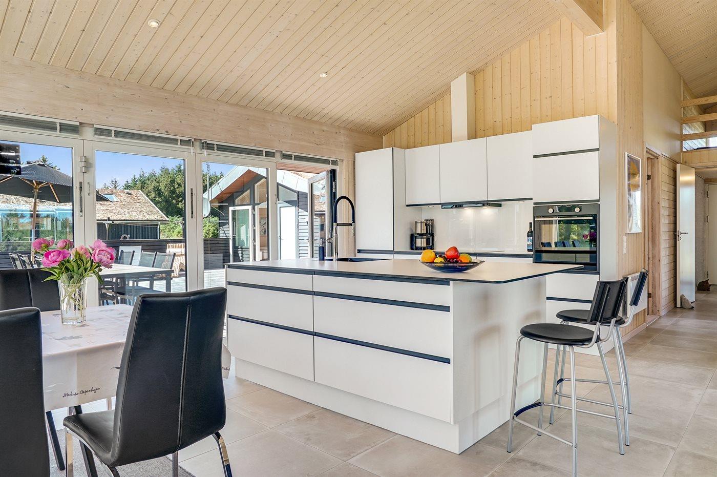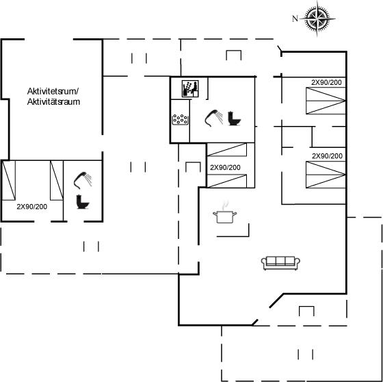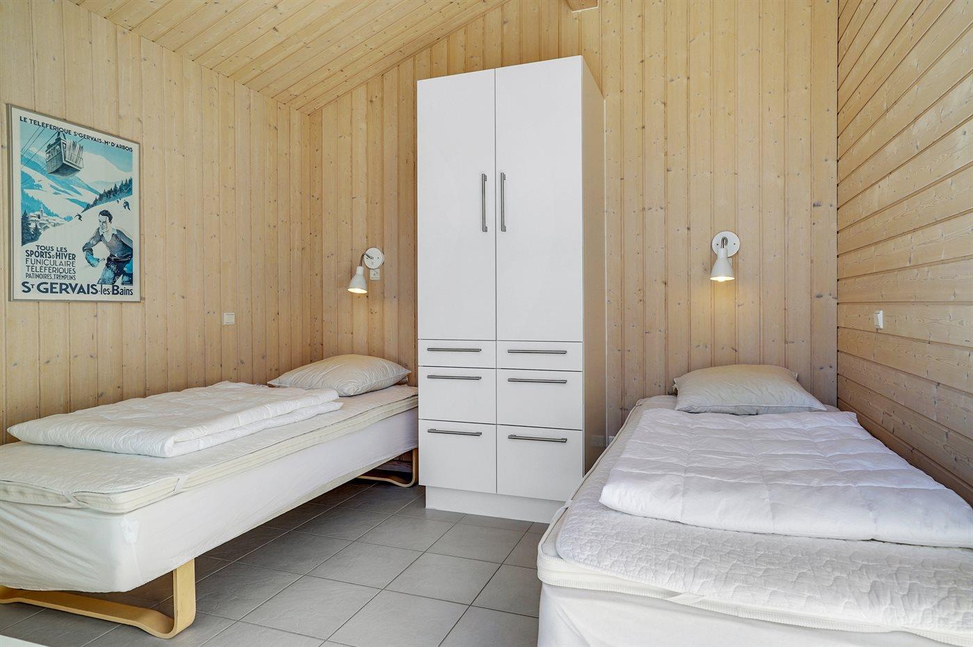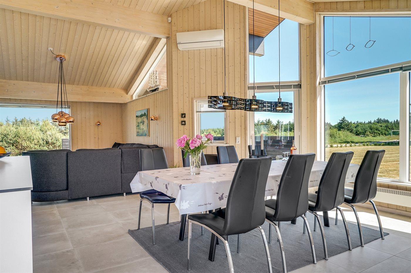 Stort, luksuriøst udstyret sommerhus i træ fra 2009 med spa og sauna. Huset, der er opført på en naturgrund, er omgivet af et meget stort terrasseareal, hvoraf en del er overdækket. Indvendigt er gulvene belagt med klinker, dog er der trægulv i 2 soveværelser. Rummeligt badeværelse med 2-pers. spa, sauna, gulvvarme, bruseniche og håndklædetørrer. Det flotte køkken er udstyret med opvaskemaskine, mikrobølgeovn, varmluftovn, fryser og komfur med keramiske kogeplader. En stor foldedør fra køkkenets spiseafdeling og ud til den overdækkede terrasse gør det muligt at lukke naturen helt ind i huset. Den luksuriøst udstyrede stue indeholder brændeovn, TV med digital parabol og DVD-afspiller. Huset har 2 soveværelser med dobbeltseng og praktisk walk-in-closet samt 1 soveværelse med 2 enkeltsenge. Endvidere findes anneks med 1 soverum med 2 enkeltsenge, ekstra TV og Playstation1 samt badeværelse med bruseniche. I tilknytning til annekset er indrettet et aktivitetsrum med komb. bordfodbold/mini bordtennis/airhockey, motionscykel, romaskine og musikanlæg. Til husets udstyr hører endvidere barneseng, høj barnestol, vaskemaskine og tørretumbler. Et skønt sommerhus tæt ved Fårup Sommerland, Vesterhavet og skovområde.