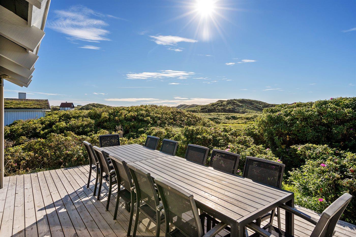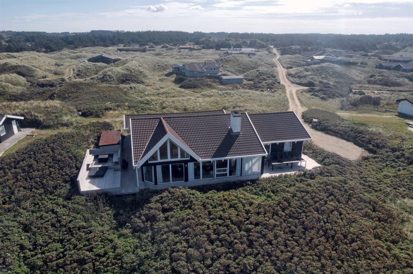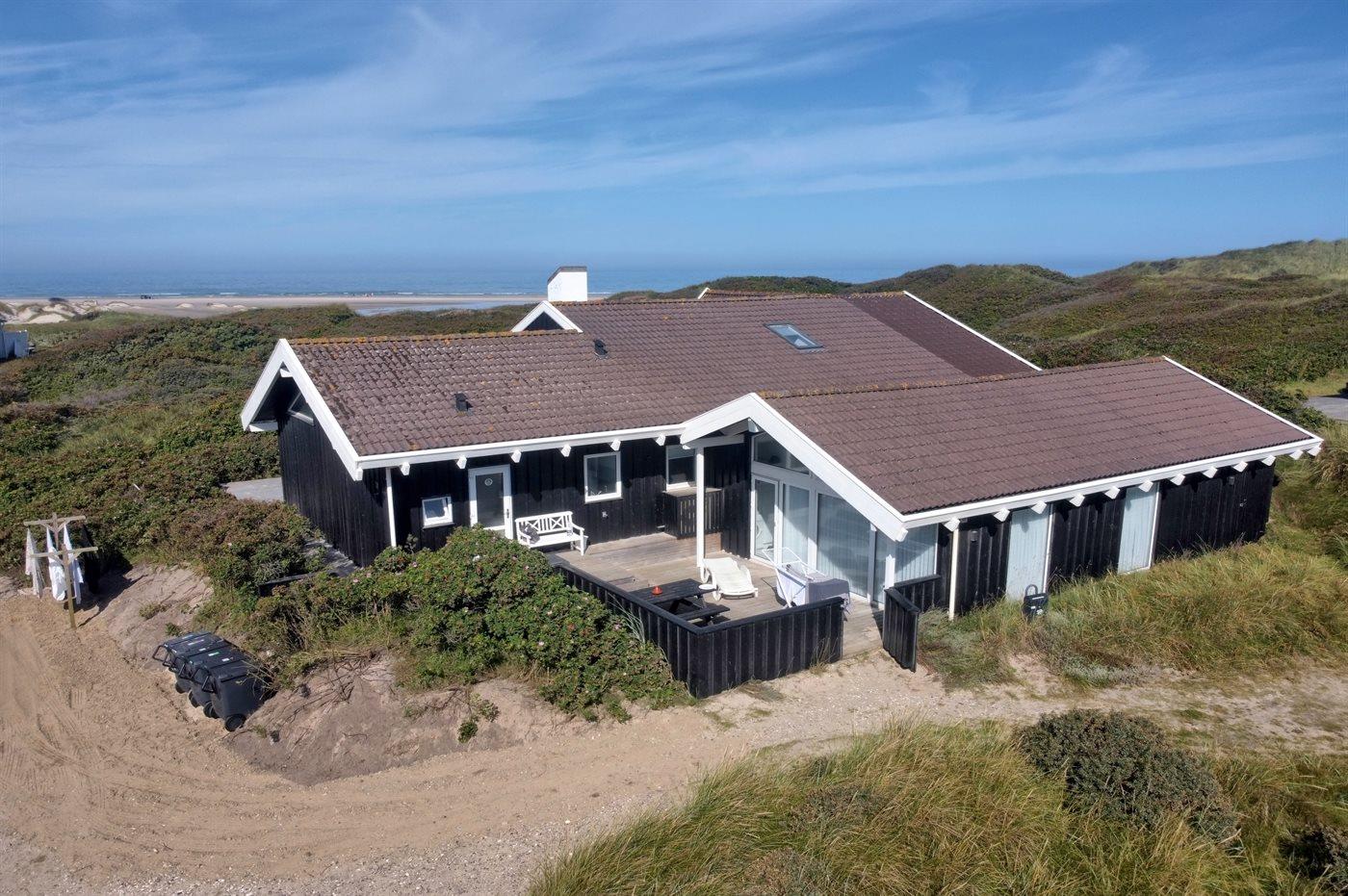 På en utrolig stor klitgrund, som går ned til strandkanten, finder I dette dejlige og rummelige sommerhus. Fra husets første sal er der en flot panoramaudsigt over Vesterhavet og klitterne. Fra den store opholdsstue med stort vinduesparti er der udgang til de store træterrasser, som omgiver huset mod vest - fra en forhøjet terrasse er der kig til vandet. I huset findes skøn swimmingpool-afdeling i forskudt plan samt motionsrum med redskaber.