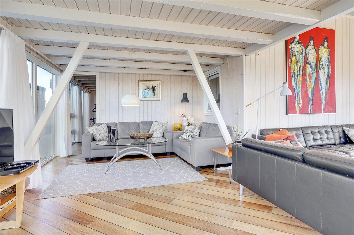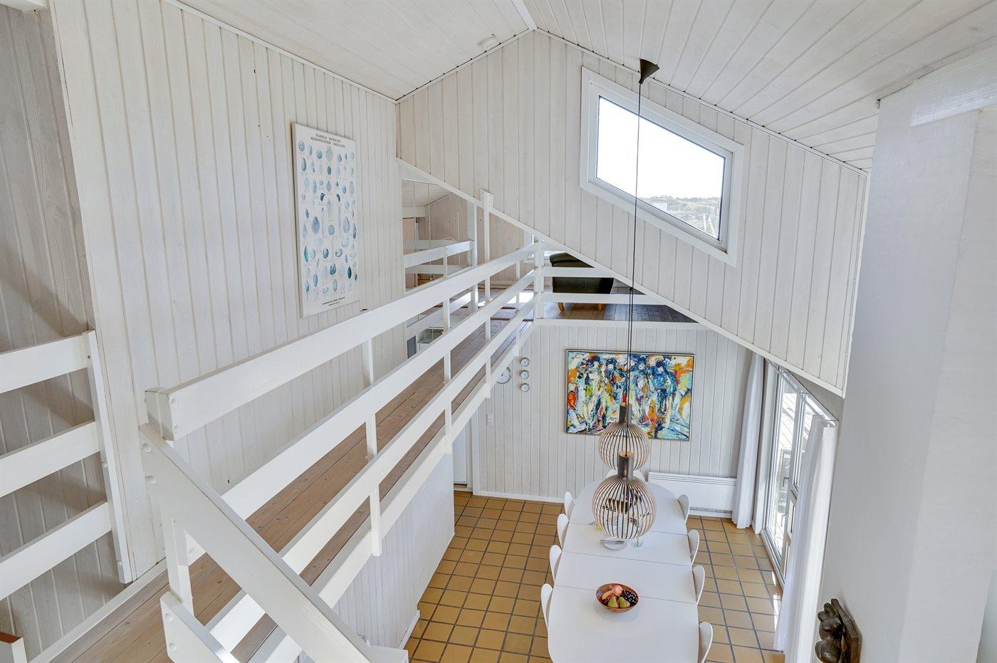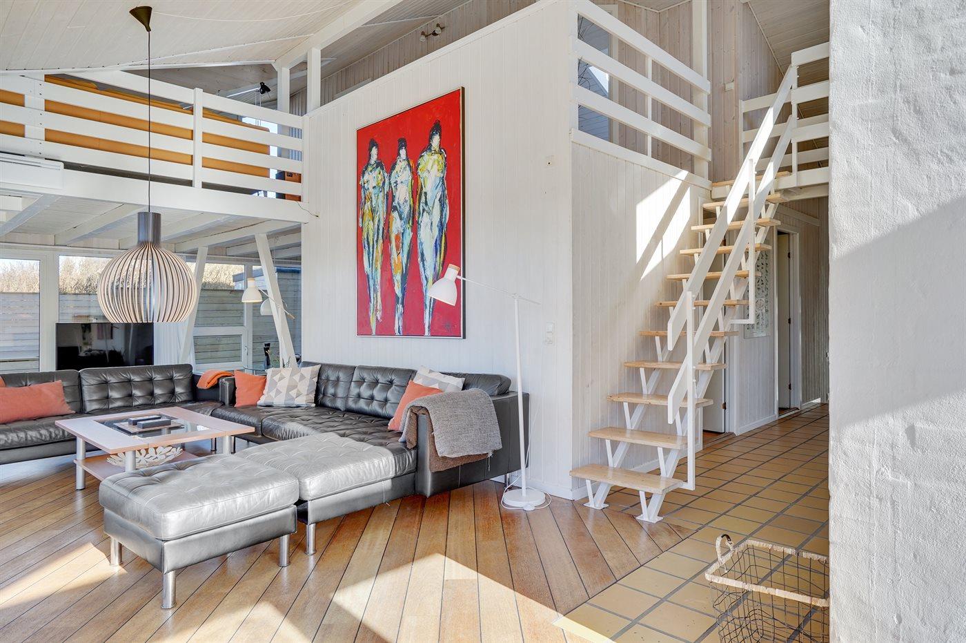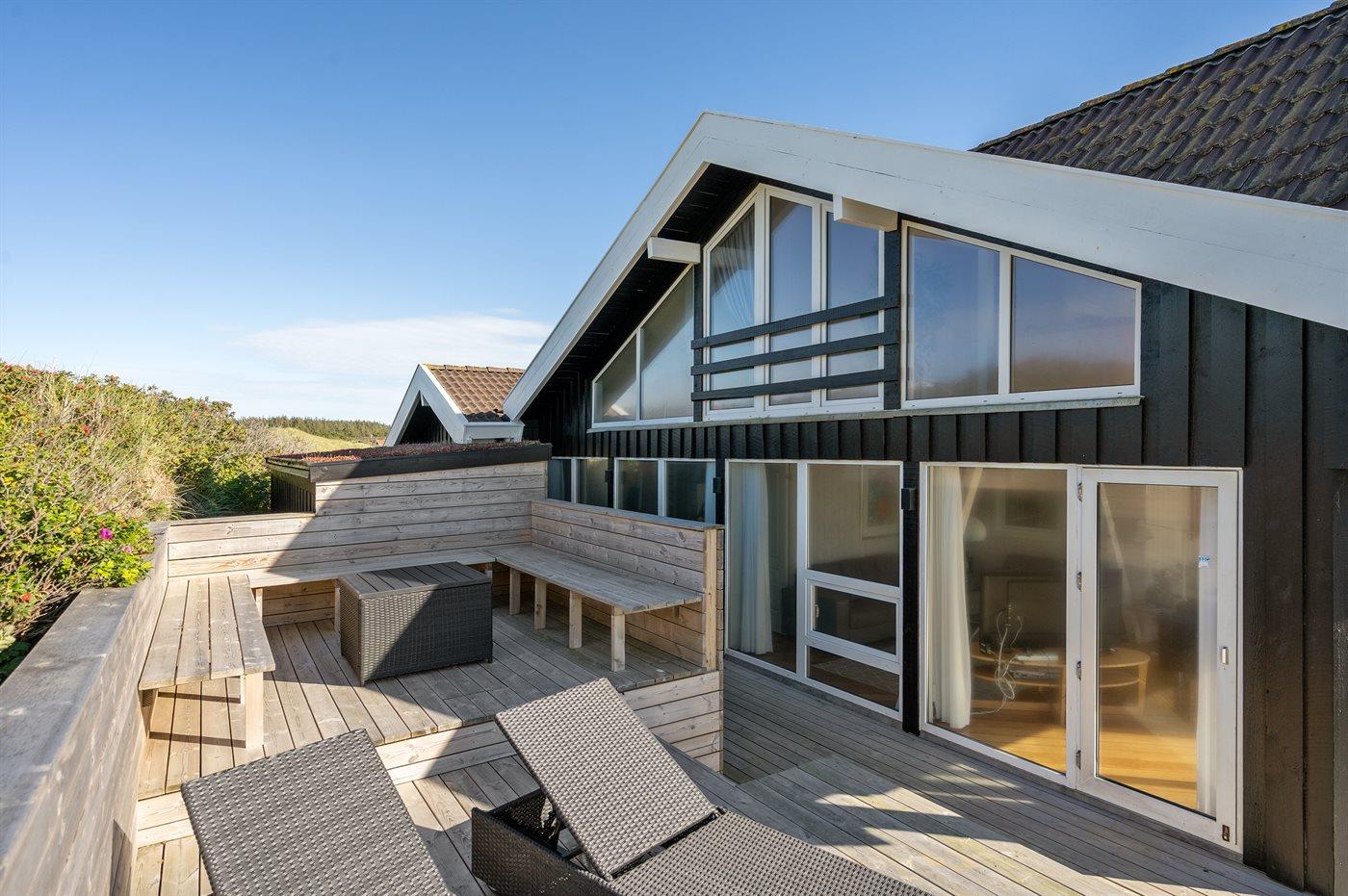 På en utrolig stor klitgrund, som går ned til strandkanten, finder I dette dejlige og rummelige sommerhus. Fra husets første sal er der en flot panoramaudsigt over Vesterhavet og klitterne. Fra den store opholdsstue med stort vinduesparti er der udgang til de store træterrasser, som omgiver huset mod vest - fra en forhøjet terrasse er der kig til vandet. I huset findes skøn swimmingpool-afdeling i forskudt plan samt motionsrum med redskaber.
