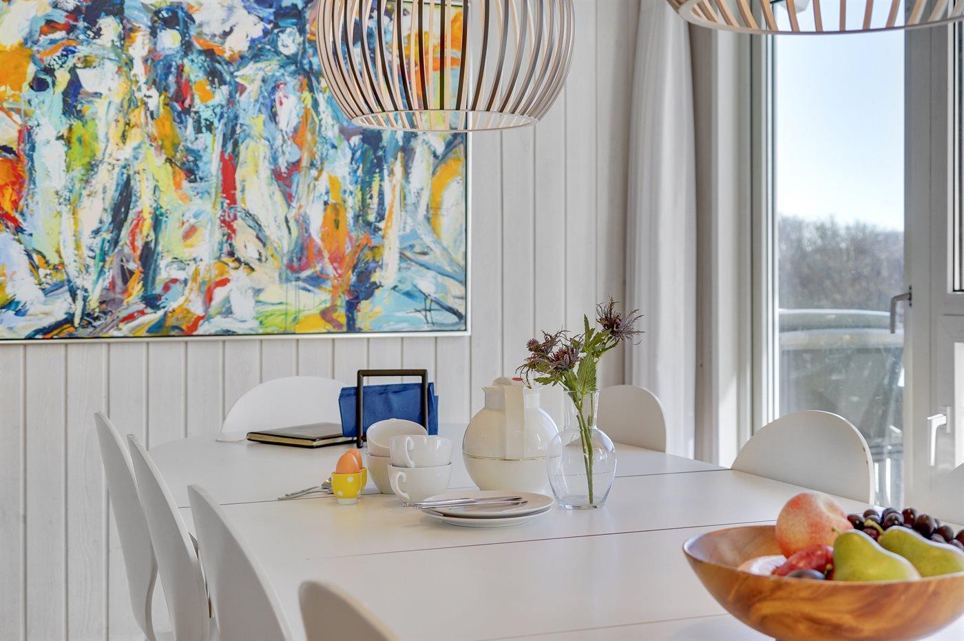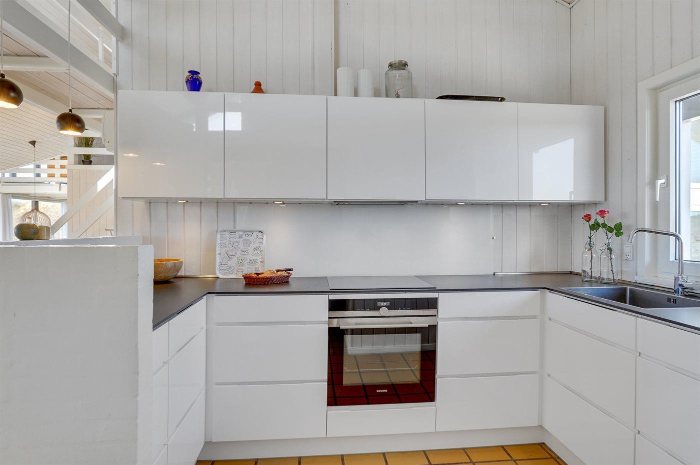Køkkenet er udstyret med 1 køleskab. Der er 4 keramiske kogeplader, varmluftovn, mikrobølgeovn samt opvaskemaskine.