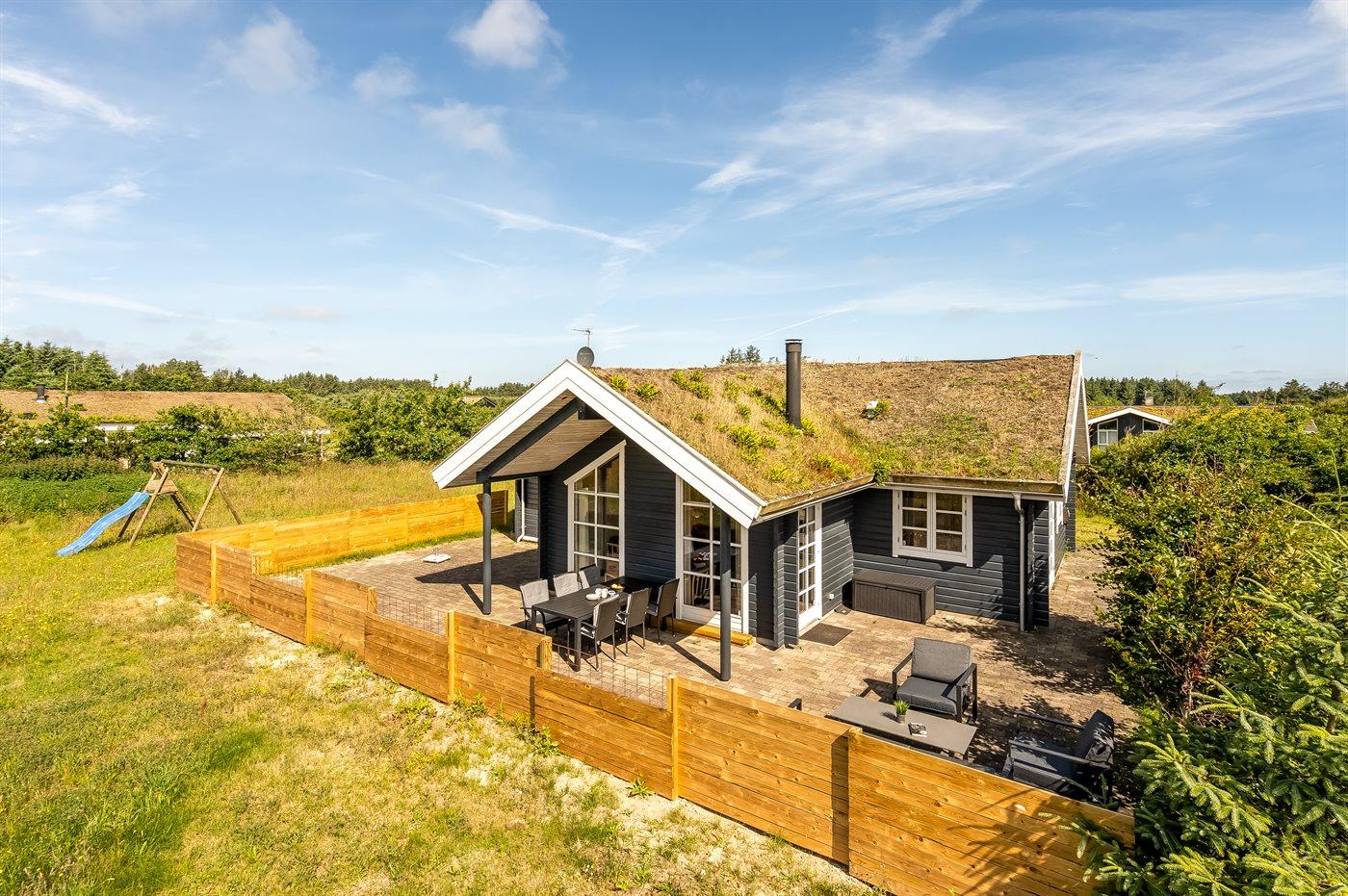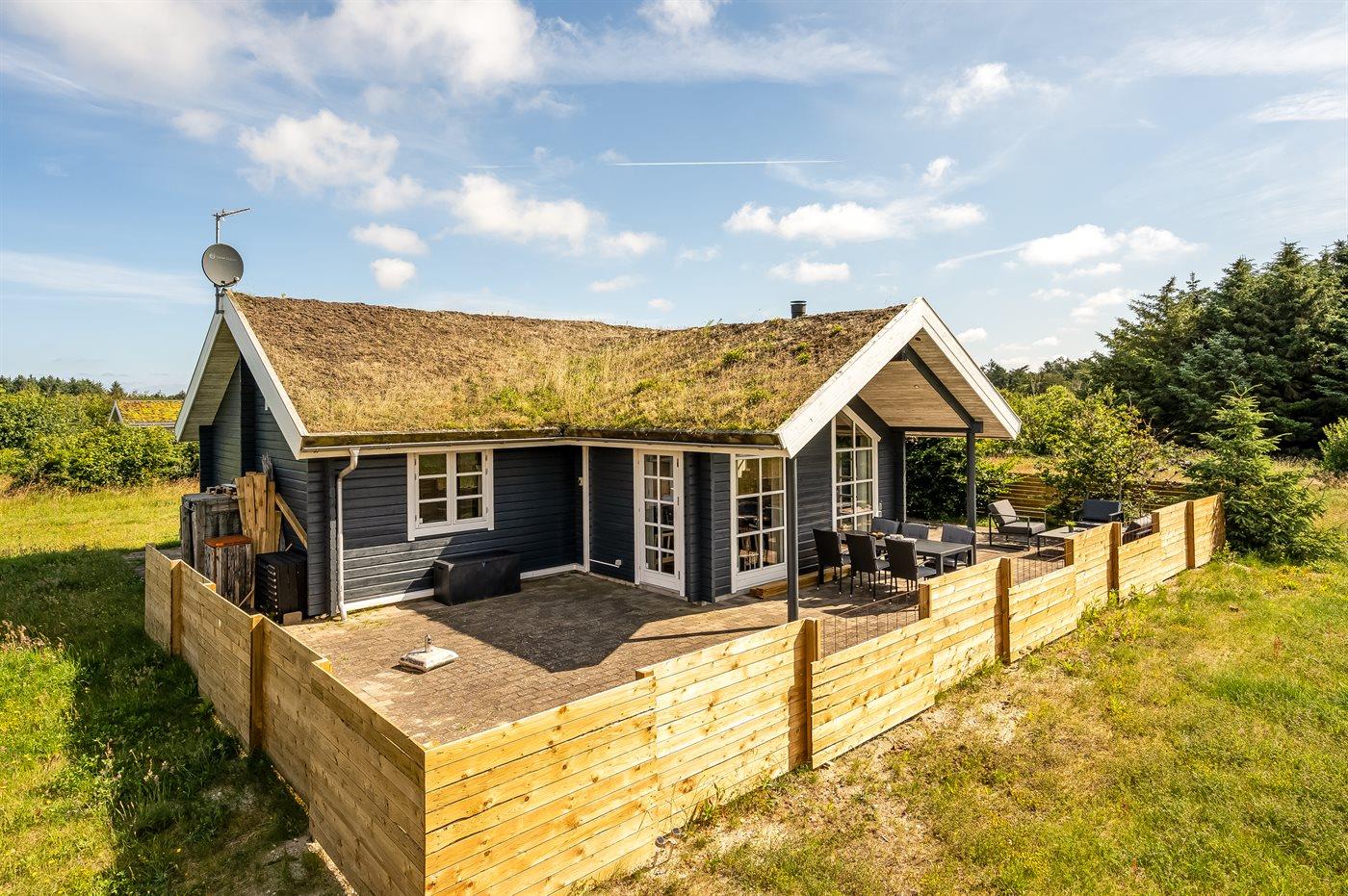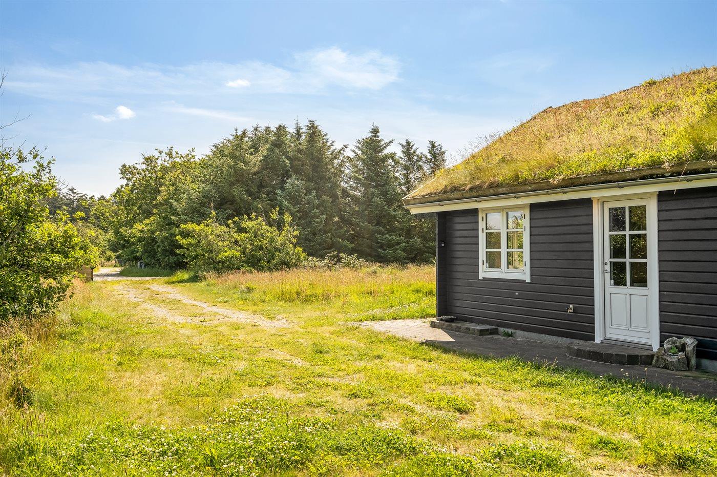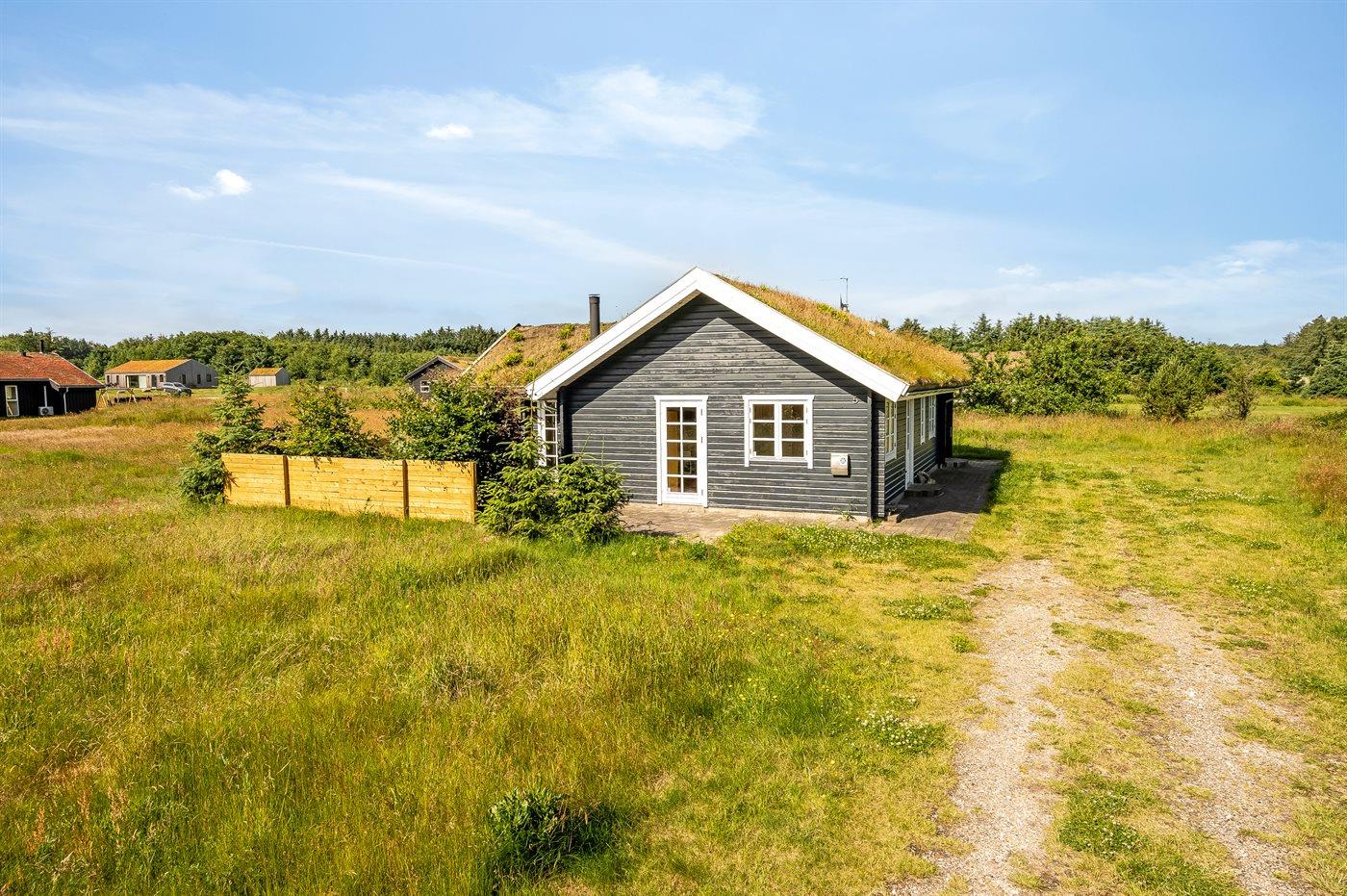 Hyggeligt træsommerhus med græs på taget og naturgrund i Saltum, perfekt til en afslappende ferie.