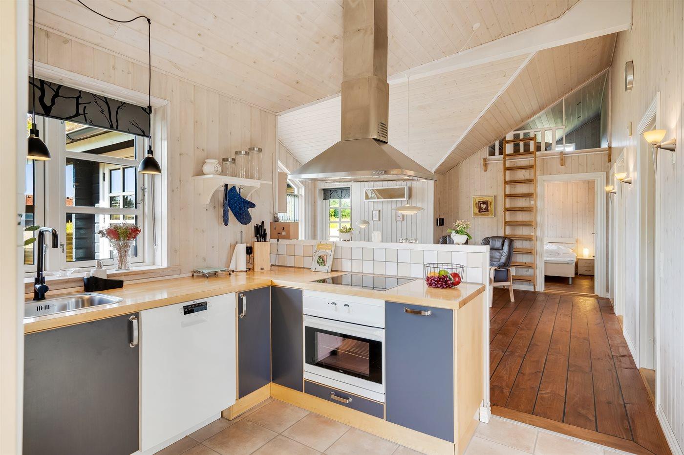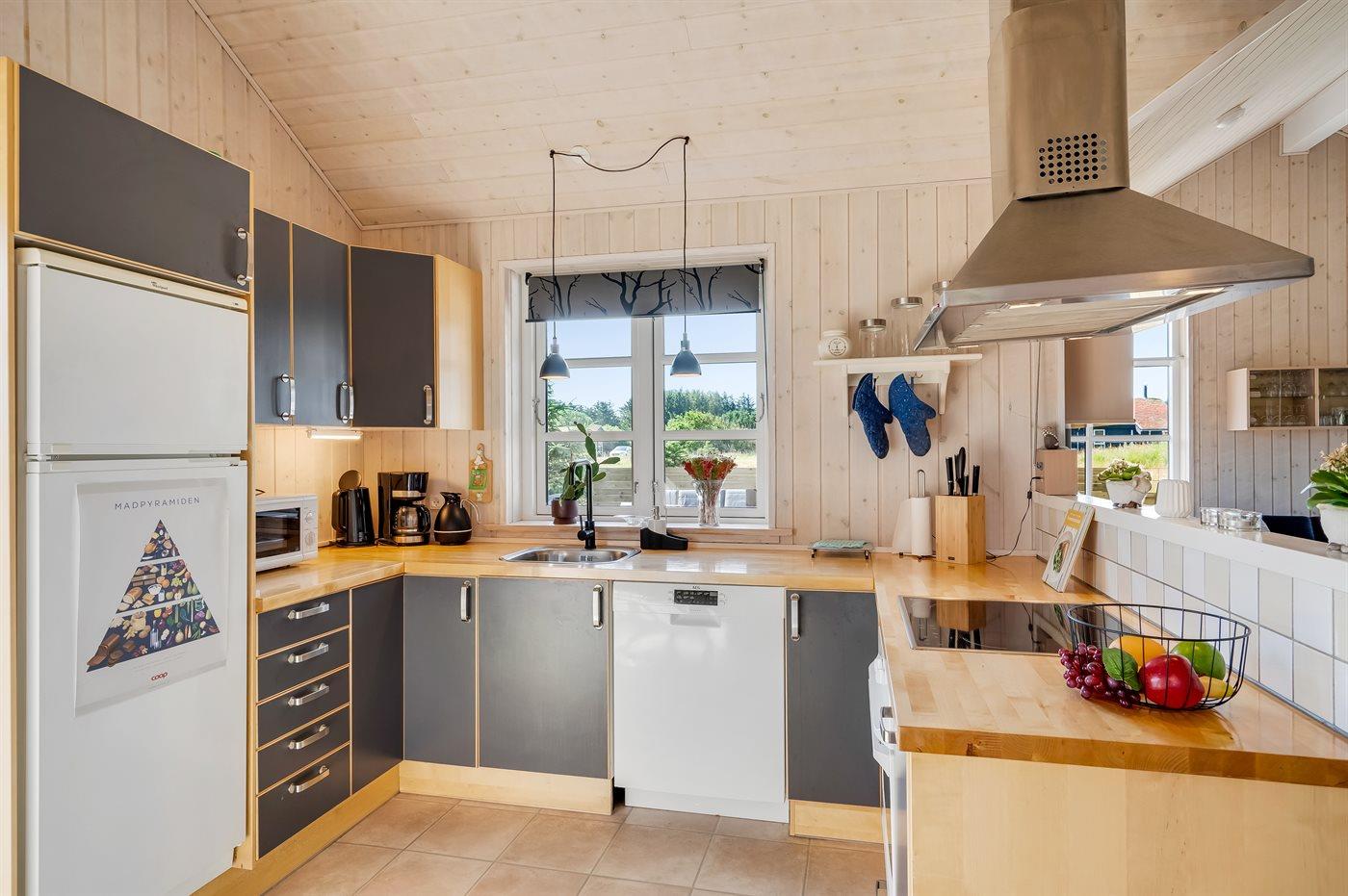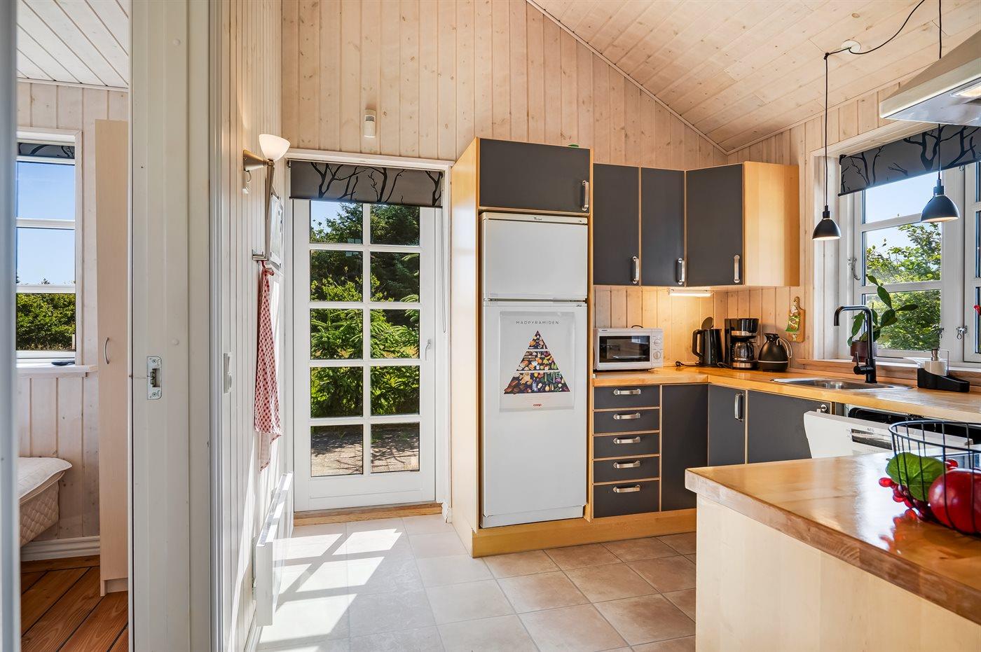 Køkkenet er udstyret med 1 køleskab. Der er 4 keramiske kogeplader, varmluftovn, mikrobølgeovn samt opvaskemaskine.