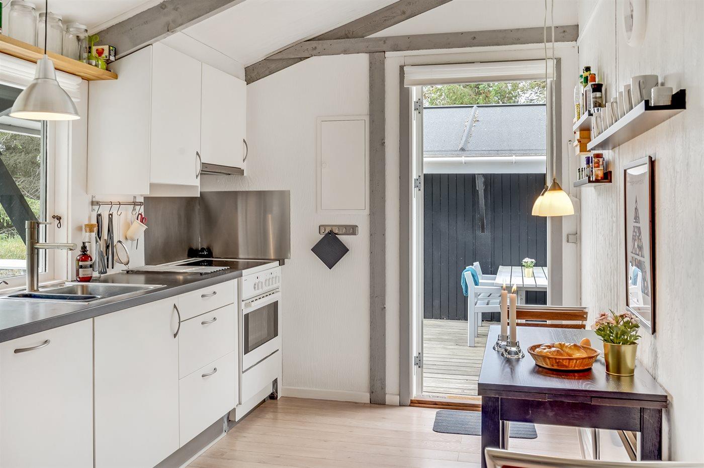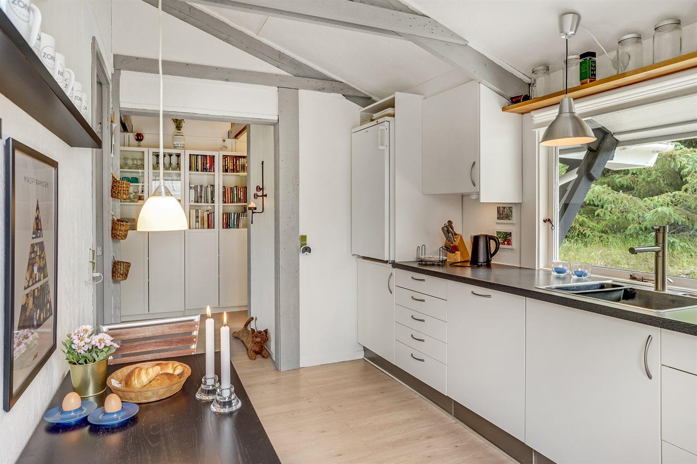 Køkkenet er udstyret med 1 køleskab. Der er 4 keramiske kogeplader, varmluftovn samt opvaskemaskine.
