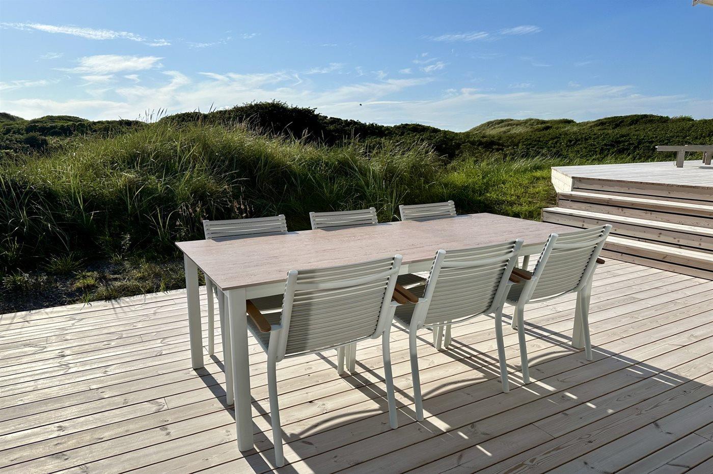Udendørs venter store, solrige terrasser på begge sider af huset. Her kan I nyde dagens måltider, lytte til havets brusen og opleve de betagende solnedgange over Vesterhavet – en oplevelse, man aldrig bliver træt af.