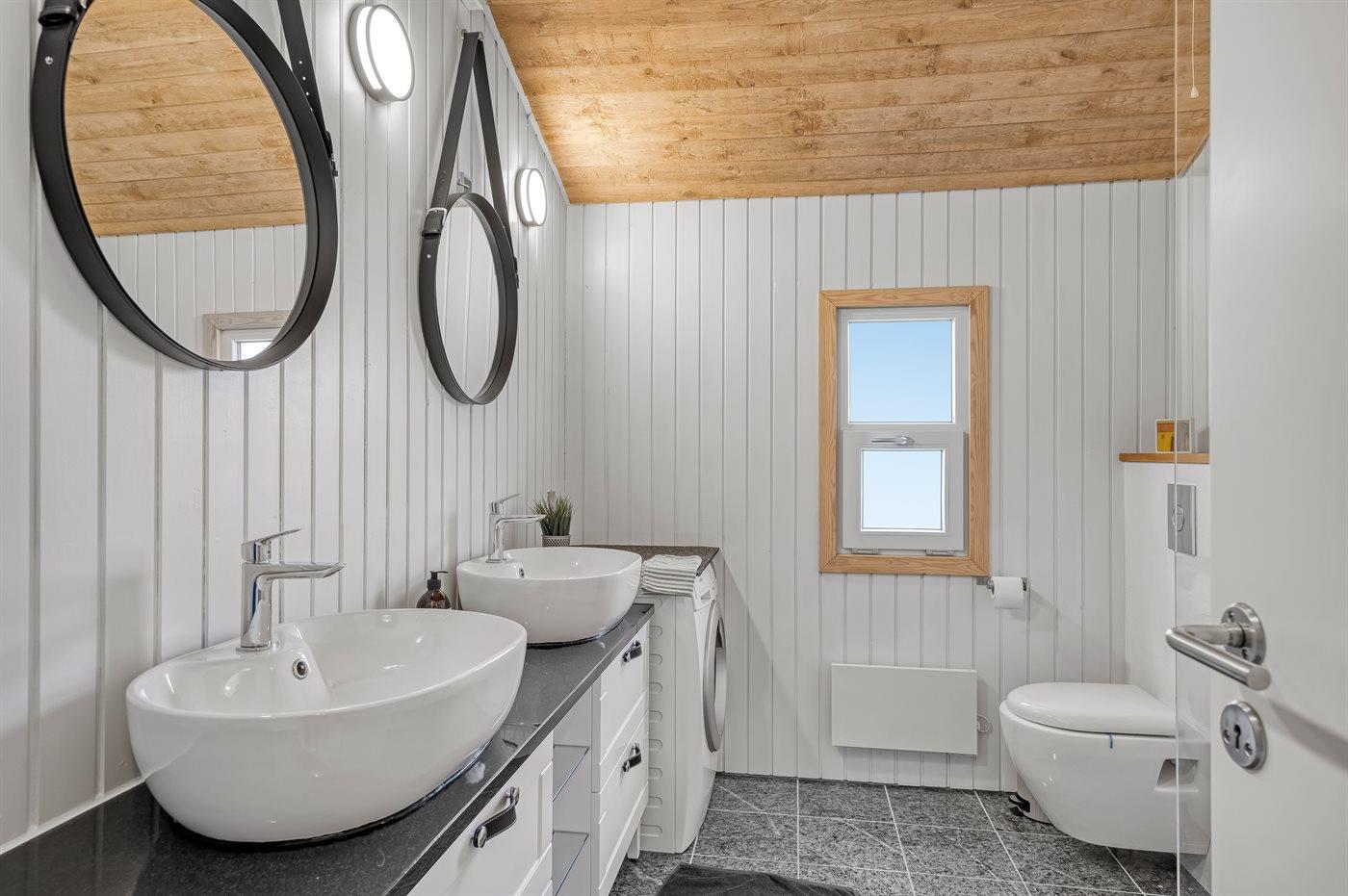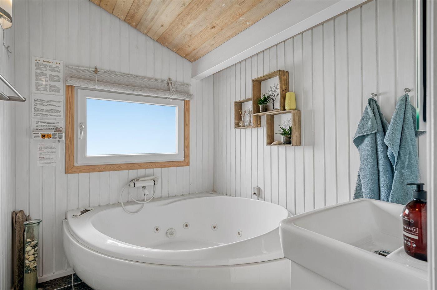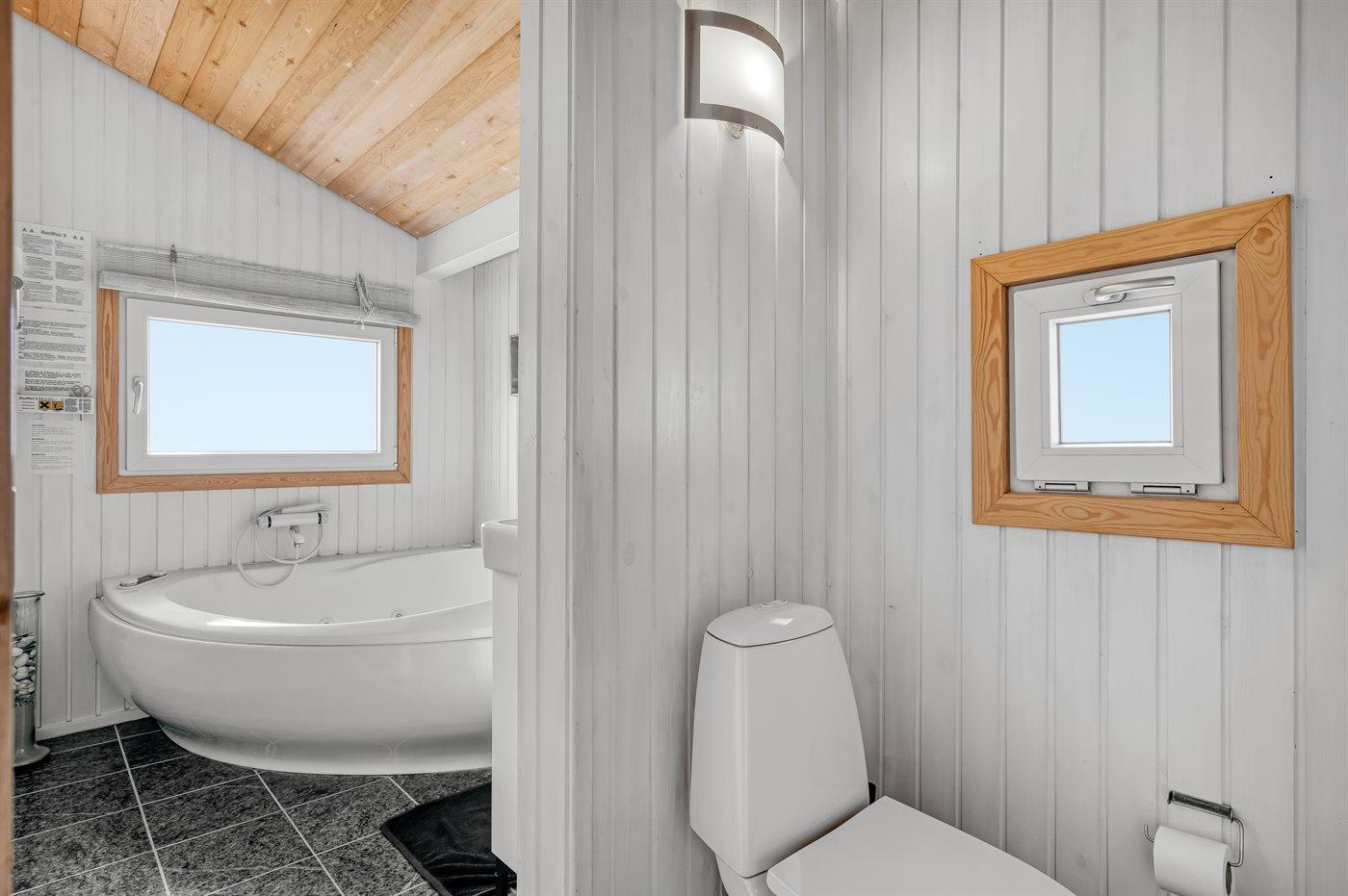 Der er 2 badeværelser. Det ene med bruseniche og det andet med spabad og tilhørende bruser. 2 toiletter. Der er gulvvarme på 2 badeværelser. I saunaen er der mulighed for afslapning.