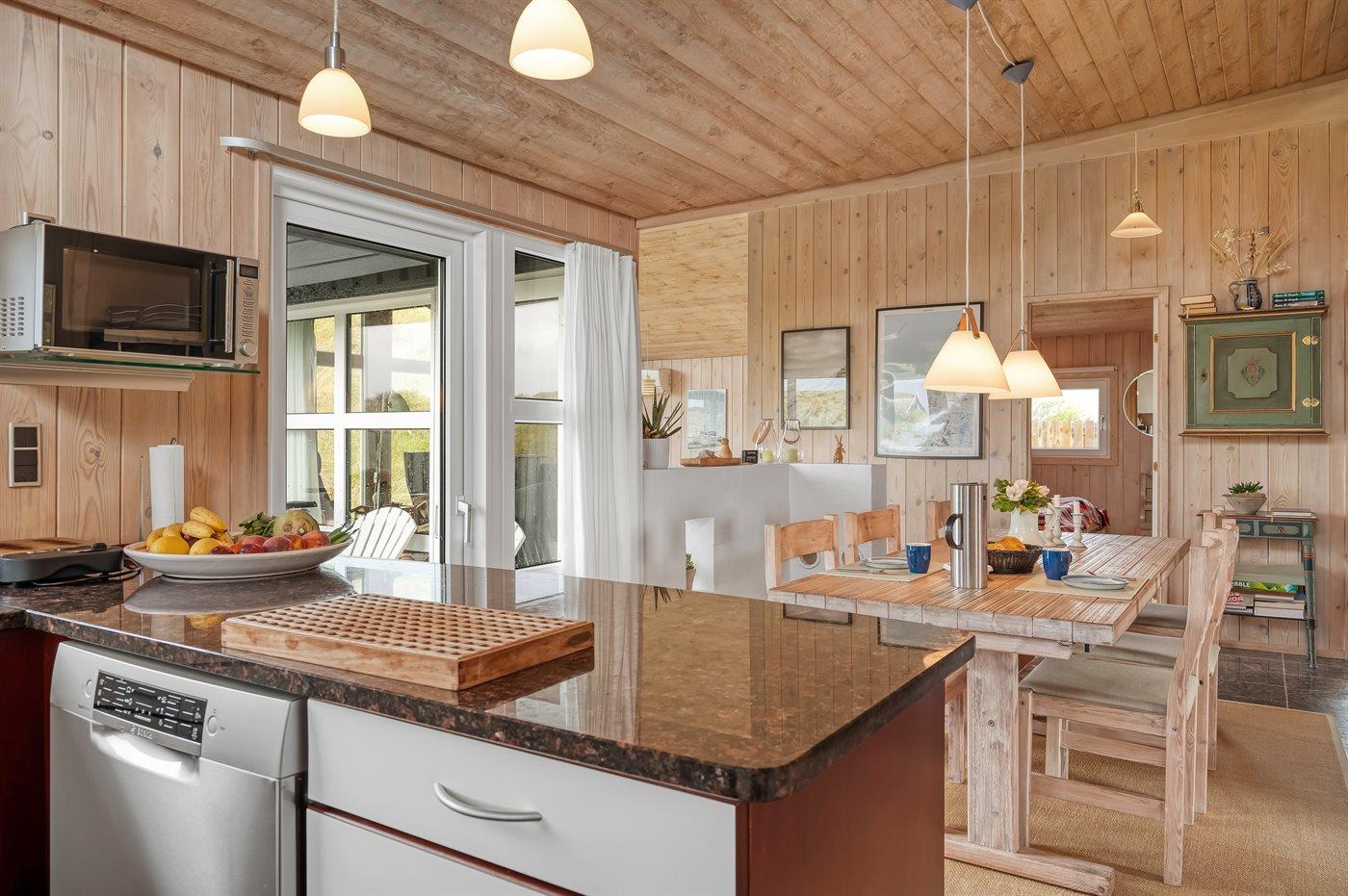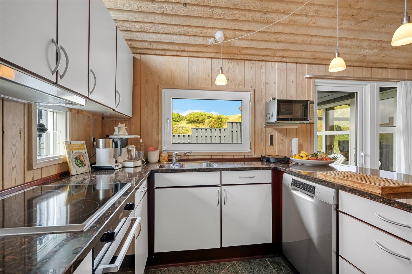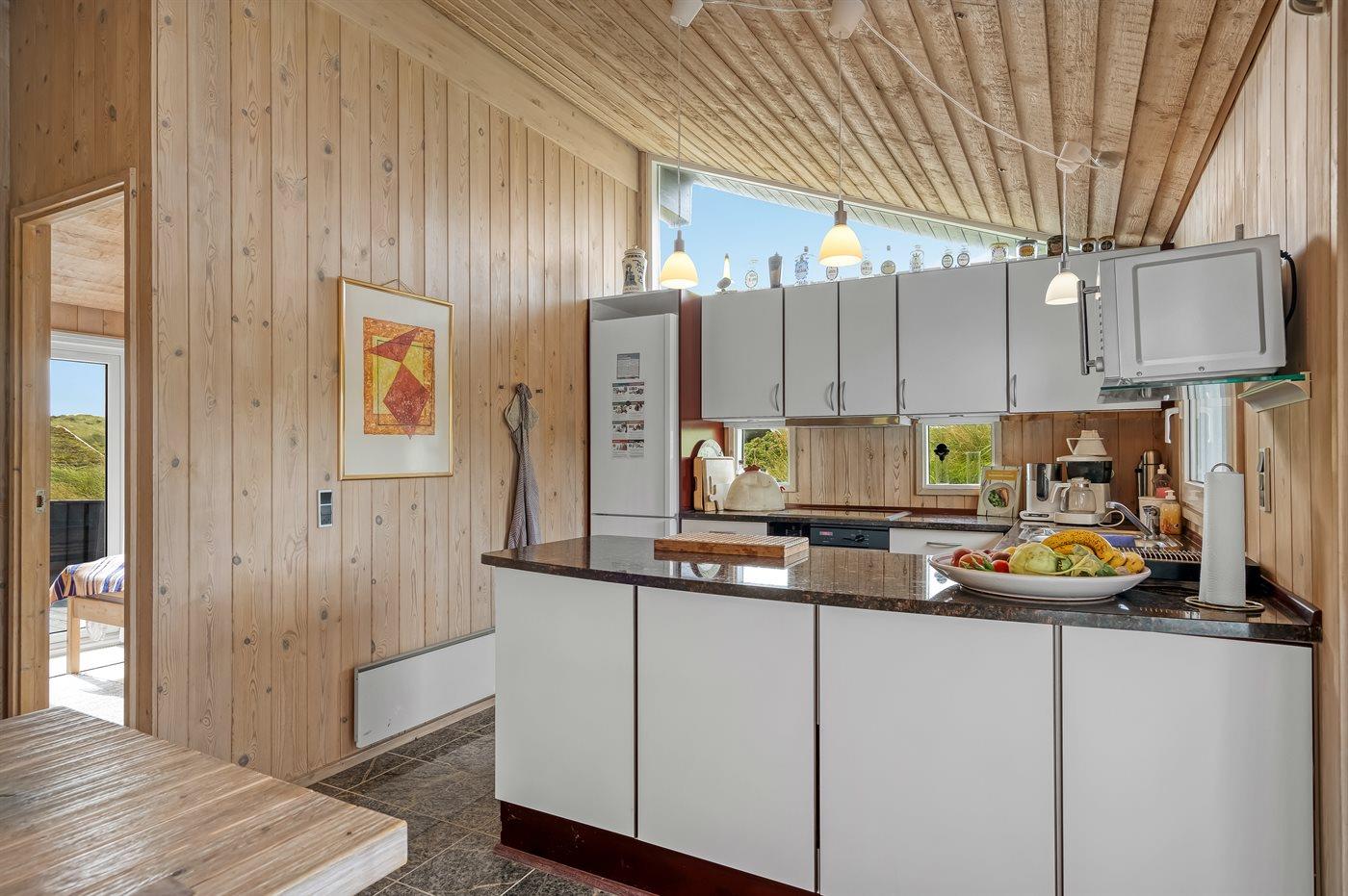 Køkkenet er udstyret med 1 køleskab. Der er 4 keramiske kogeplader, varmluftovn, mikrobølgeovn samt opvaskemaskine Der er gulvvarme i køkkenet.