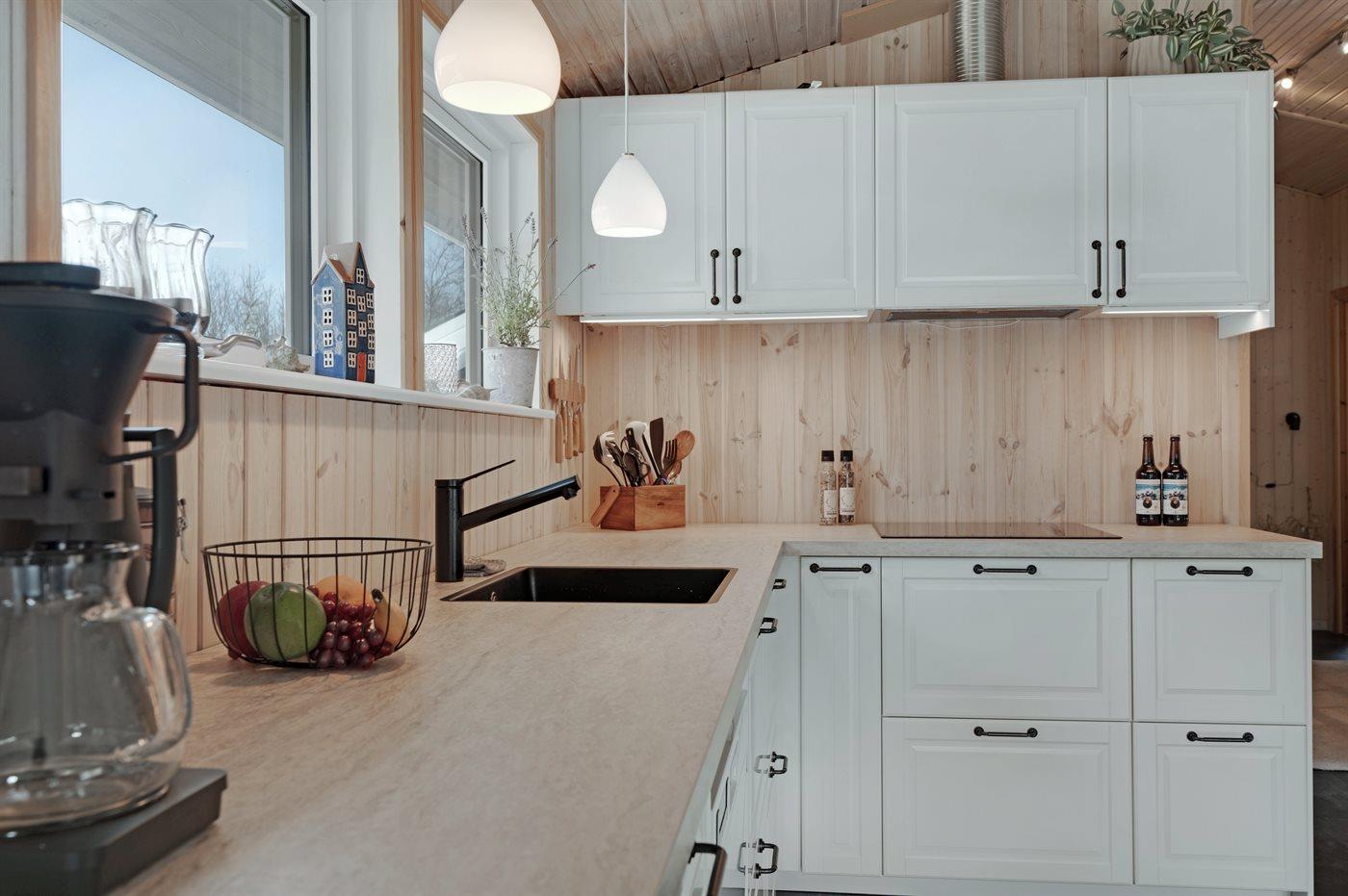 Køkkenet er udstyret med 1 køleskab. Der er 4 keramiske kogeplader, varmluftovn, mikrobølgeovn samt opvaskemaskine.