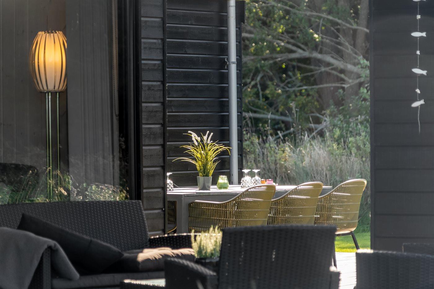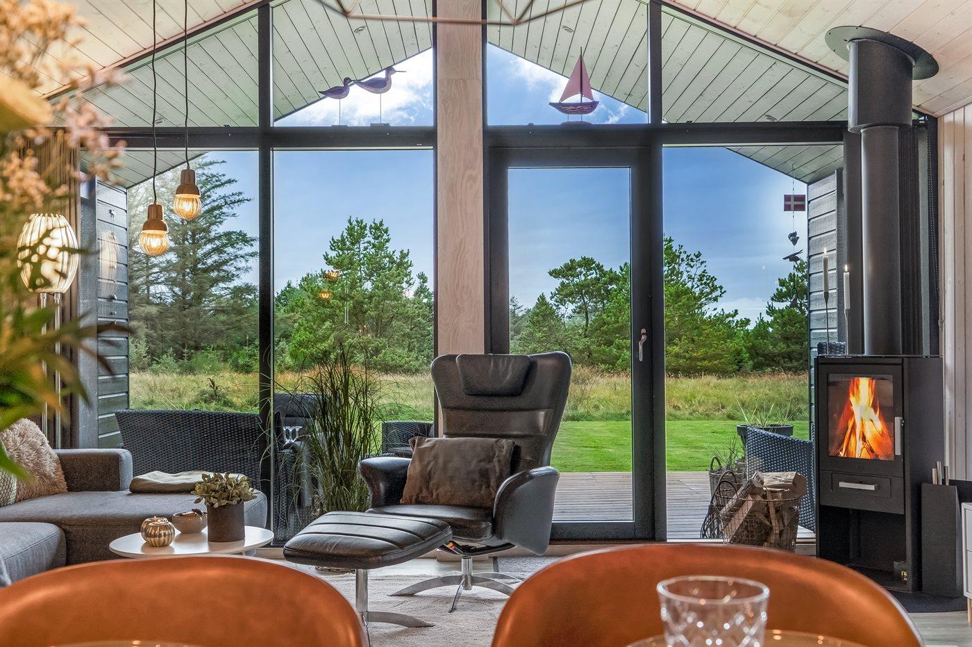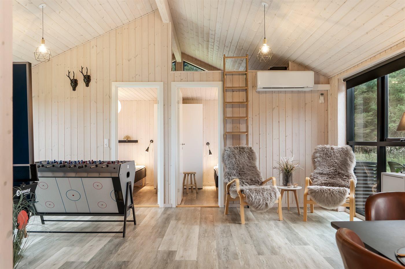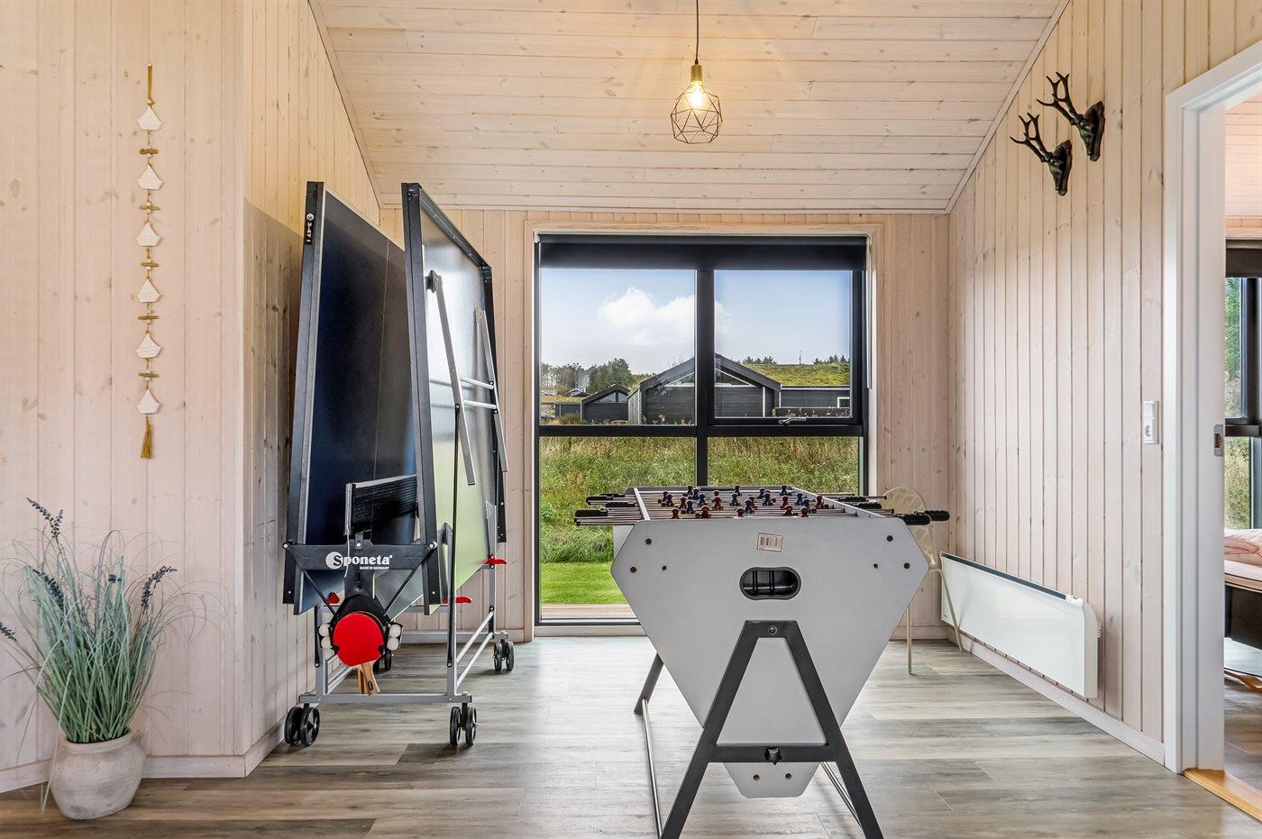 Moderne sommerhus med spa, aktivitetsrum og stor naturgrund nær stranden.