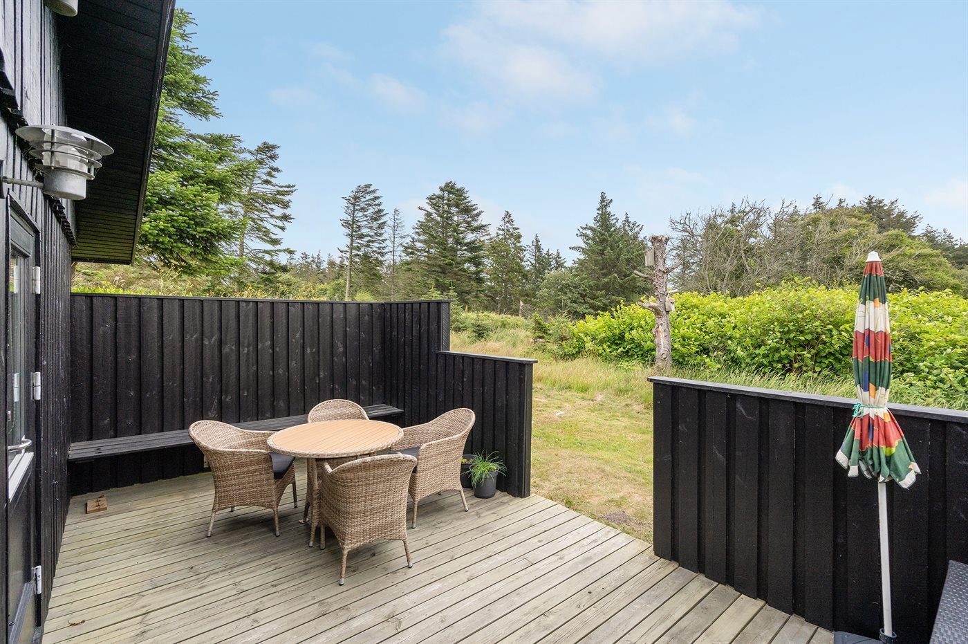 Ferieboligen er beliggende på en 2050 m² stor naturgrund. Der er 1300 m til havet. Nærmeste forretning er beliggende i en afstand af 700 m. Til ferieboligen hører 40 m² terrasseareal – heraf er i alt 20 m² lukket. Shelter. Grill til rådighed. Parkering ved ferieboligen.