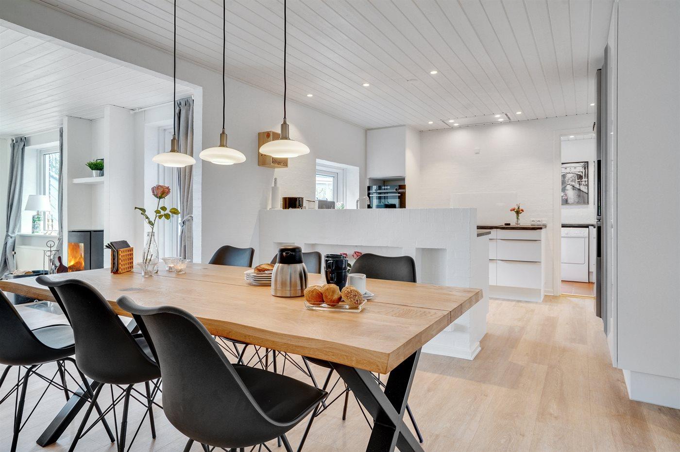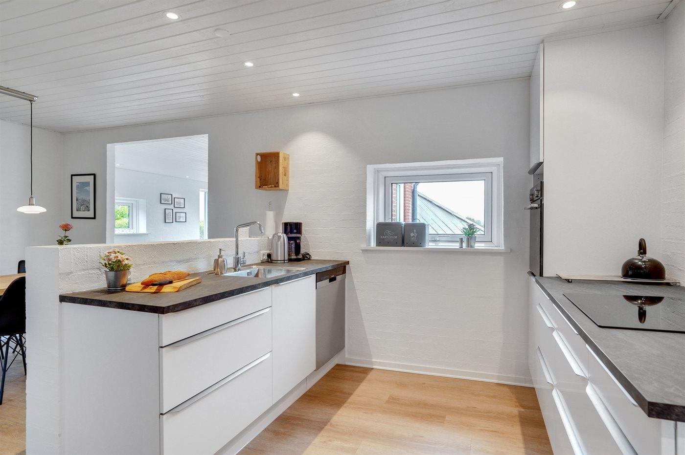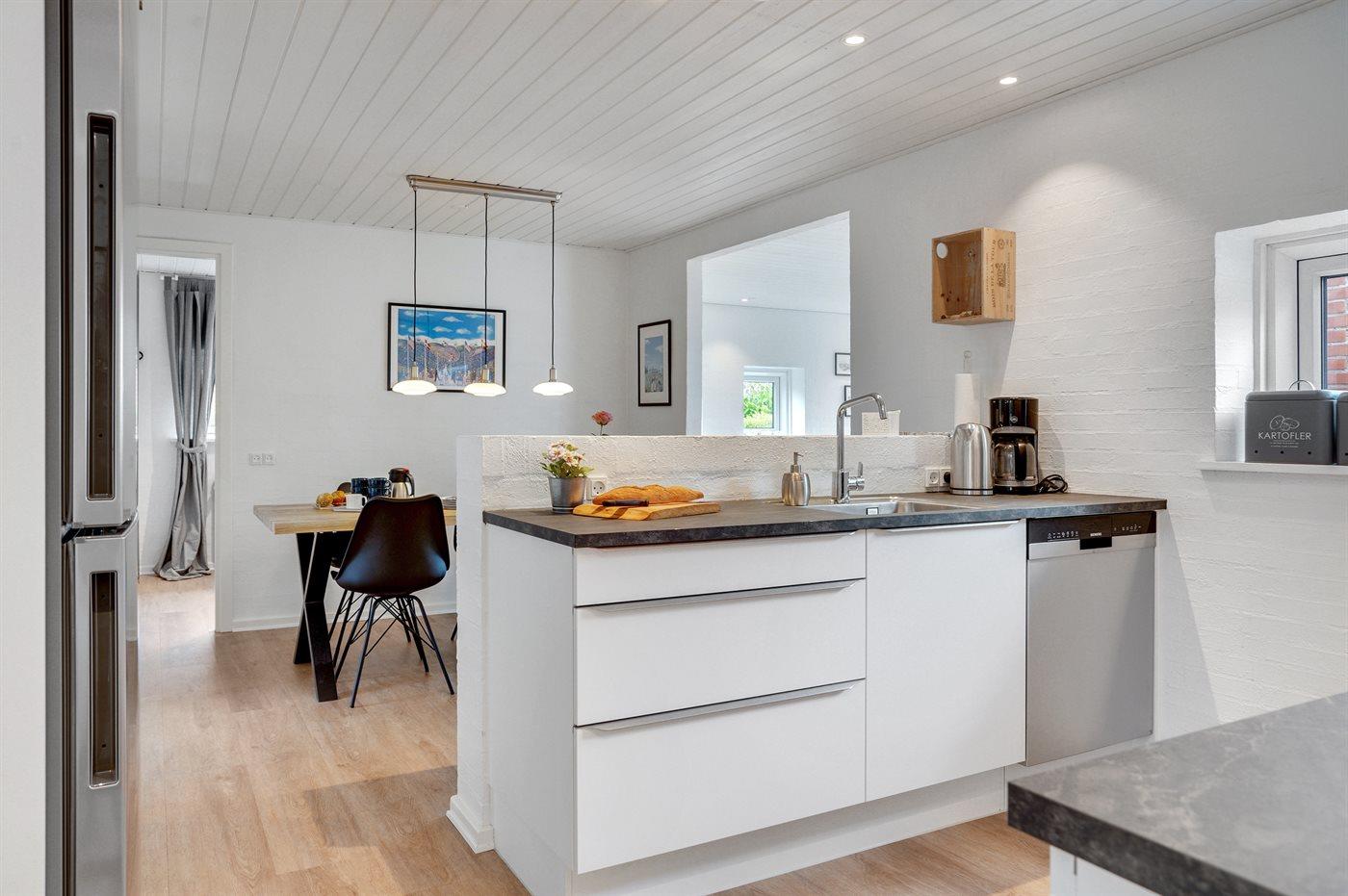 Køkkenet er udstyret med 1 køleskab. Der er 4 induktionskogeplader, varmluftovn, mikrobølgeovn samt opvaskemaskine.
