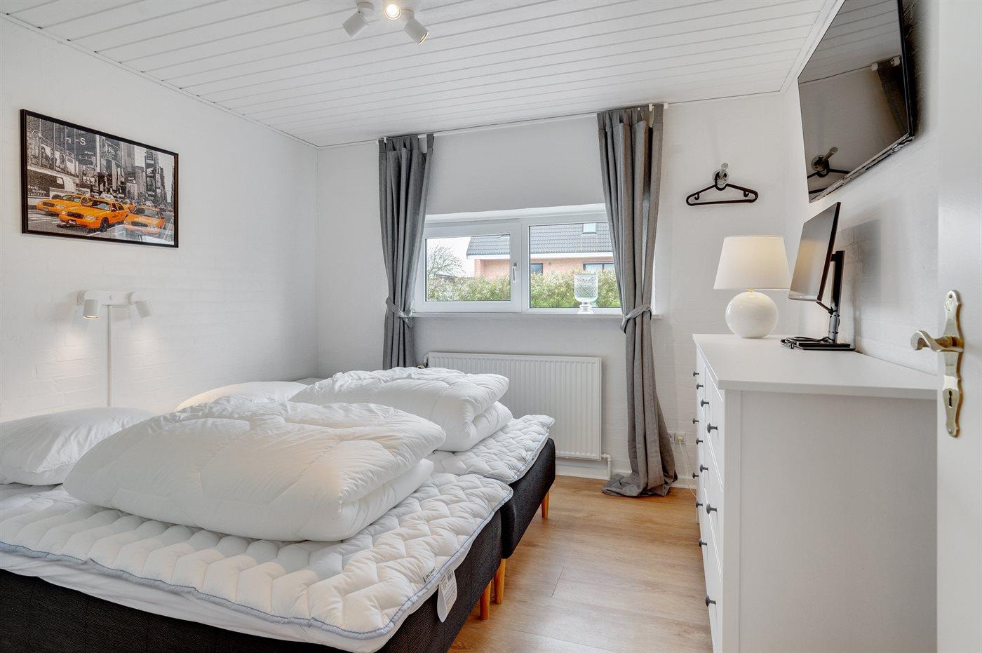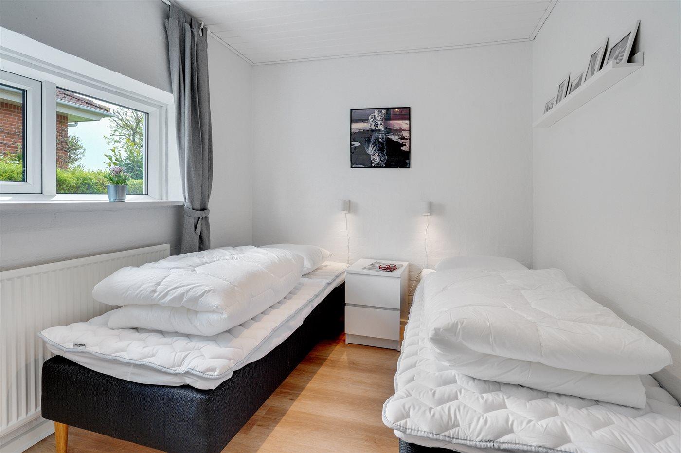 Der er i alt 3 soveværelser. Sovepladserne fordeler sig på: 4 sovepladser i dobbeltsenge. 2 sovepladser i enkeltsenge. Derudover er der 1 stk. barneseng.