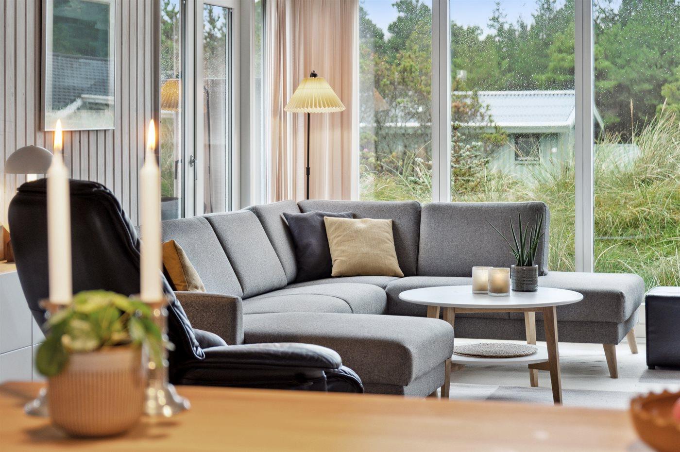 Sommerhuset er godt indrettet blandt andet med lys opholdsstue med stort glasparti. Der er store, skønne træterrasser til et hyggeligt udeliv.