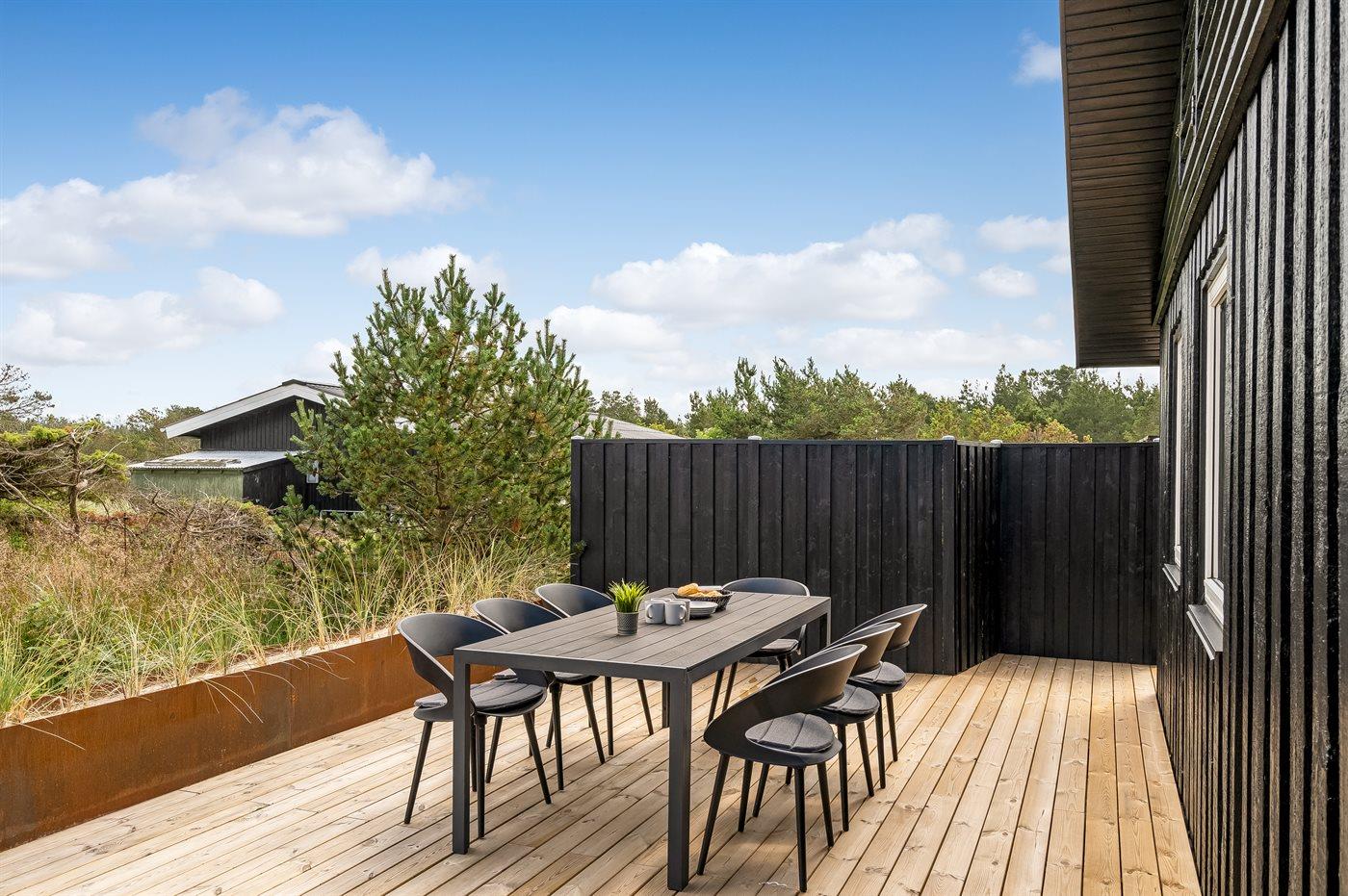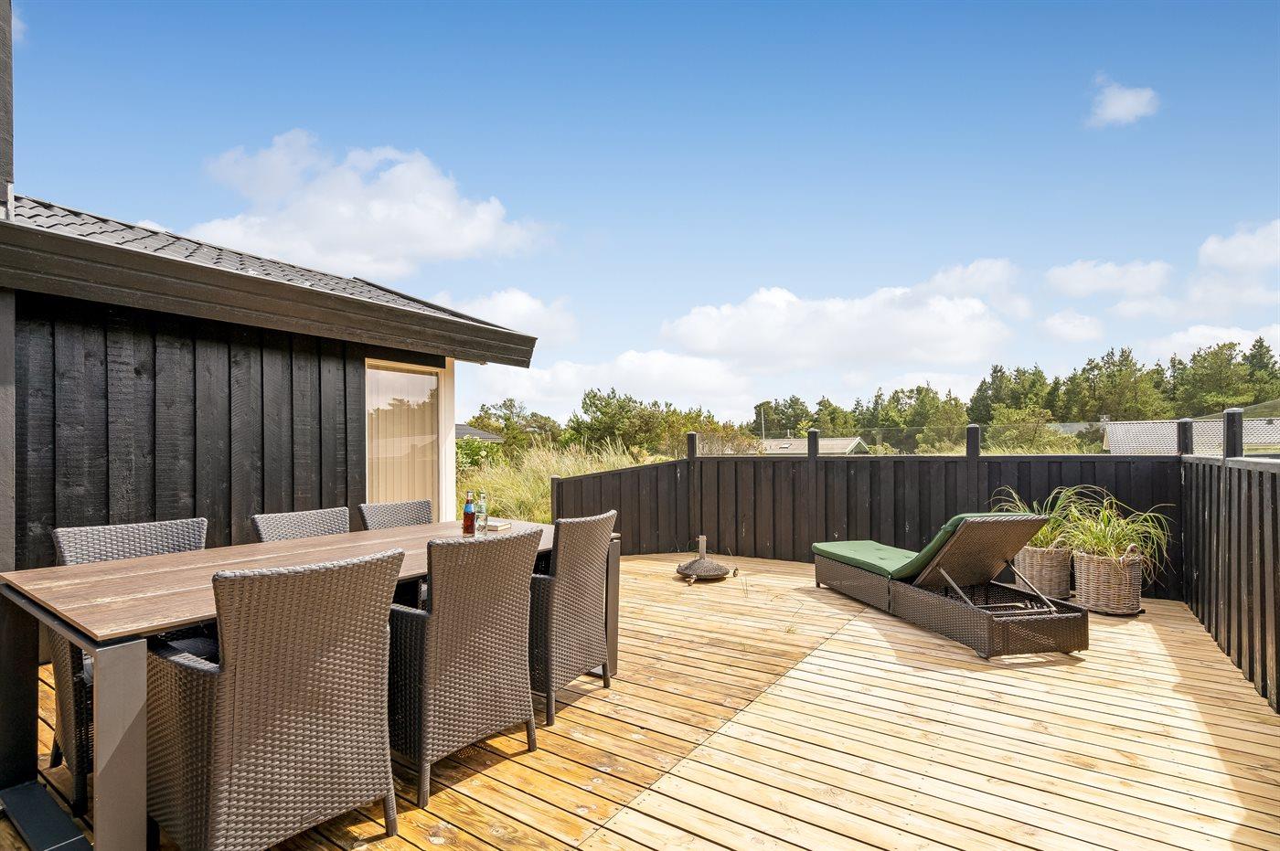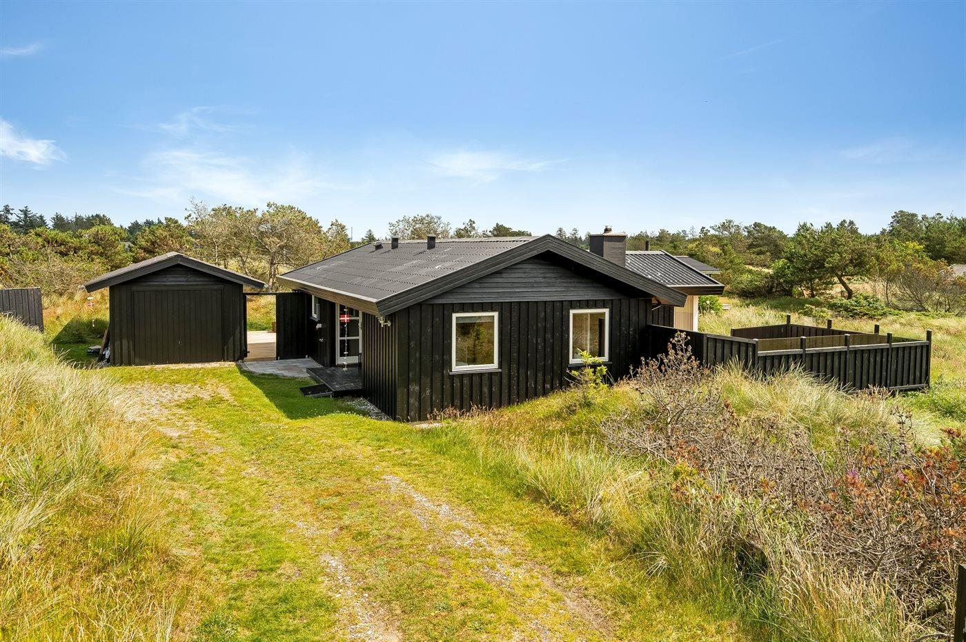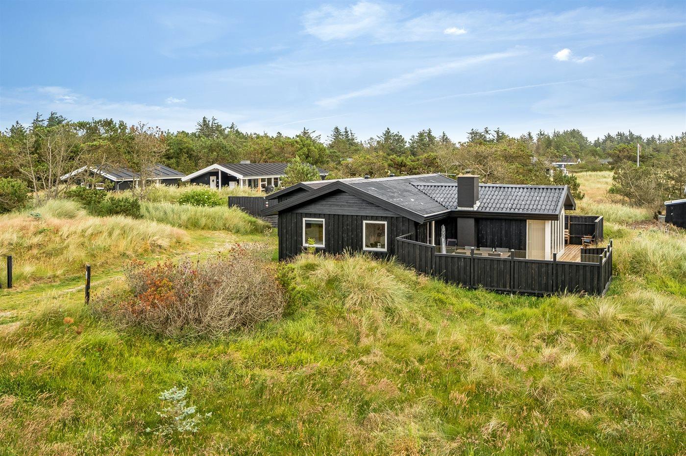 Hyggeligt sommerhus i Fårup Klitbakker med stor terrasse og naturgrund nær havet.