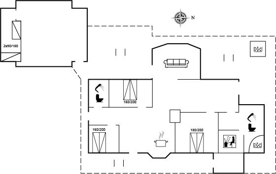 Der er i alt 4 soveværelser. Sovepladserne fordeler sig på: 6 sovepladser i dobbeltsenge. 4 sovepladser i enkeltsenge. 2 af disse sovepladser befinder sig i et anneks og 2 af dem befinder sig på hemsen. Derudover er der 1 stk. barneseng.