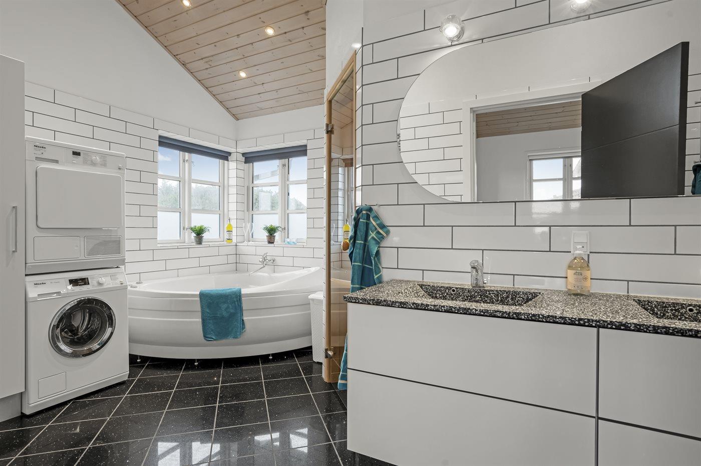 Der er 2 badeværelser med bruseniche og 2 toiletter. Der er gulvvarme på 2 badeværelser. I saunaen er der mulighed for afslapning.