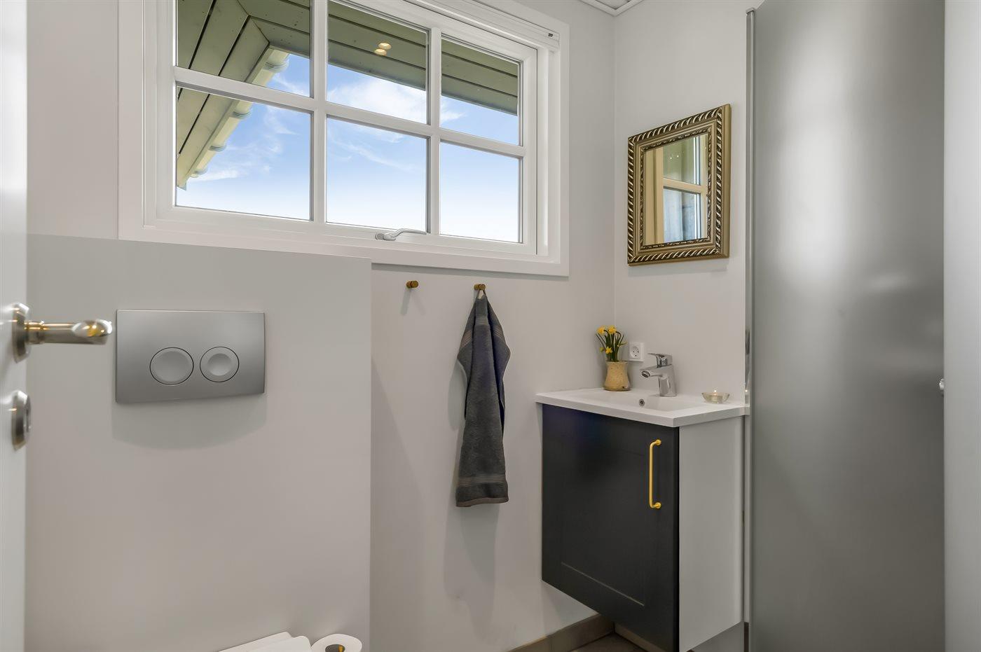 Der er 1 badeværelse med bruseniche og 2 toiletter, heraf 1 gæstetoilet. Der er gulvvarme på 1 badeværelse. Der er gulvvarme på gæstetoilettet. I den infrarøde sauna er der mulighed for afslapning.