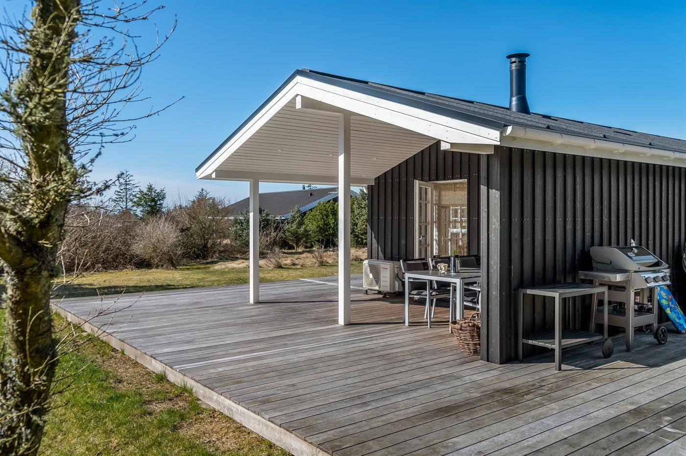 Huset fremstår utrolig indbydende og indrettet med fokus på kvalitet og funktionalitet. Den store træterrasse er et perfekt samlingspunkt for både afslapning og hyggelige stunder med familie og venner. En del af terrassen er overdækket, hvilket gør det muligt at nyde udendørslivet - uanset vejret. Der er også en dejlig udebruser, som giver en forfriskende oplevelse på de varme sommerdage.
