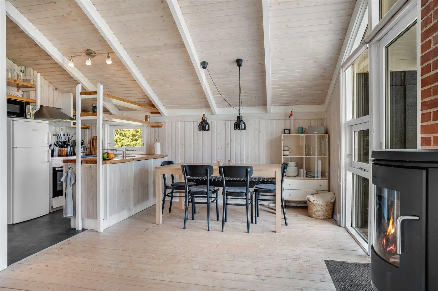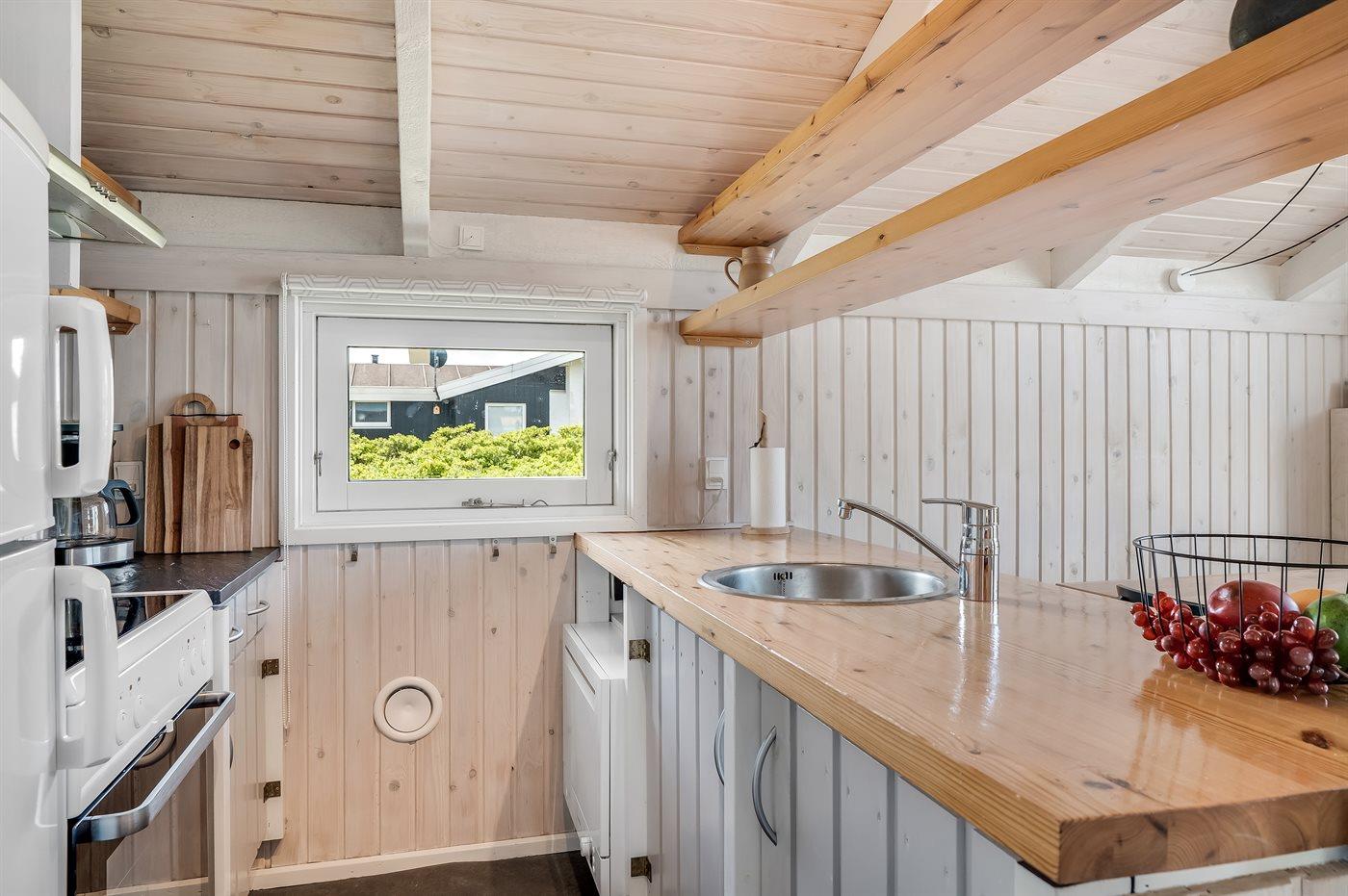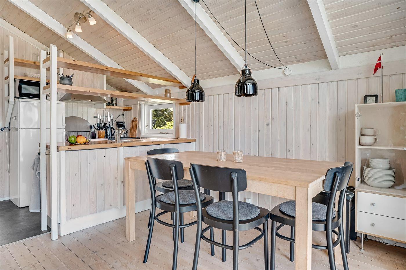 Køkkenet er udstyret med 1 køleskab. Der er 4 keramiske kogeplader, varmluftovn, mikrobølgeovn samt opvaskemaskine.