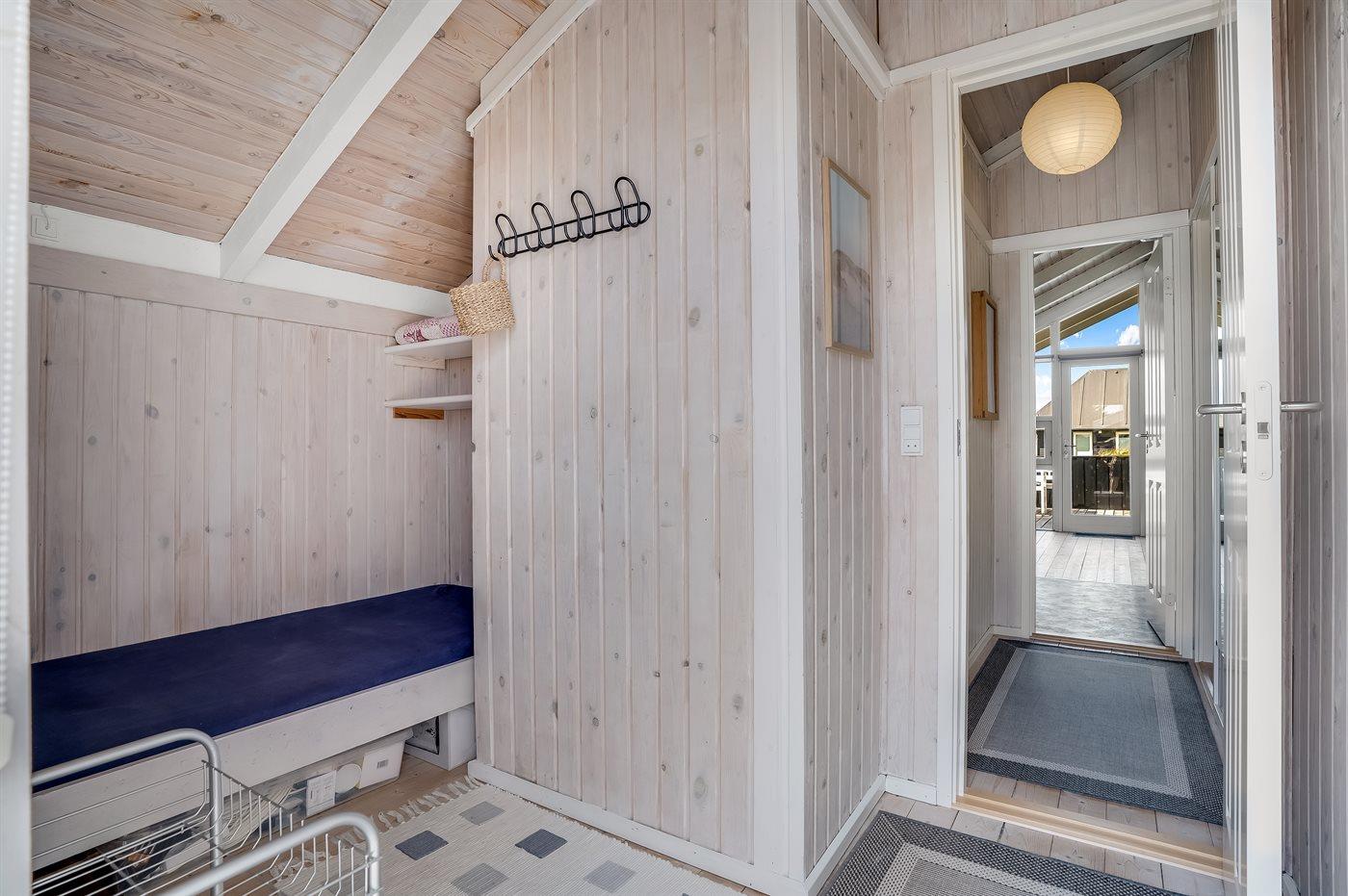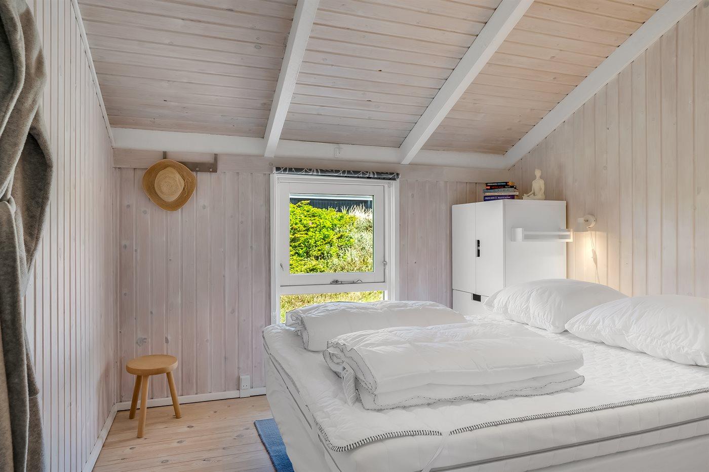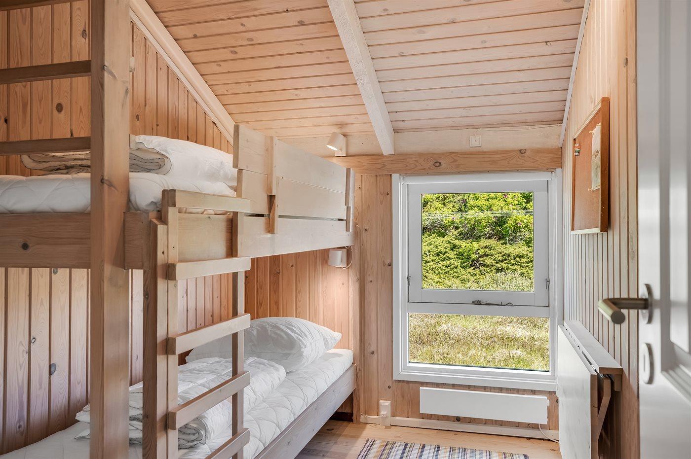 Der er i alt 2 soveværelser. Sovepladserne fordeler sig på: 2 sovepladser i dobbeltseng. 1 soveplads i enkeltseng. 2 sovepladser i køjeseng. 1 af disse sovepladser befinder sig i entréen.