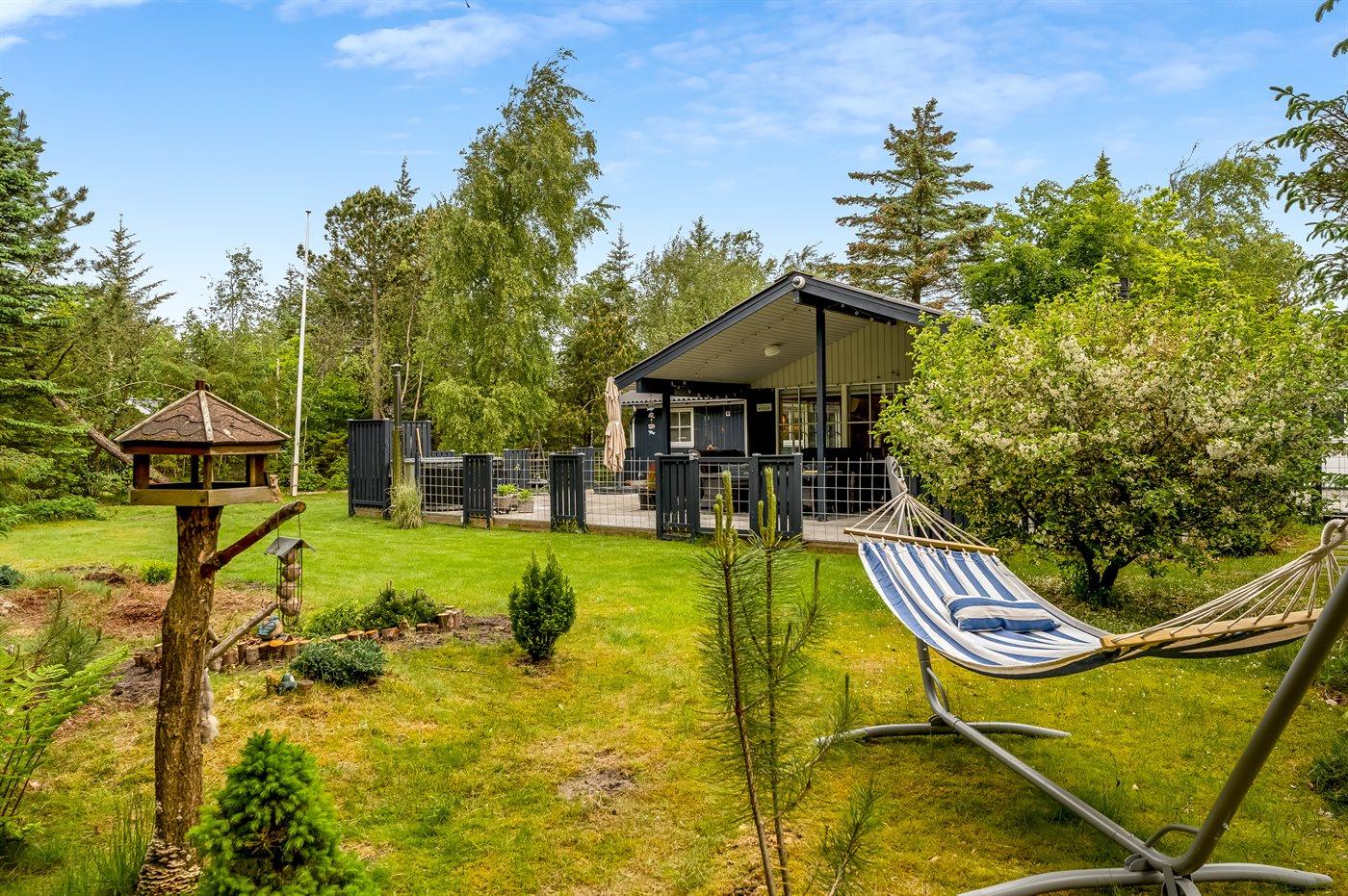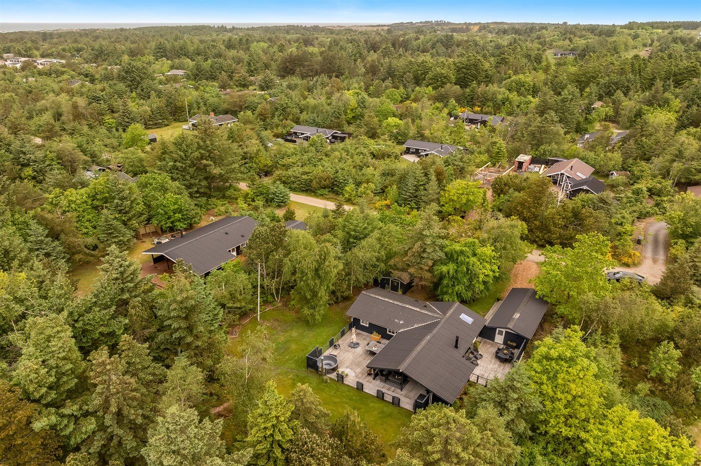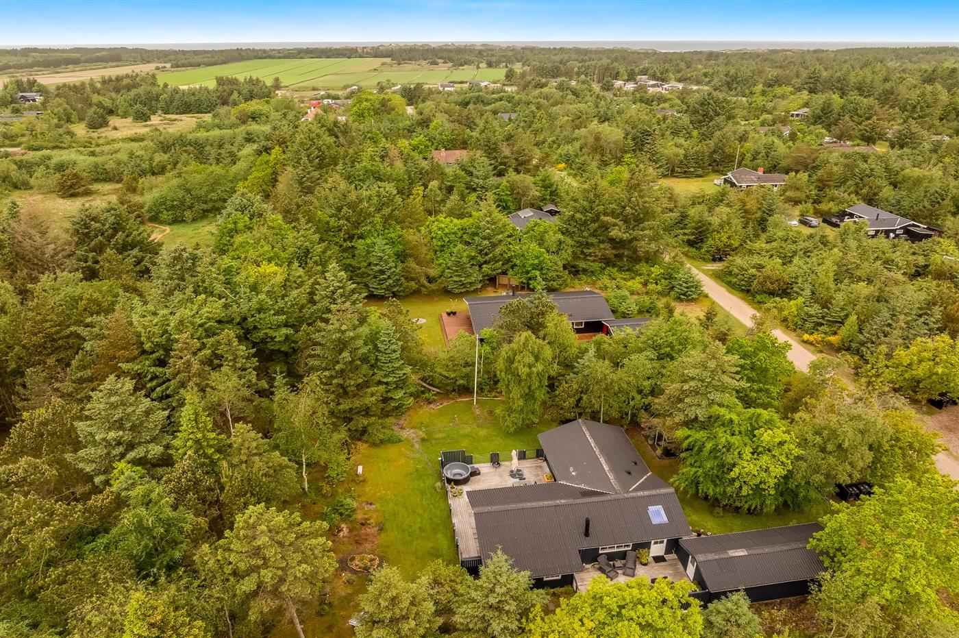Ferieboligen er beliggende på en 1500 m² stor naturgrund. Der er 2000 m til havet. Nærmeste forretning er beliggende i en afstand af 4000 m. Der er en golfbane i en afstand af 7500 m. Til ferieboligen hører åbent terrasseareal. Desuden er der overdækket terrasse. Gynge. Legetårn. Grill til rådighed. Der er installeret stik til opladning af elbil. Parkering ved ferieboligen.