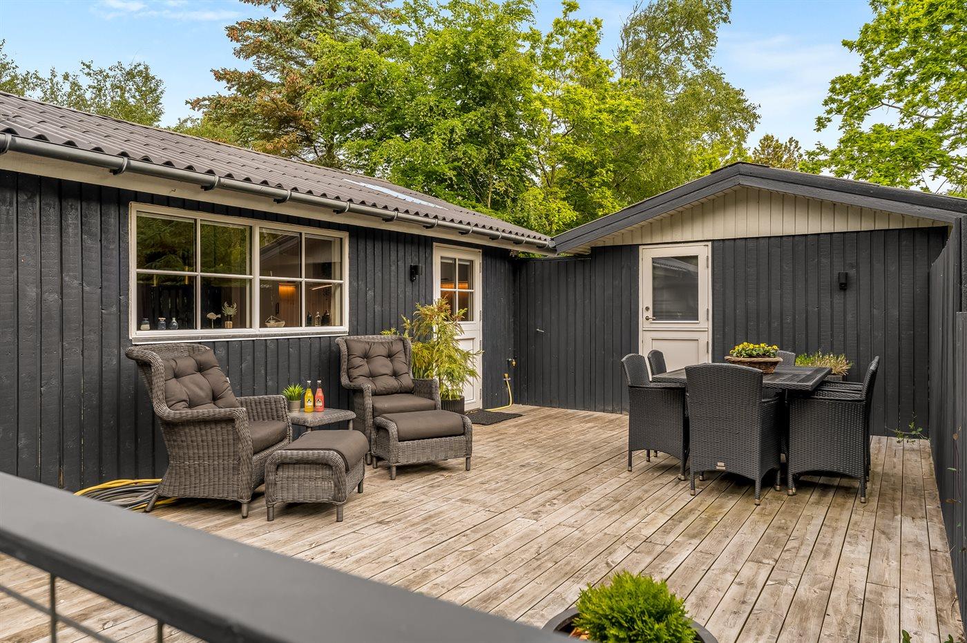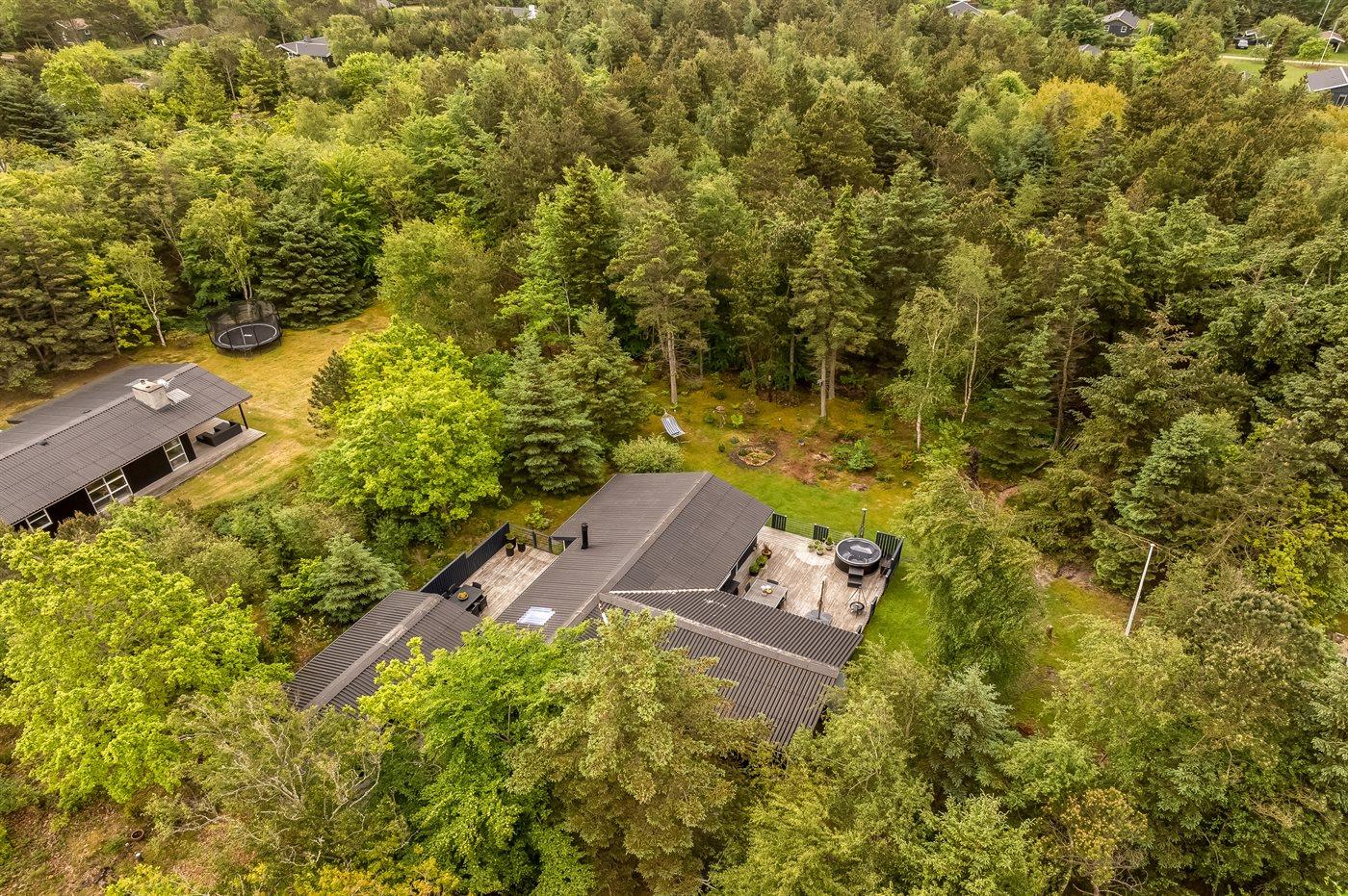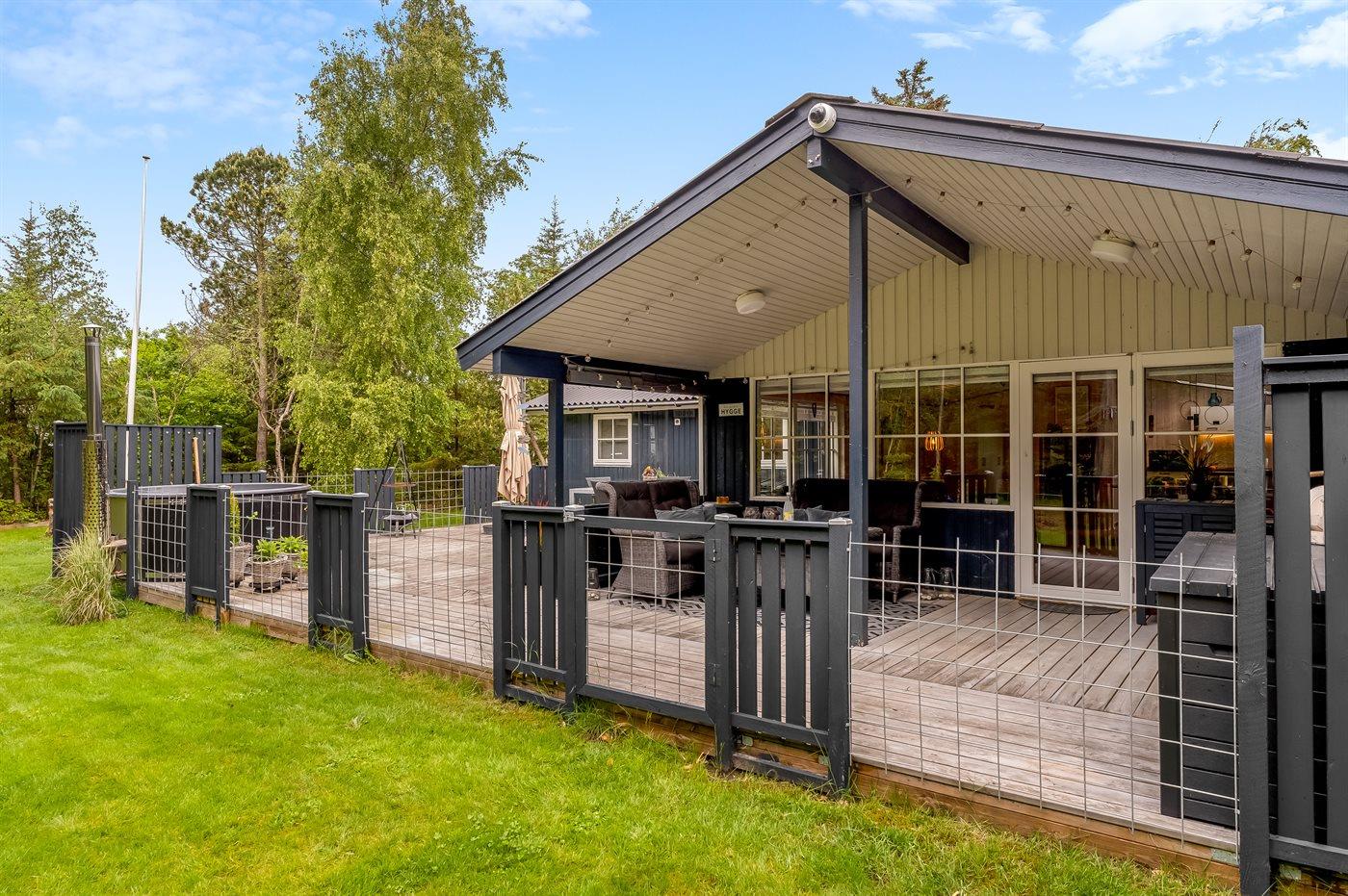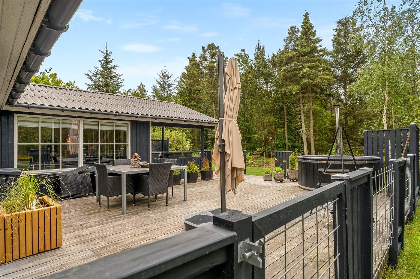 Omkring huset findes flere lækre terrasser, heriblandt en med vildmarkskar, hvor du kan nyde varme bade under åben himmel. Vildmarkskaret kan benyttes i perioden fra uge 14 til og med uge 42.