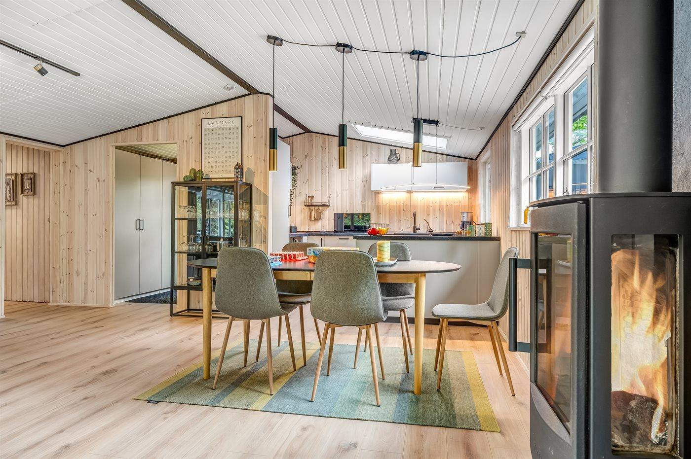 Indenfor mødes du af et lyst og indbydende sommerhus med et flot nyere køkken og en dejlig stue med loft til kip, som giver en luftig og rummelig atmosfære. Fra stuen er der direkte udgang til en skøn overdækket terrasse – perfekt til afslappende stunder og lange sommeraftener.